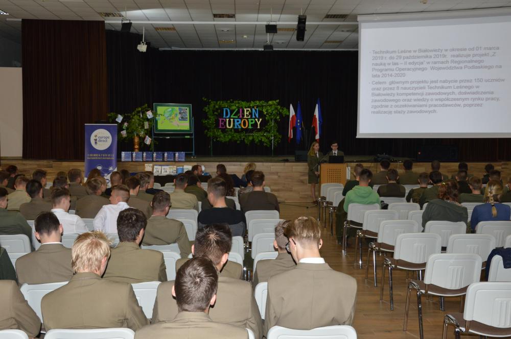 14 maja 2019r. odbyły się w naszej szkole obchody Dnia Europy. Uroczystość rozpoczęły uczennice klasy 3b Julia Brewka i Weronika Kiełbaszewska oraz Patrycja Gąsiewska z klasy 2b, które zaśpiewały „Odę do radości” – hymn Europy. Następnie pan Maciej Skindzier z Punktu Informacji Europejskiej EUROPE DIRECT w Białymstoku w bardzo interesujący sposób zapoznał młodzież z 15 latami Polski w Unii Europejskiej oraz uświadomił wagę oddania głosu w najbliższych wyborach do Parlamentu Europejskiego. Aleksandra Świć i Michał Borkowski z klasy 2b przedstawili prezentację na temat wykorzystania środków unijnych przez naszą szkołę. Pani Iweta Przygodzka przedstawiła wyniki konkursu Euroscola, w którym już po raz czwarty wygraliśmy główną nagrodę czyli wyjazd 20 uczniów i 2 nauczycieli do Strasburga na obrady Młodzieżowego Europarlamentu. Zaprezentowany został film oraz fotoreportaż przygotowany przez młodzież na konkurs.
