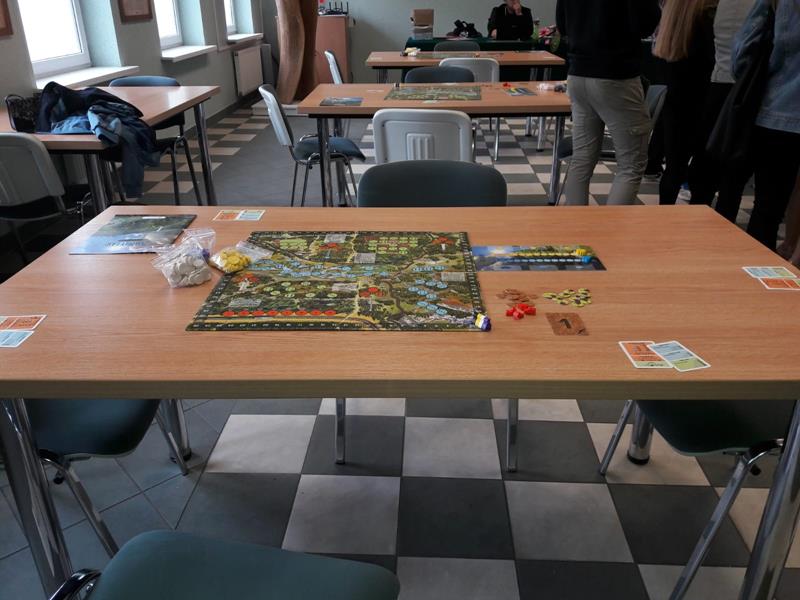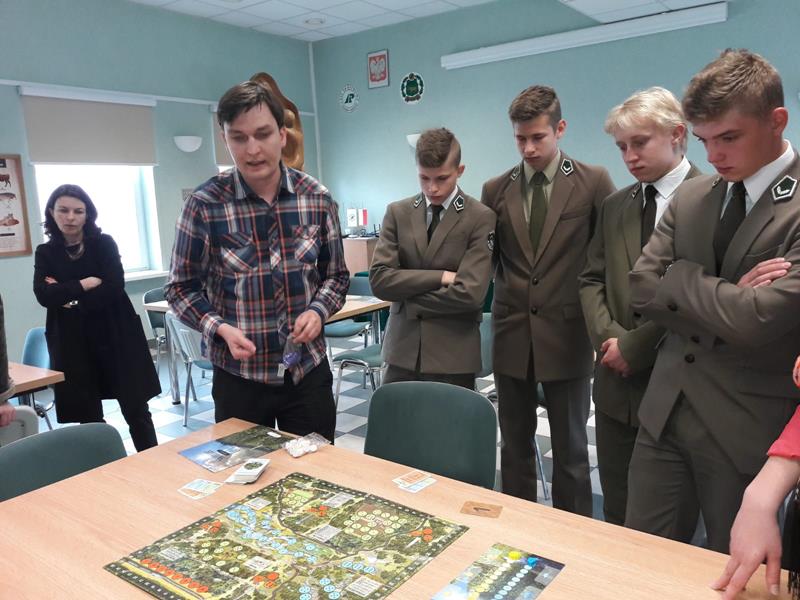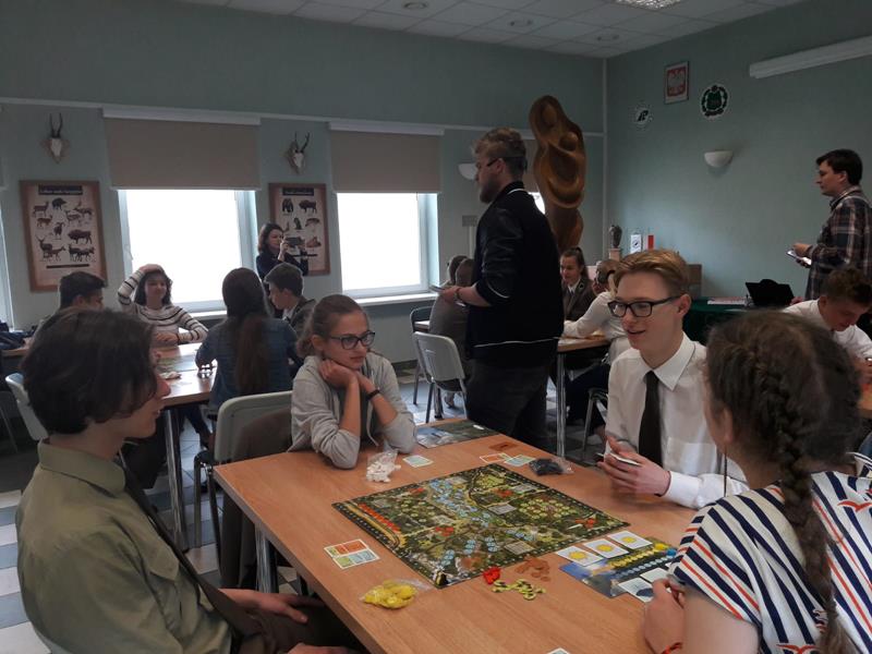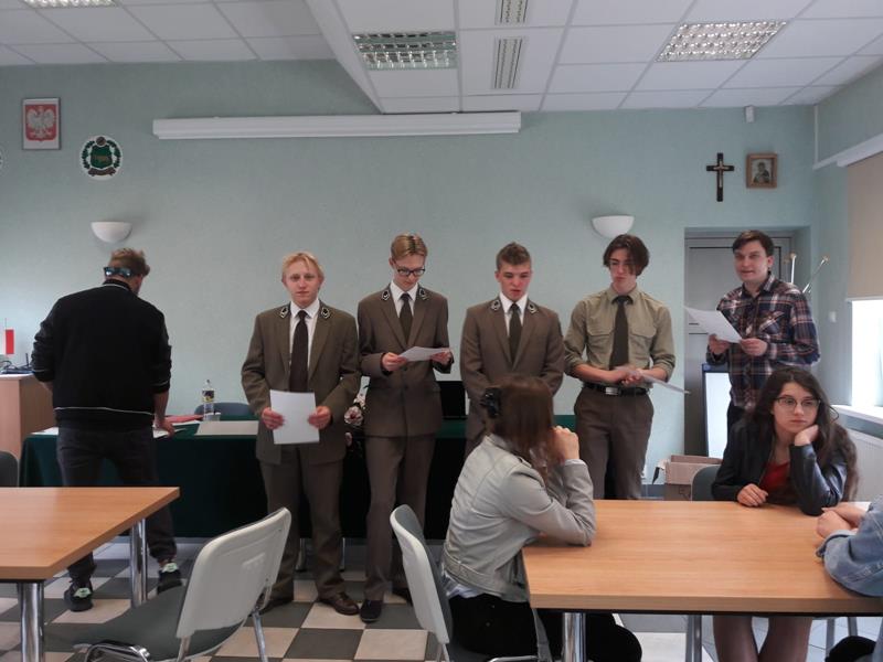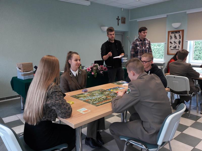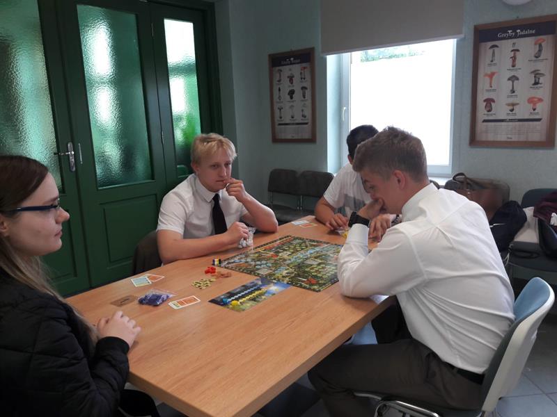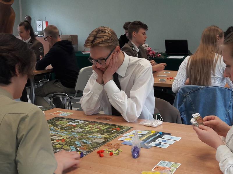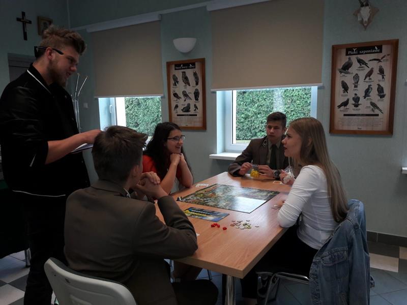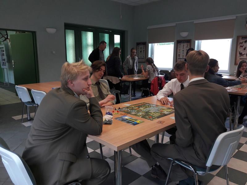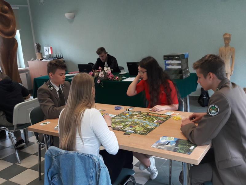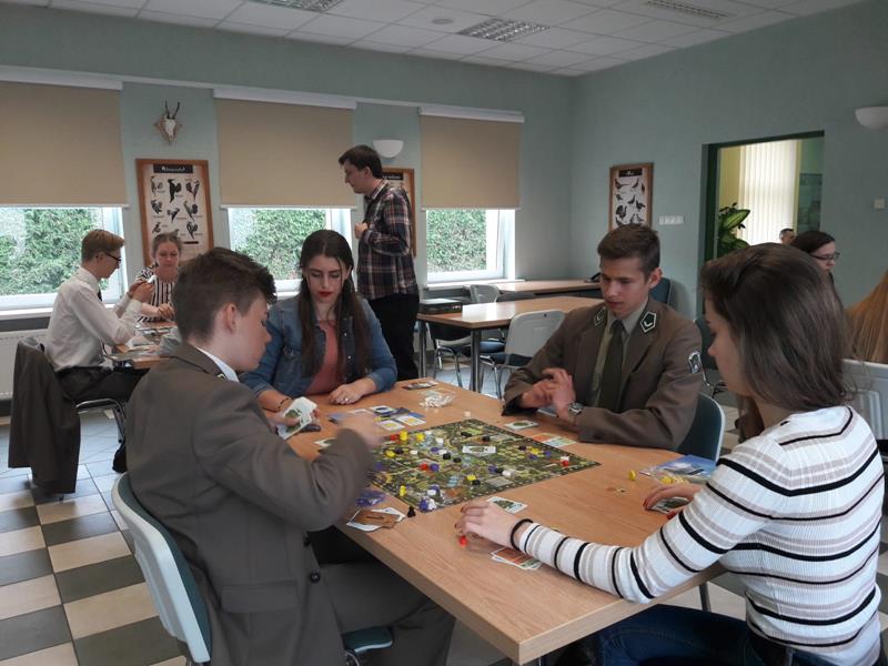 W piątek 24.05.2019r. dwoma czteroosobowymi drużynami w składzie: I – zespół: Wioletta Olechwirowicz, Mateusz Kułak, Krystian Dutkowski i Mateusz Strękowski, II – zespół: Karol Sołtys, Dawid Rydzewski, Bartek Raczkowski i Hubert Kryla, wyruszyliśmy na turniej gry planszowej „Żywioły Lasu”. Jest to gra strategiczna powstała w celu promocji działań Lasów Państowych związanych z adaptacją do zmian klimatu. Zadaniem graczy jest chronić swój las przed skutkami sił żywiołów, być gotowym na ewentualne klęski i dbać o to, aby las trwał dalej, z korzyścią dla ludzi i dla przyrody. Rozgrywki regionalne odbyły się w Nadleśnictwie Bielsk. Wyruszyliśmy z Panią Joanną Charkiewicz i Wiktorem Gutowskim, którzy wspierali nas przez cały czas gry. Na miejscu zmierzyliśmy się z uczniami miejscowych szkół i choć nie udało nam się wygrać, miło spędziliśmy czas. Była to także możliwość poznania nowych osób oraz porozmawiania o szkołach. Cieszymy się, że mogliśmy wziąć udział w tak ciekawej i niecodziennej inicjatywie.