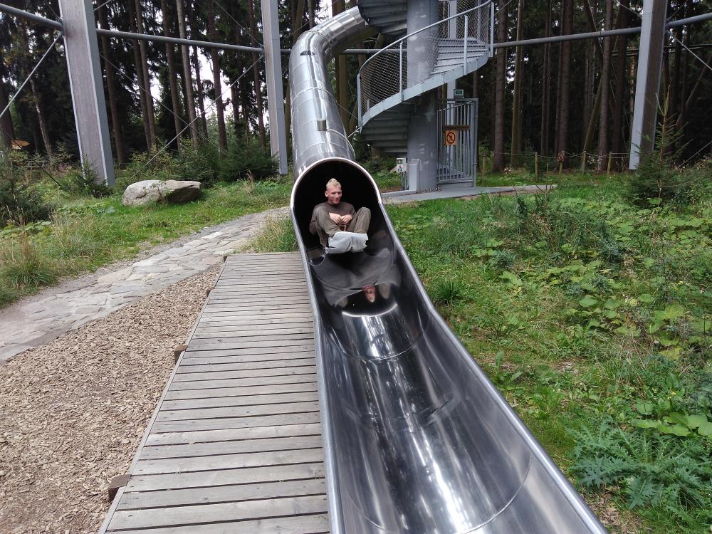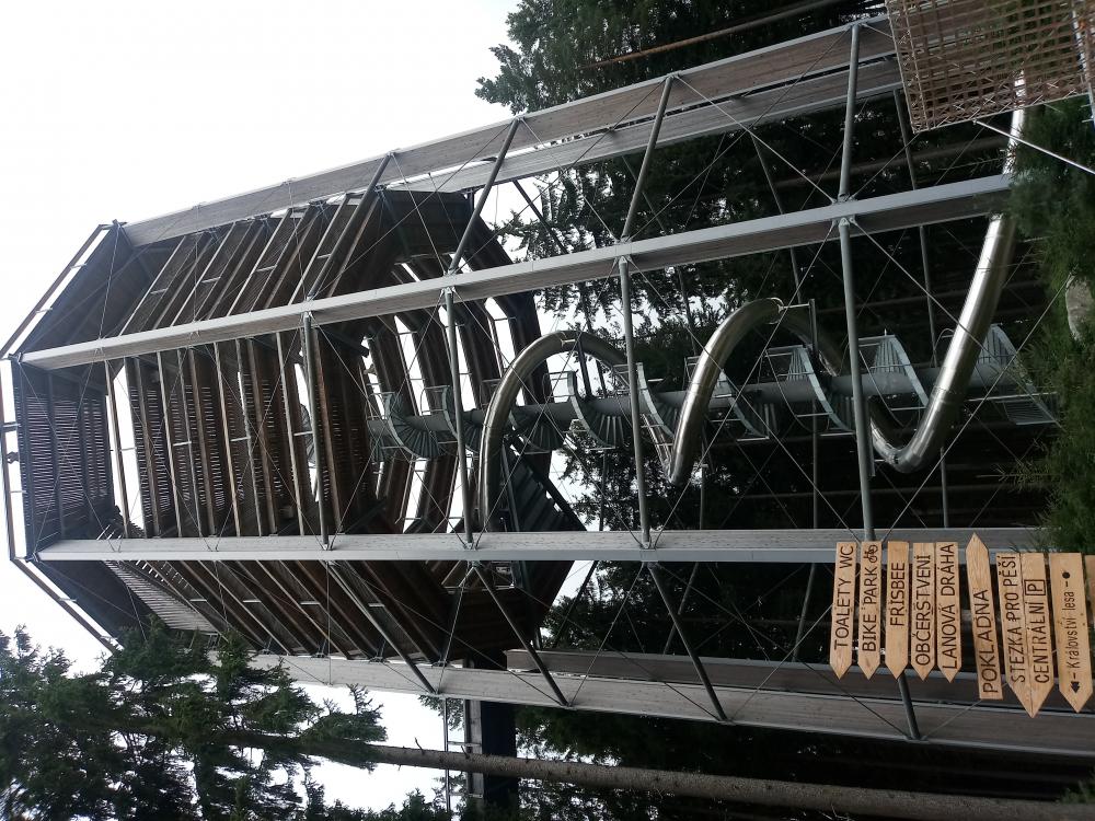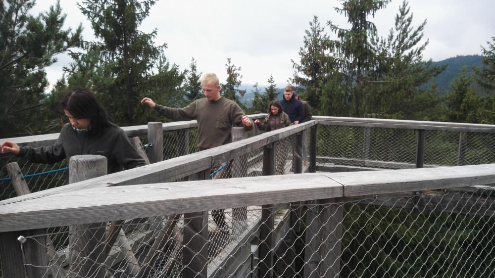 We wtorek pojechaliśmy aż pod granicę austriacką, w okolice miejscowości Lipno na górę Kramolin. Tam przeszliśmy się słynną ścieżką w koronach drzew i zjechaliśmy z niej na worku (toboganie) w metalowej zjeżdżalni. Obejrzeliśmy gołoborze Czertowa Stena nad rzeką Veltava.