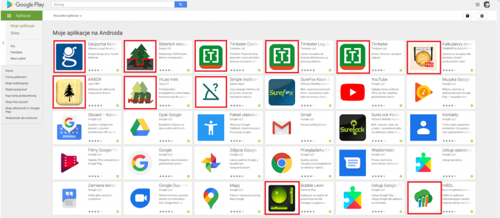 9. Timbeter https://play.google.com/store/apps/details?id=ee.timberdiameter , Timbeter Log Counter https://play.google.com/store/apps/details?id=ee.timberdiameter.counter , Timbeter Container https://play.google.com/store/apps/details?id=ee.timberDiameterContainer trzy aplikacje służące do obliczania mas drzewnych na podstawie zdjęcia stosu, mygły czy załadowanego samochodu wywozowego. Innymi słowy służy do fotooptycznego pomiaru drewna. Aplikacje zainstalowałem po lekturze kilku pozycji: