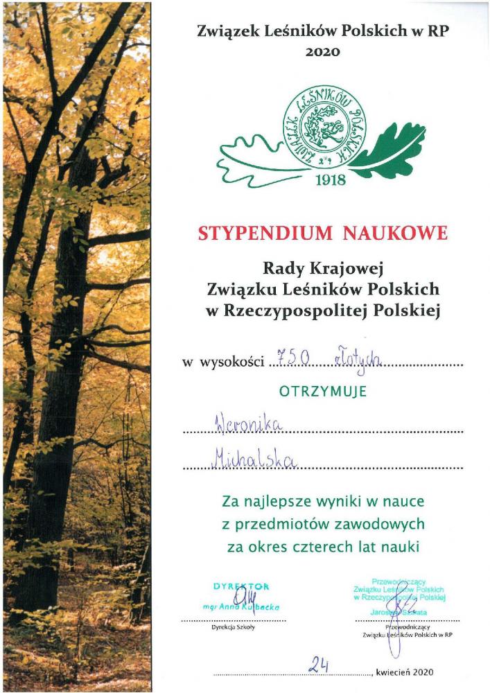 Związek Leśników Polskich w Rzeczypospolitej Polskiej ufundował stypendium za najwyższe średnie z przedmiotów zawodowych w okresie czterech lat nauki.