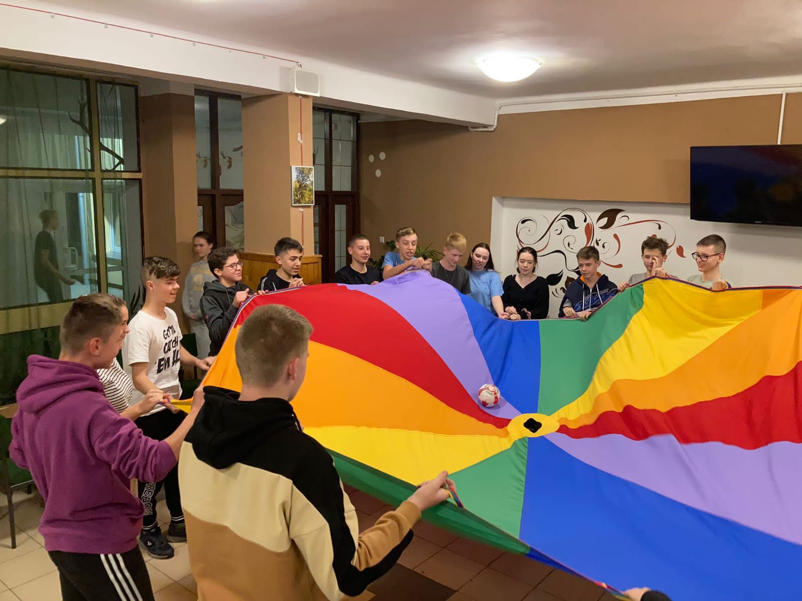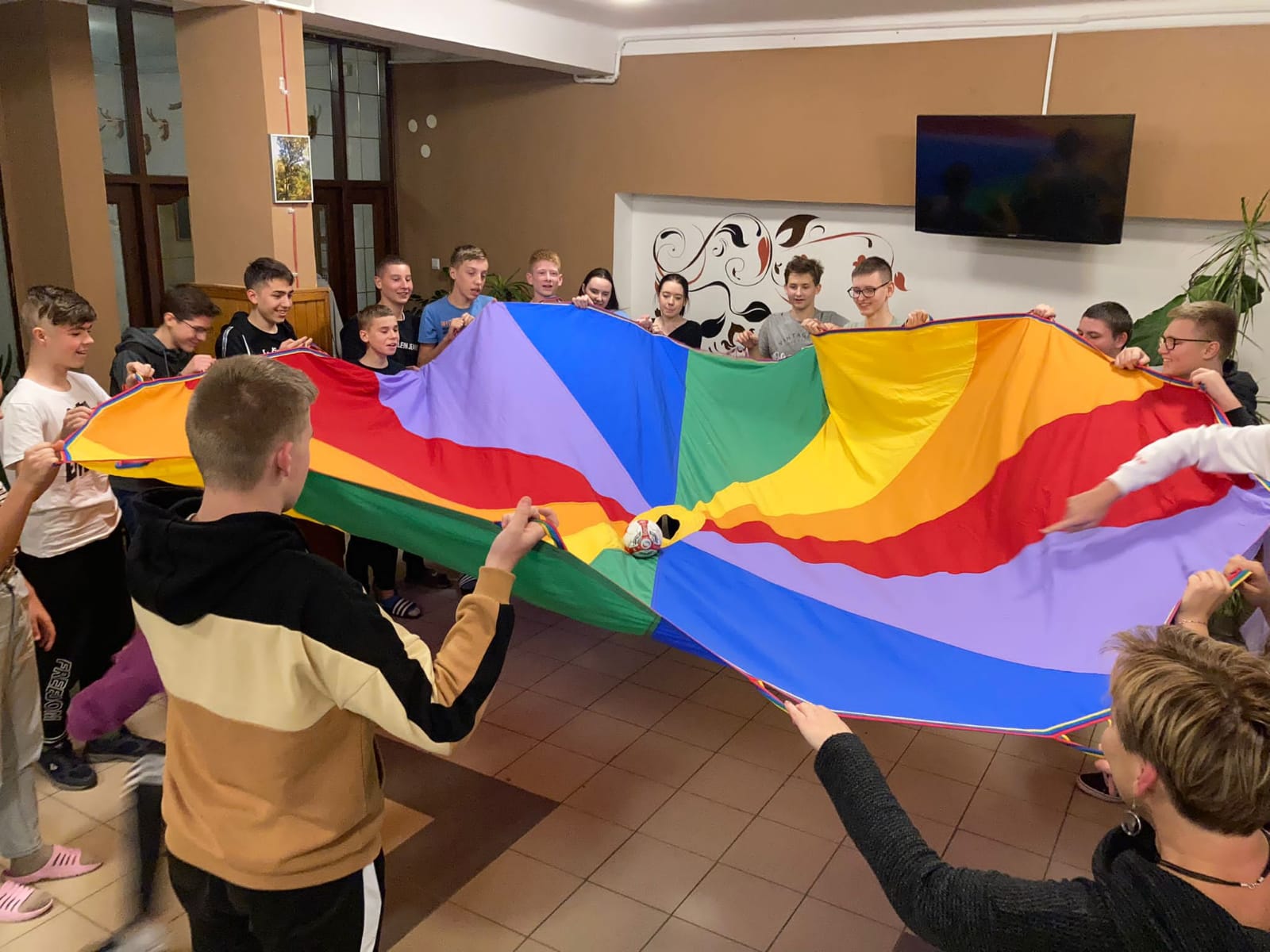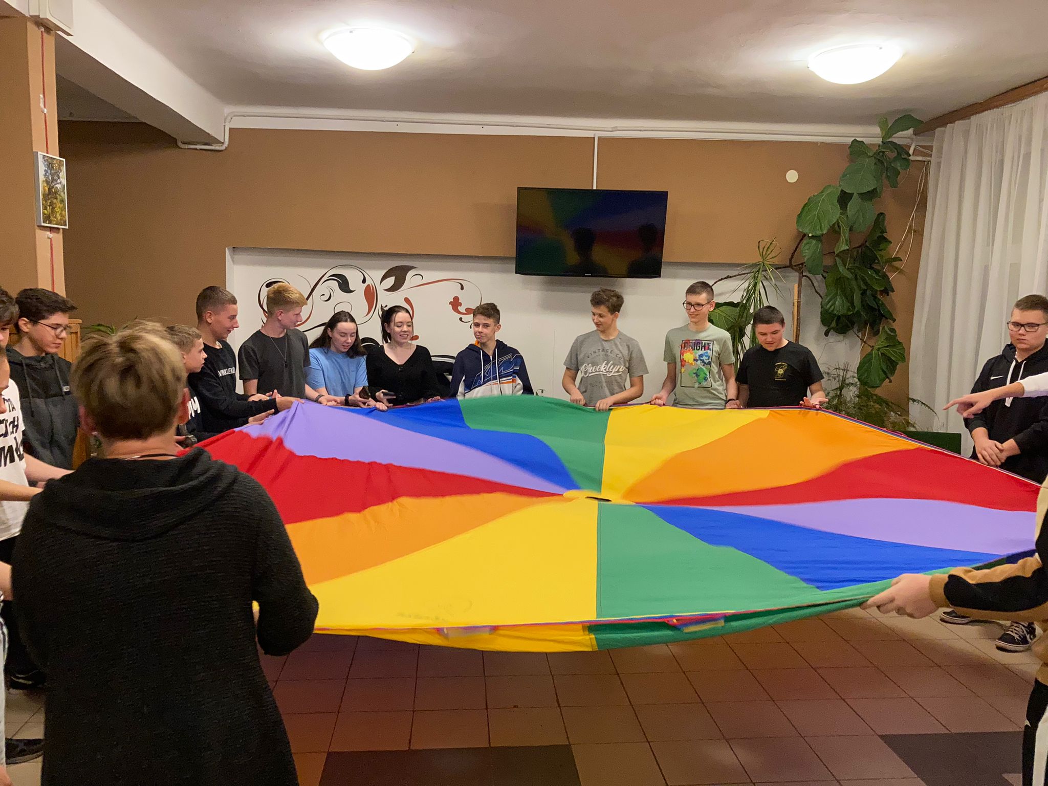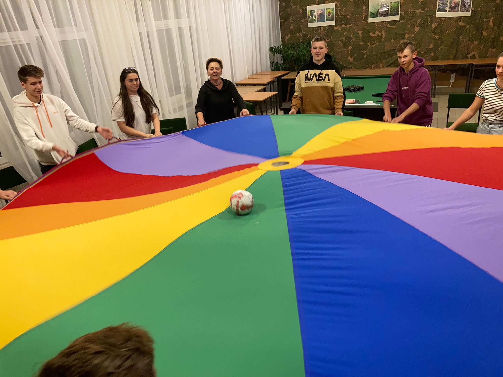 Po wrześniowej grze terenowej, która zaangażowała  wychowanków z niemal wszystkich roczników, działania grupy skupiły się na pracy w mniejszych zespołach.  04.10 i 18.10 zorganizowano zajęcia wychowankom z klas  1a i 1b. Warsztaty miały na celu budowanie atmosfery  zaufania w zespole klasowym.  Każdy z uczestników mógł  poczuć swoją wyjątkowość  i indywidualność, ale też poszukiwał cech, czy okoliczności, które łączą go z innymi członkami zespołu. Dzięki życzliwości pracowników Białowieskiego Domu Dziecka, którzy użyczyli  nam chusty animacyjnej,  mieliśmy możliwość ubarwienia naszych zajęć.