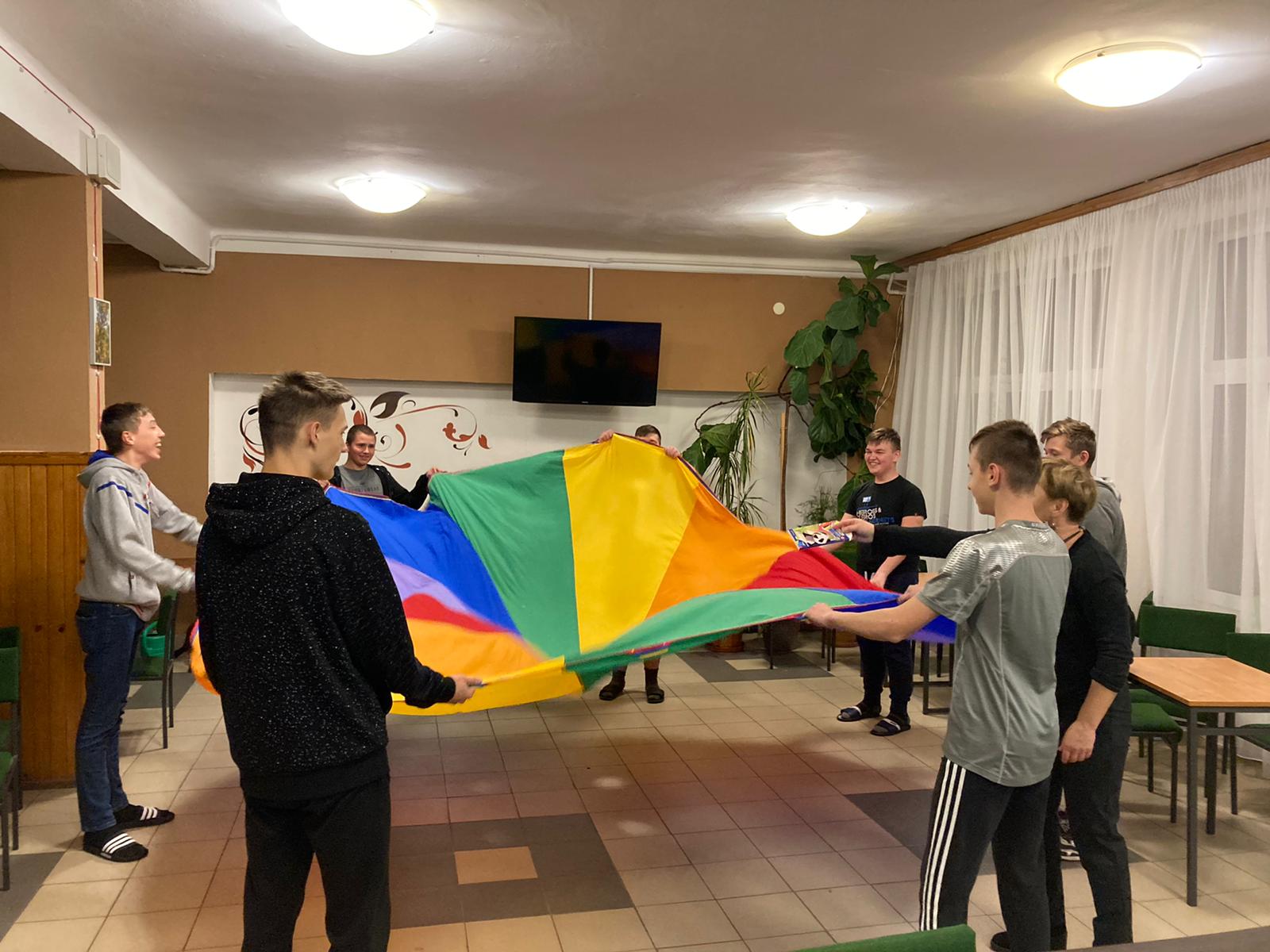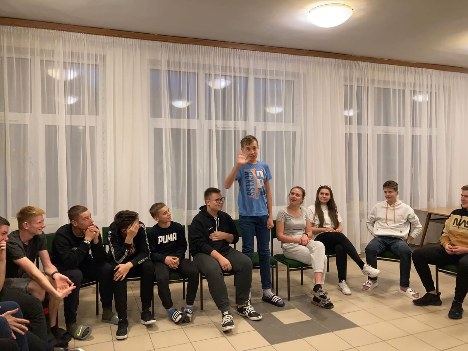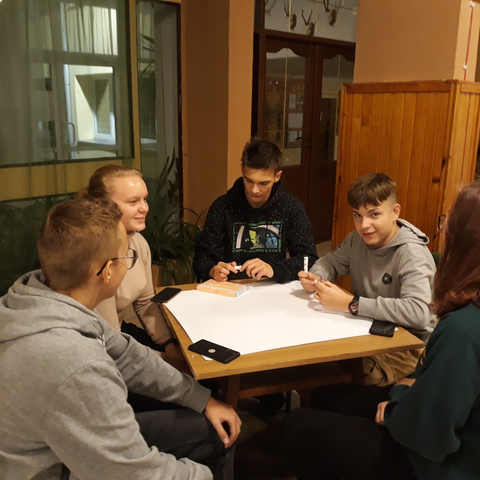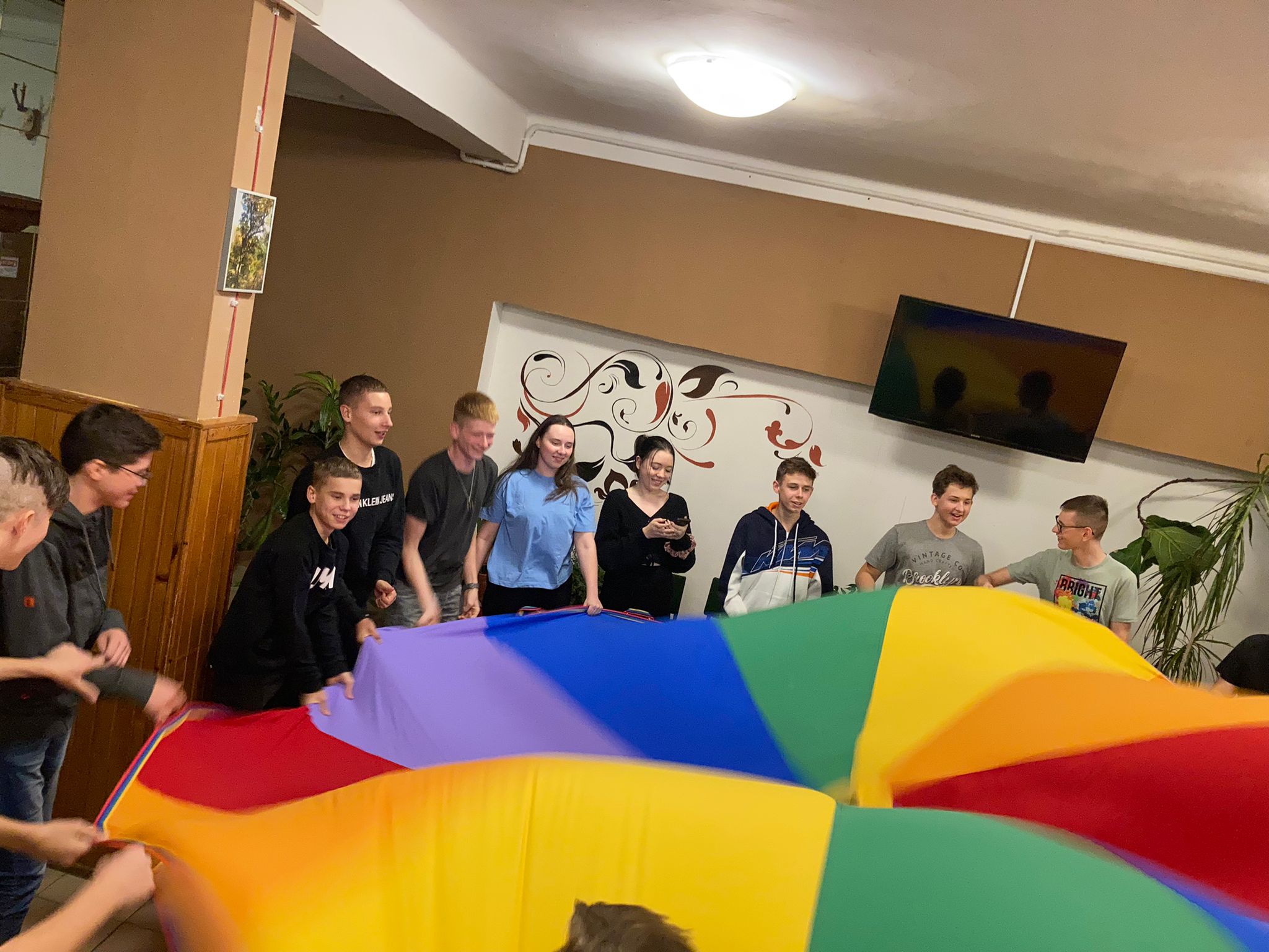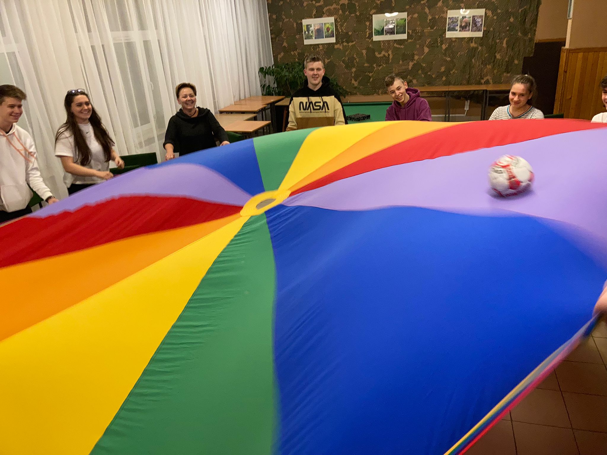 Po wrześniowej grze terenowej, która zaangażowała  wychowanków z niemal wszystkich roczników, działania grupy skupiły się na pracy w mniejszych zespołach.  04.10 i 18.10 zorganizowano zajęcia wychowankom z klas  1a i 1b. Warsztaty miały na celu budowanie atmosfery  zaufania w zespole klasowym.  Każdy z uczestników mógł  poczuć swoją wyjątkowość  i indywidualność, ale też poszukiwał cech, czy okoliczności, które łączą go z innymi członkami zespołu. Dzięki życzliwości pracowników Białowieskiego Domu Dziecka, którzy użyczyli  nam chusty animacyjnej,  mieliśmy możliwość ubarwienia naszych zajęć.