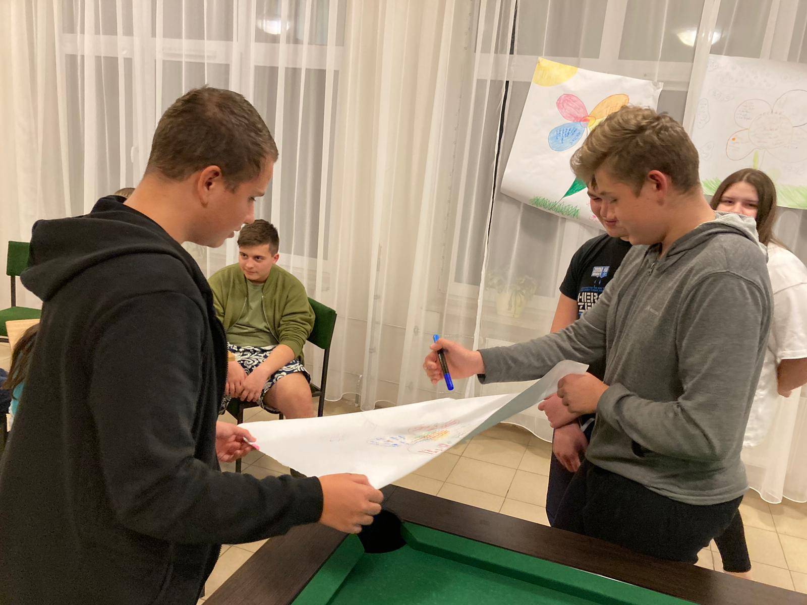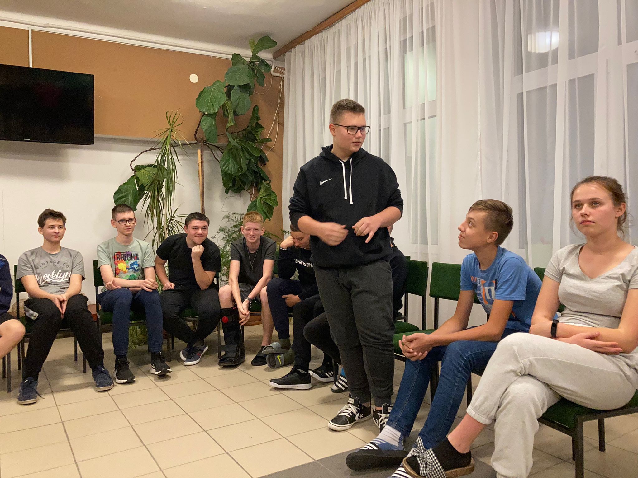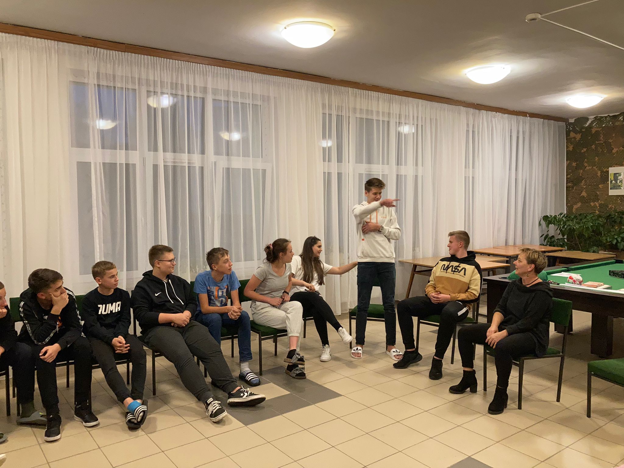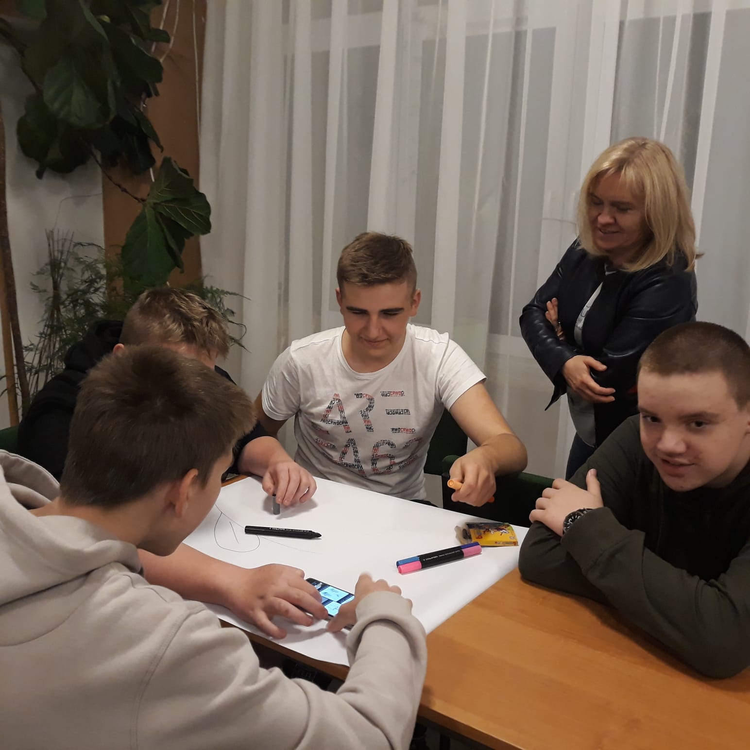 Po wrześniowej grze terenowej, która zaangażowała  wychowanków z niemal wszystkich roczników, działania grupy skupiły się na pracy w mniejszych zespołach.  04.10 i 18.10 zorganizowano zajęcia wychowankom z klas  1a i 1b. Warsztaty miały na celu budowanie atmosfery  zaufania w zespole klasowym.  Każdy z uczestników mógł  poczuć swoją wyjątkowość  i indywidualność, ale też poszukiwał cech, czy okoliczności, które łączą go z innymi członkami zespołu. Dzięki życzliwości pracowników Białowieskiego Domu Dziecka, którzy użyczyli  nam chusty animacyjnej,  mieliśmy możliwość ubarwienia naszych zajęć.