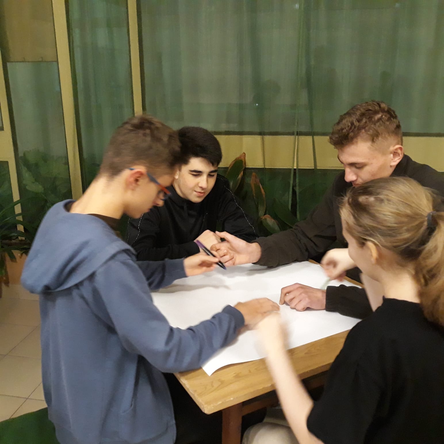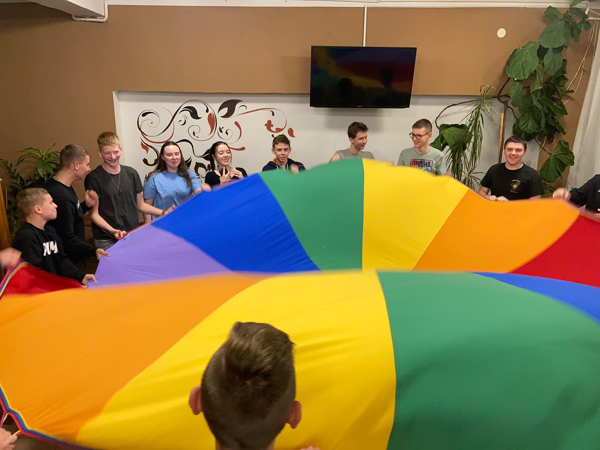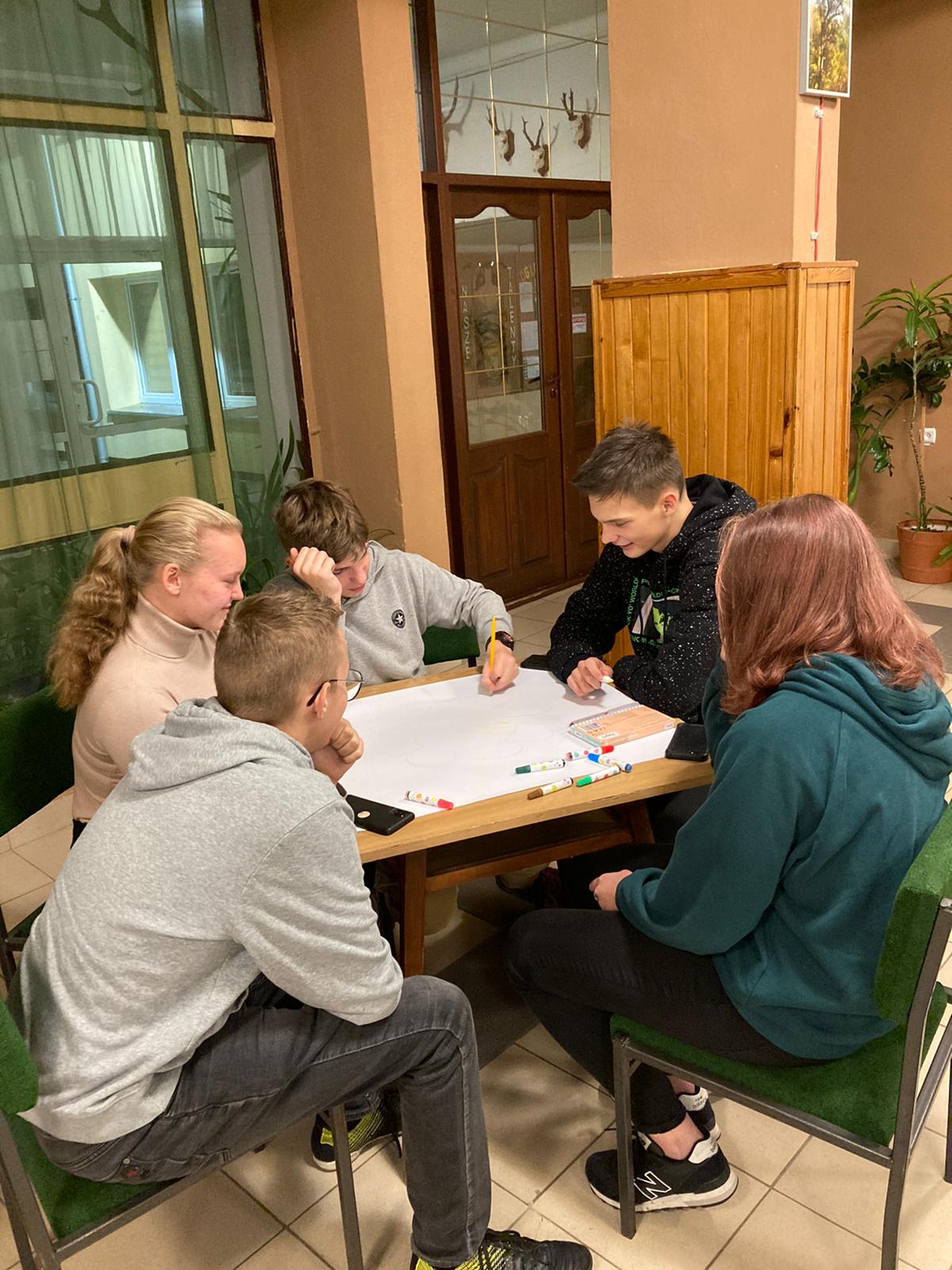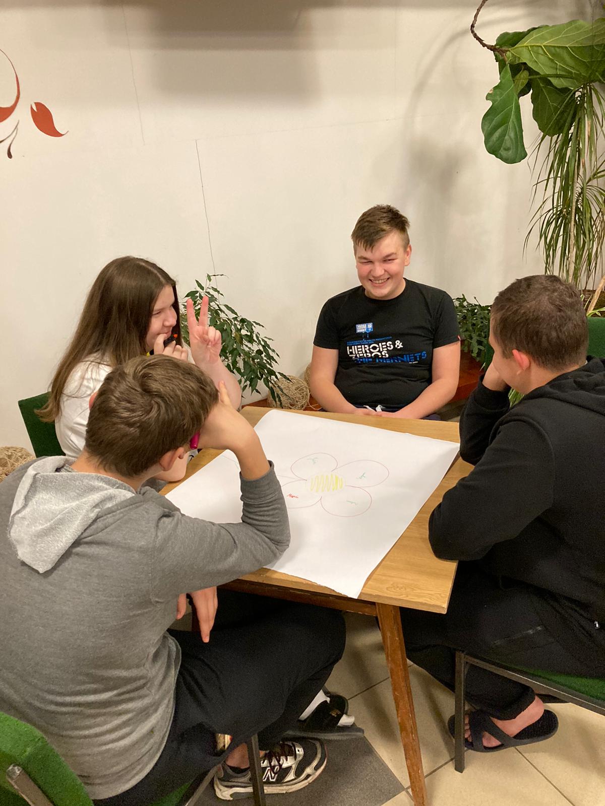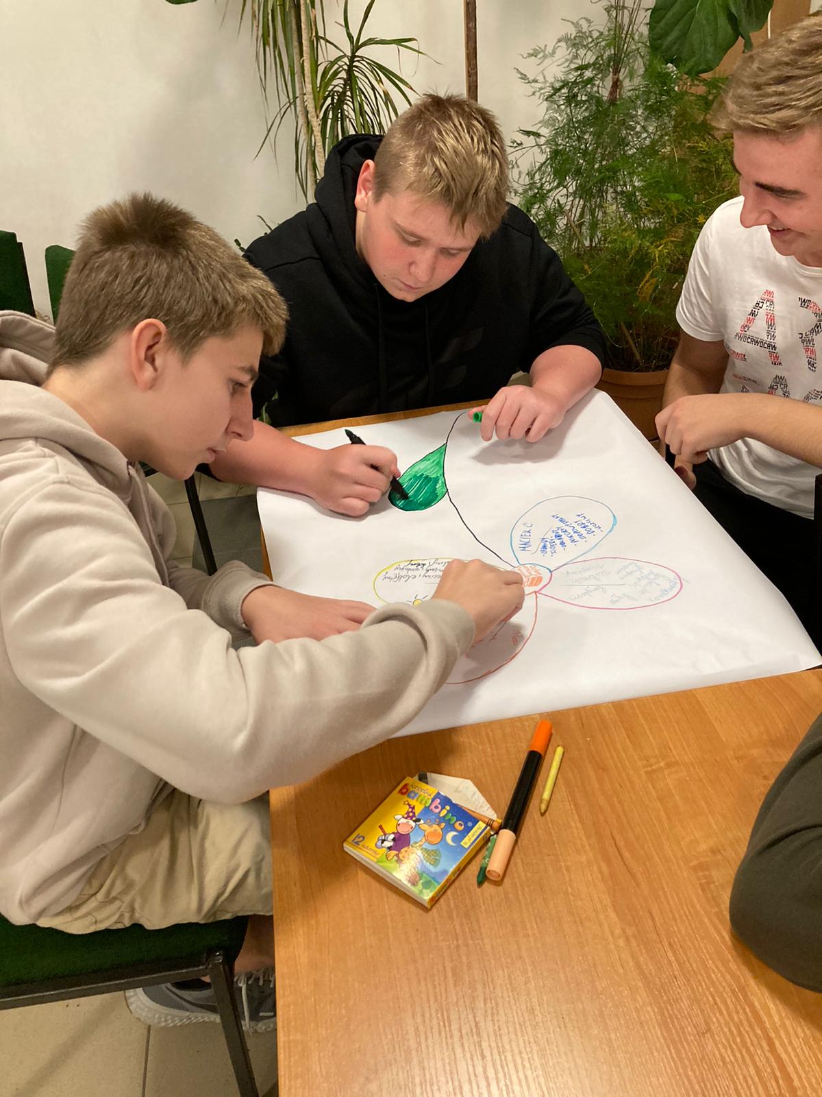 Po wrześniowej grze terenowej, która zaangażowała  wychowanków z niemal wszystkich roczników, działania grupy skupiły się na pracy w mniejszych zespołach.  04.10 i 18.10 zorganizowano zajęcia wychowankom z klas  1a i 1b. Warsztaty miały na celu budowanie atmosfery  zaufania w zespole klasowym.  Każdy z uczestników mógł  poczuć swoją wyjątkowość  i indywidualność, ale też poszukiwał cech, czy okoliczności, które łączą go z innymi członkami zespołu. Dzięki życzliwości pracowników Białowieskiego Domu Dziecka, którzy użyczyli  nam chusty animacyjnej,  mieliśmy możliwość ubarwienia naszych zajęć.