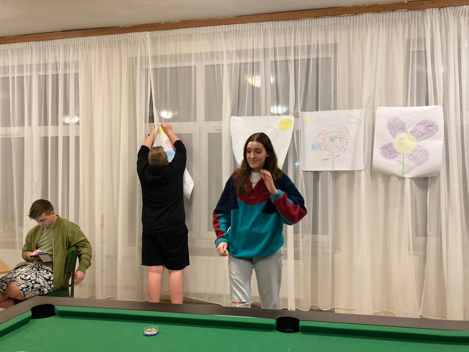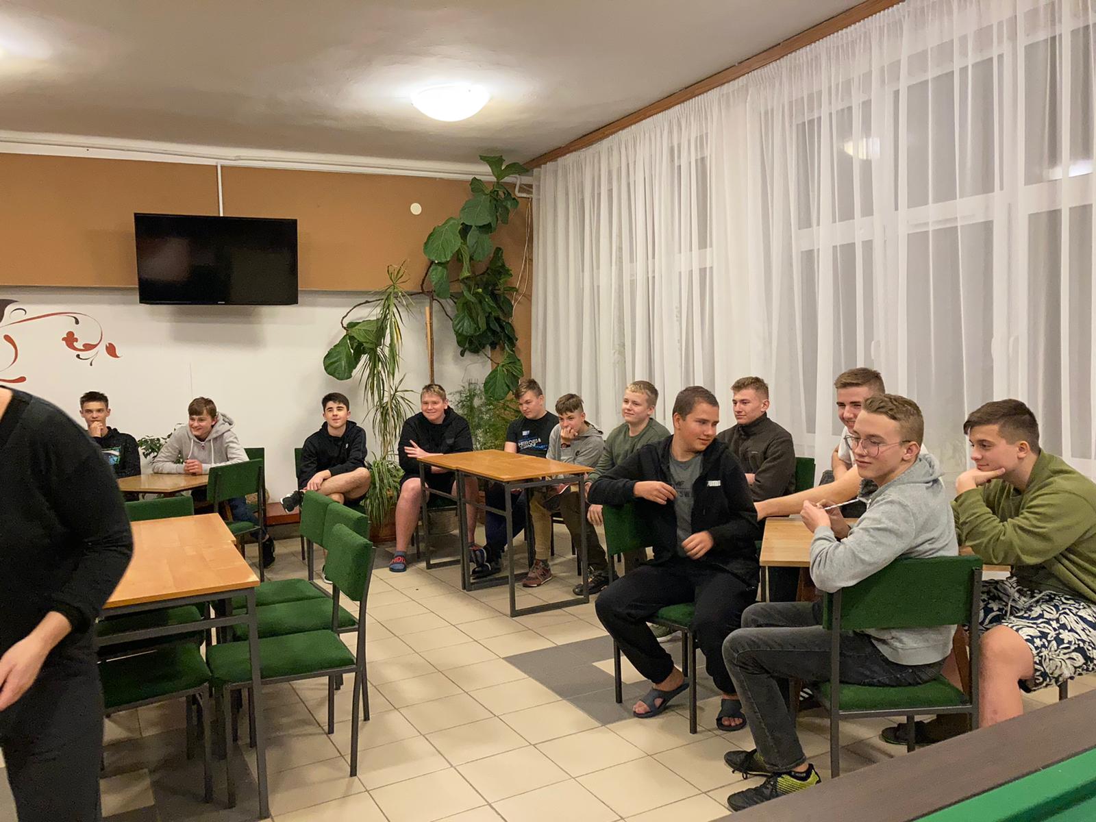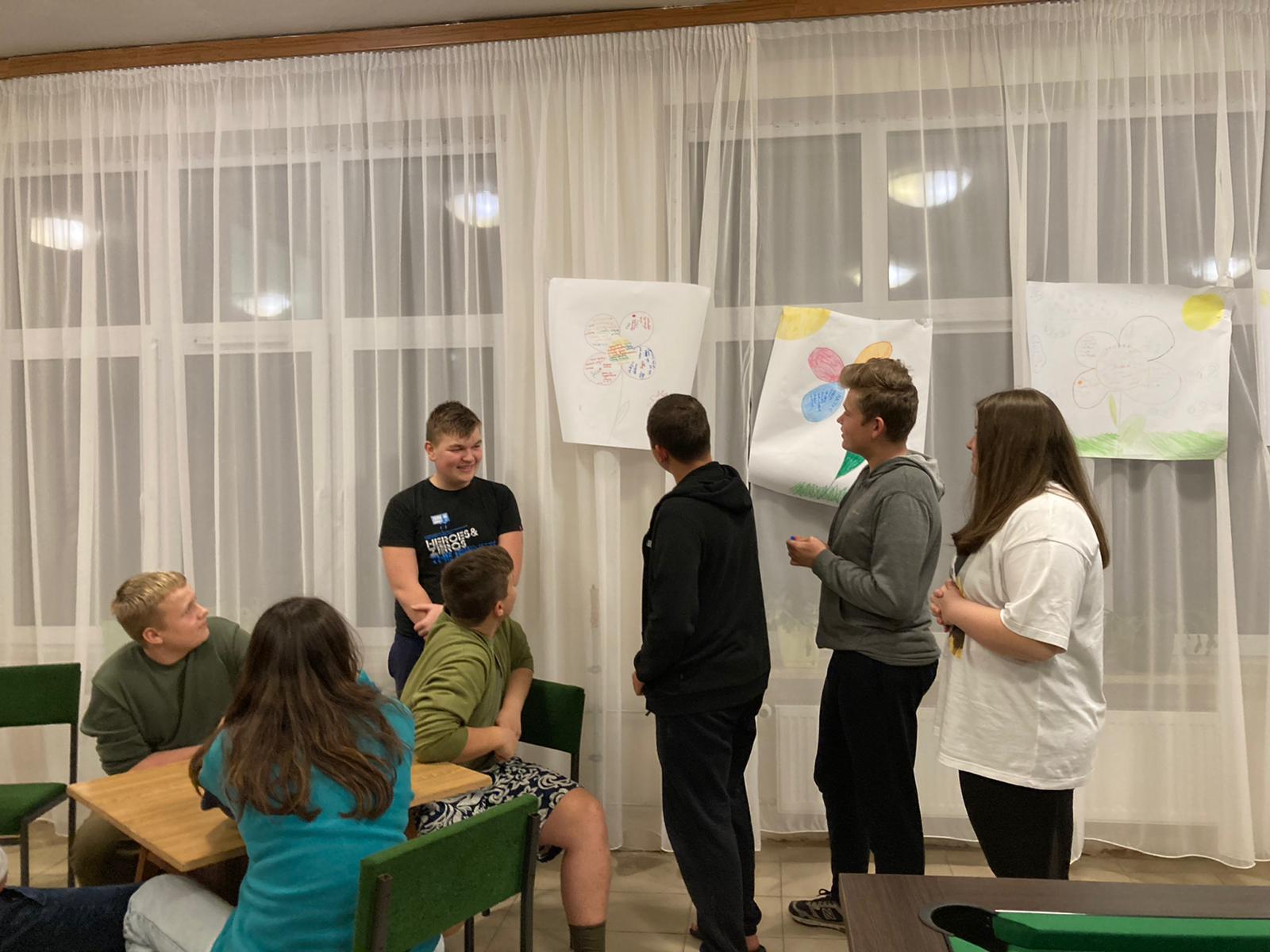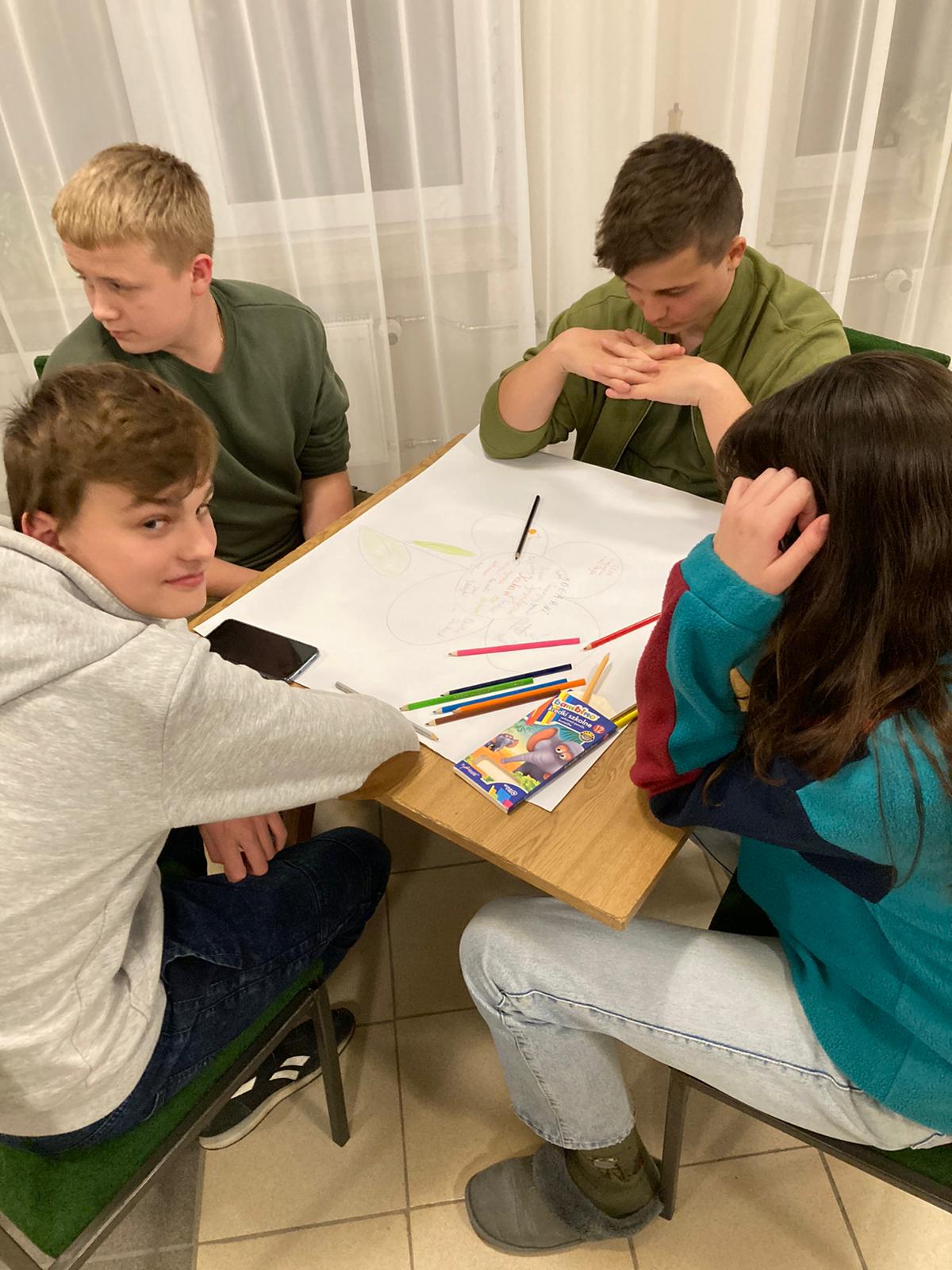 Po wrześniowej grze terenowej, która zaangażowała  wychowanków z niemal wszystkich roczników, działania grupy skupiły się na pracy w mniejszych zespołach.  04.10 i 18.10 zorganizowano zajęcia wychowankom z klas  1a i 1b. Warsztaty miały na celu budowanie atmosfery  zaufania w zespole klasowym.  Każdy z uczestników mógł  poczuć swoją wyjątkowość  i indywidualność, ale też poszukiwał cech, czy okoliczności, które łączą go z innymi członkami zespołu. Dzięki życzliwości pracowników Białowieskiego Domu Dziecka, którzy użyczyli  nam chusty animacyjnej,  mieliśmy możliwość ubarwienia naszych zajęć.
