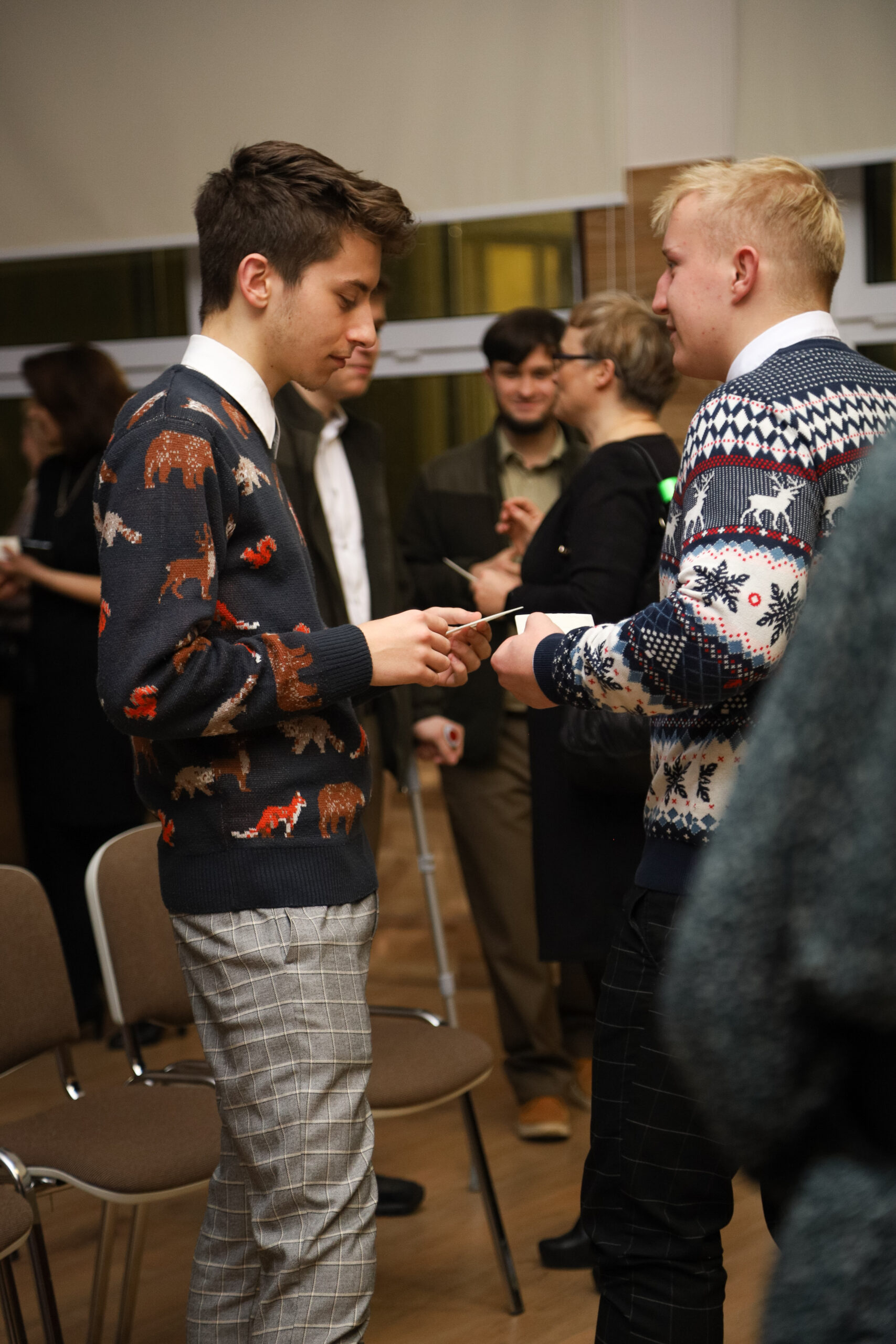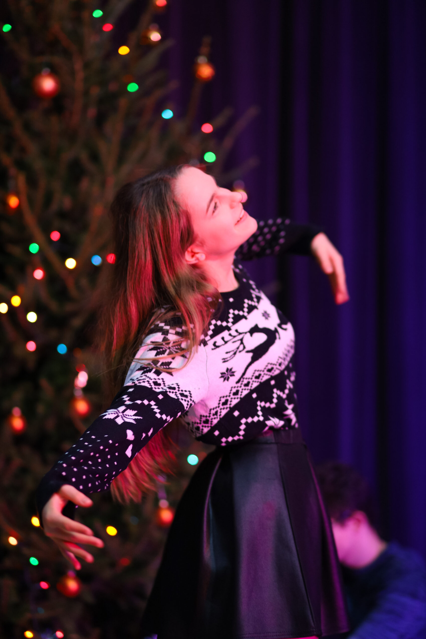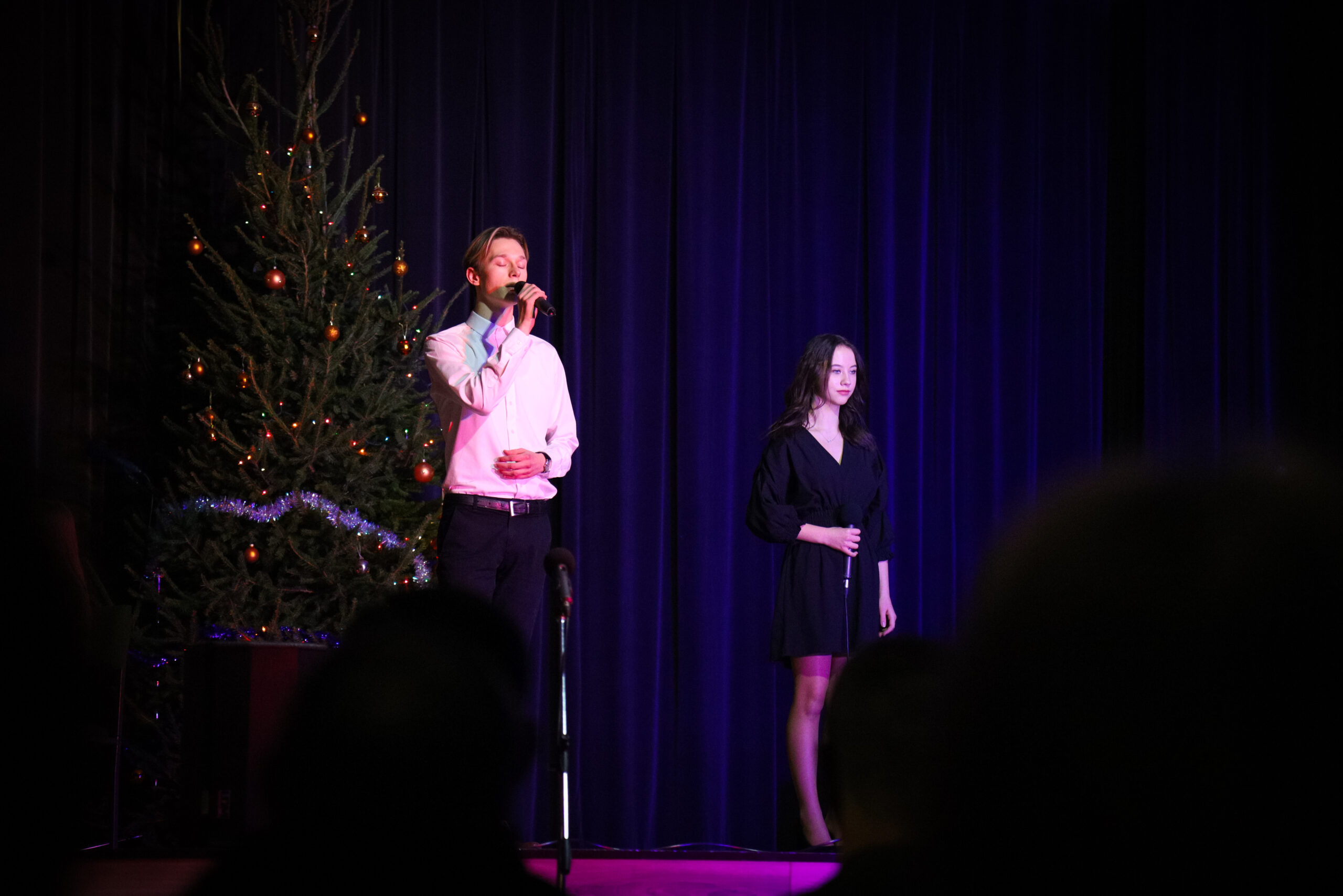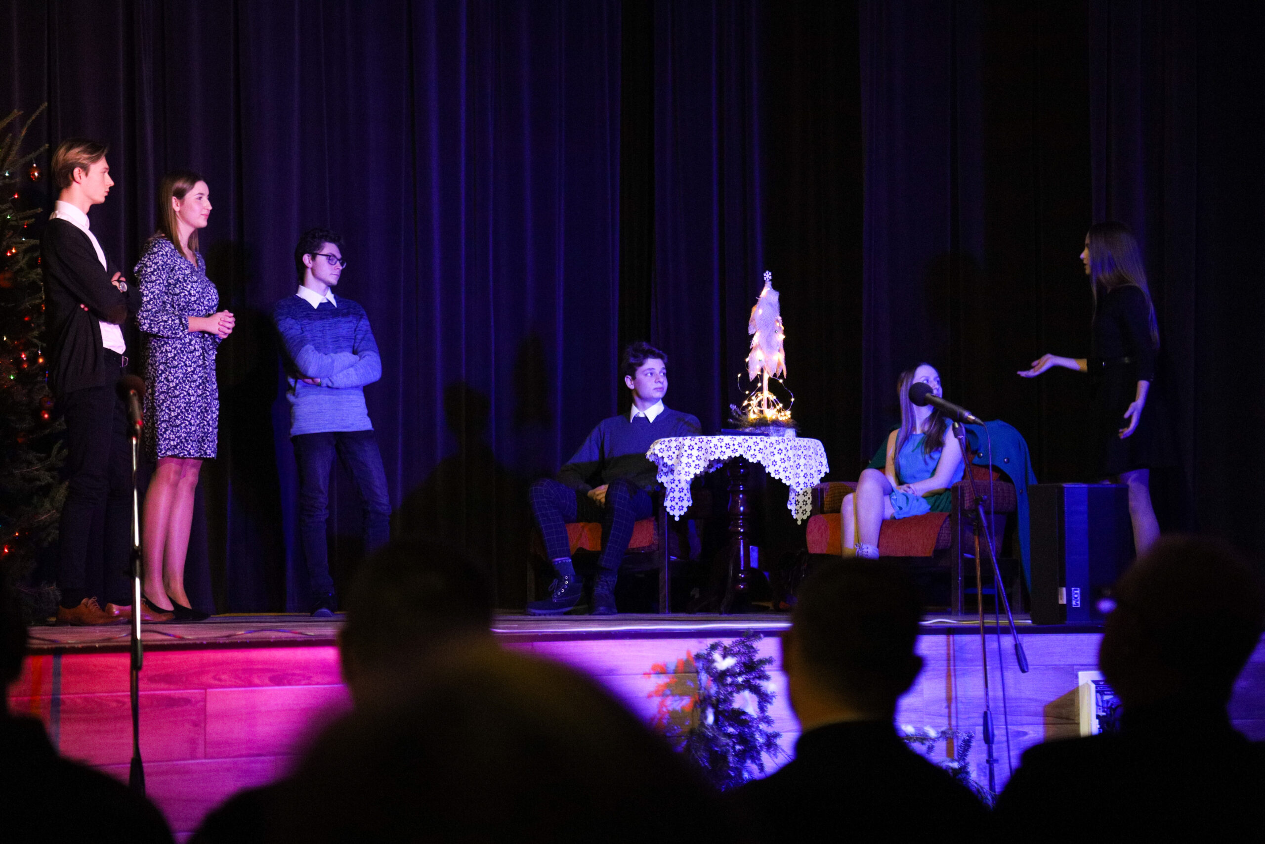 Spotkanie rozpoczęło się częścią artystyczną. Na początku wystąpił chór w składzie: Zofia Aleksiejuk (2b), Karolina Niedźwiecka (3b), Ewa Ostrowska (4a), Wioletta Olechwirowicz (4a), Zuzanna Pająk (2a), Julia Radziwoniuk (2b), Małgorzata Sikorska (3c), Marta Zielińska (3b), Wiktor Gutowski (4a), Mateusz Klekotko (2a), Jakub Kopańczyk (1a), Kamil Mróz (3b), Karol Sołtys (4a), Wojciech Suchoicki (3c), Szymon Zabrocki (3a), który wprowadził wszystkich w świąteczny nastrój. Chór zaśpiewał tradycyjne kolędy i pastorałki: „Z narodzenia Pana”, „Przybieżeli do Betlejem/Pojawilis’ nad wiertepom anhieły”, „Gore gwiazda Jezusowi”, „Dzisiaj w Betlejem/Niebo i ziemla” oraz „Tryumfy Króla Niebieskiego”. Z chórzystami wystąpiła Kornelia Żywiec (3a), która pięknie zagrała na flecie nastrojowe kolędy. Usłyszeliśmy w jej wykonaniu utwory: „Cicha noc”, „Gdy śliczna Panna” i „Lulajże Jezuniu”.