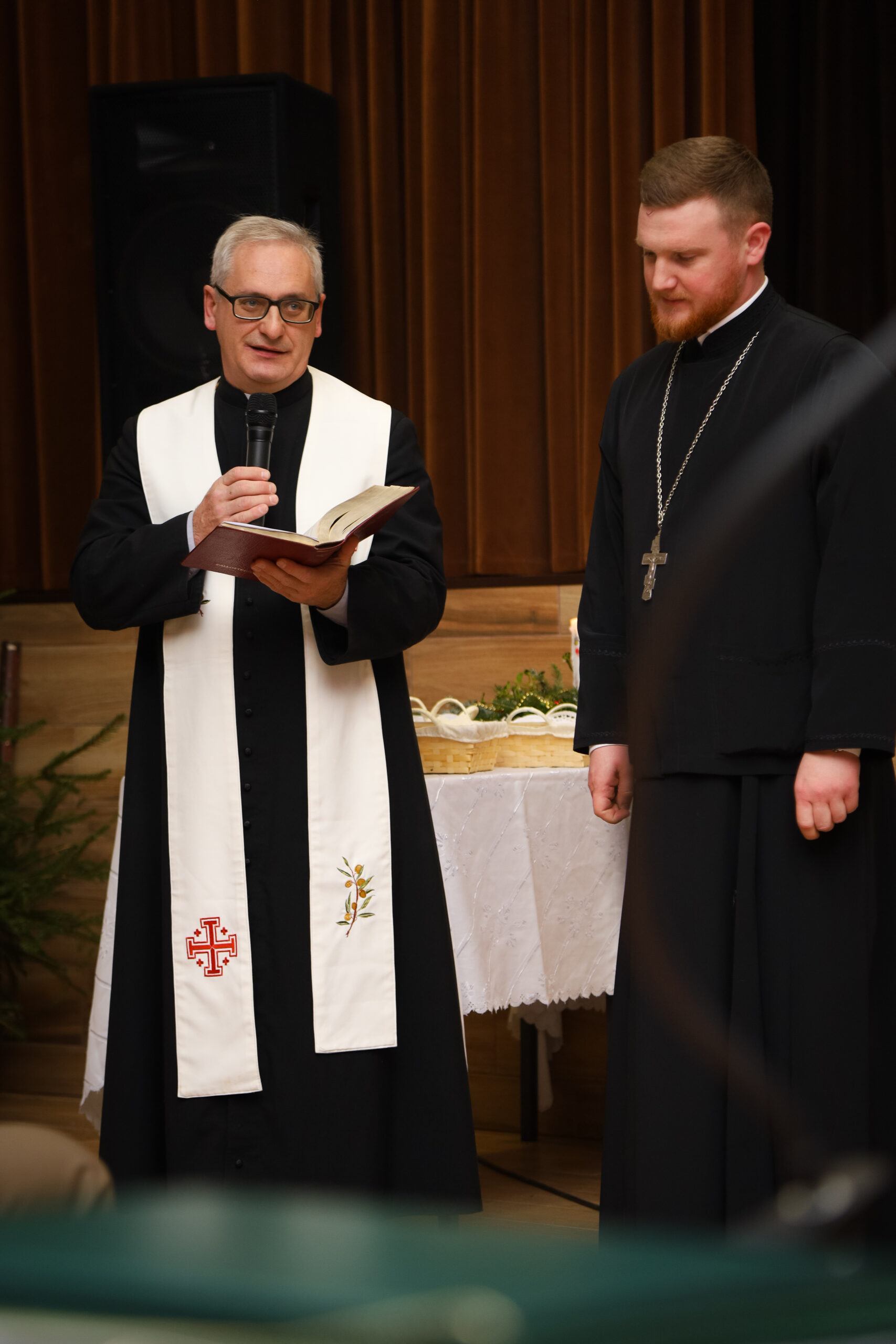 Po występie artystycznym pani Dyrektor Anna Kulbacka złożyła zgromadzonym serdeczne i ciepłe życzenia świąteczne, a księża z parafii katolickiej – ks. Bogdan Popławski i prawosławnej – ks. Nikita Kazakiewicz rozpoczęli wspólną modlitwę. Później nastał czas dzielenia się opłatkiem i prosforą oraz składania sobie nawzajem życzeń.