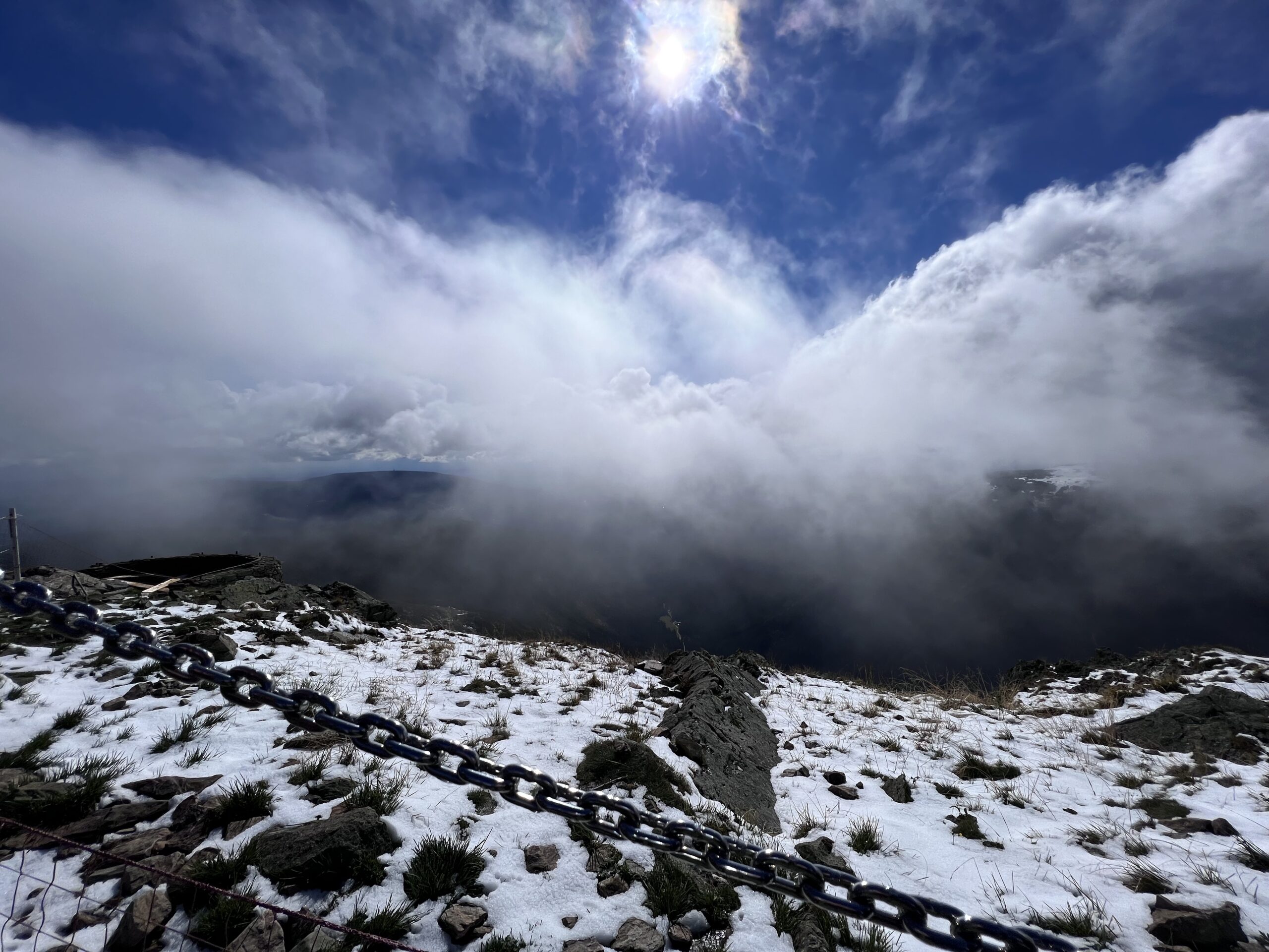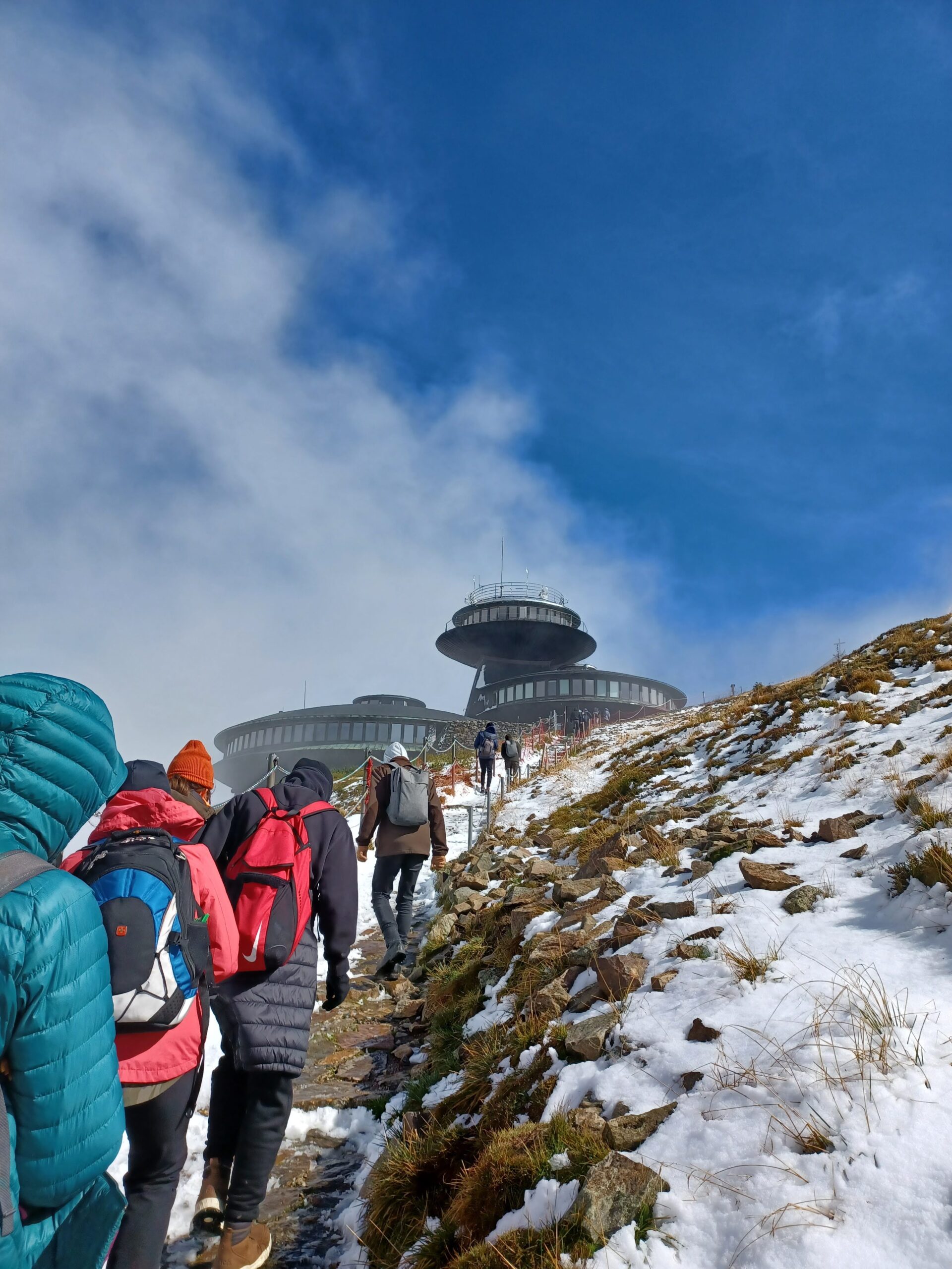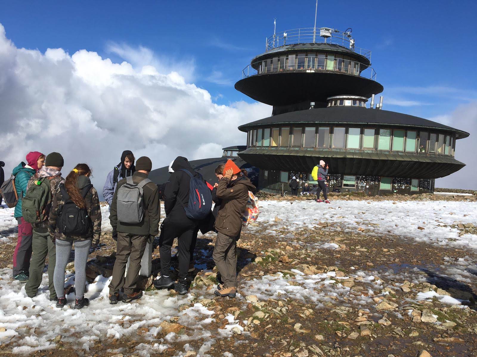 Następnego dnia czekała nas nie lada przygoda. Po śniadaniu wyruszyliśmy na podbój królowej Karkonoszy – Śnieżki. Najpierw Drogą Bronka Czecha, im dalej, tym zdecydowanie trudniej. Mimo iż było nam ciężko iść, czasami nogi odmawiały posłuszeństwa – koledzy okazali się świetnymi kompanami w tych trudach, razem daliśmy radę, udało nam się wiele zobaczyć. Podziwialiśmy „Słonecznik” – jedną z wielu w Karkonoszach (ok. 150), granitowych formacji skalnych. Wysokość nad poziomem morza to 1423 metry, a same skałki mają wysokość 12 metrów. Nazwa skałek to Kamień Południa (albo południowy) wzięła się stąd, iż właśnie w południe słońce znajduje się nad skałkami. Fragment Słonecznika przypomina swoim wyglądem wyrzeźbioną postać ludzką, lub diabelską, toteż czasem skałki te określano również Diabelskim Kamieniem. Następnie czerwonym szlakiem , nad kotłami Wielkiego i Małego Stawu (niestety z głowami w chmurach) udaliśmy się w kierunku jednego z najpiękniej położonych schronisk Domu Śląskiego. Początkowo trasa lekko wznosi się do góry, a następnie zmienia się w kamienną ścieżkę. Po wielu trudach – a należy dodać że pogoda nas nie rozpieszczała, dotarliśmy na szczyt. Na Śnieżce (1603 m n.p.m) przywitał nas charakterystyczny budynek z latającymi talerzami, który powstał w latach 1967-76 – Obserwatorium Meteorologiczne im. Tadeusza Hołdysa. Odwiedziliśmy również kaplicę św. Wawrzyńca, patrona przewodników górskich pochodzącą z 1681 r. Po zasłużonym odpoczynku i nasyceniu oczu pięknymi widokami zaczęliśmy powoli schodzić drogą letnią, przez Kocioł Łomniczki, najgłębszy (300 m) karkonoski kocioł pochodzenia lodowcowego. Schodząc podziwialiśmy przepiękne widoki, a mijany Cmentarz Ofiar Gór, przypomniał nam, że góry są tak samo piękne jak i niebezpieczne.
