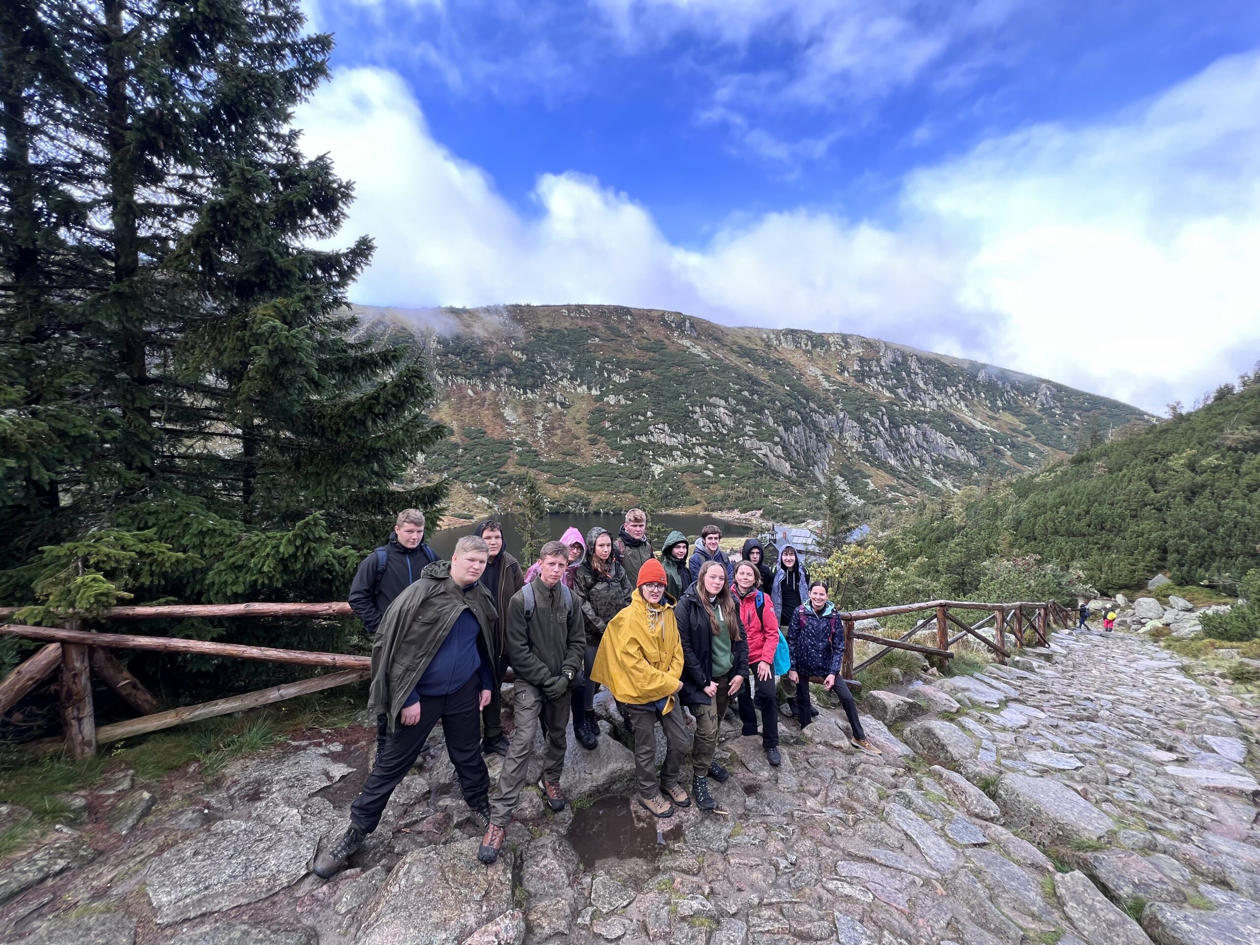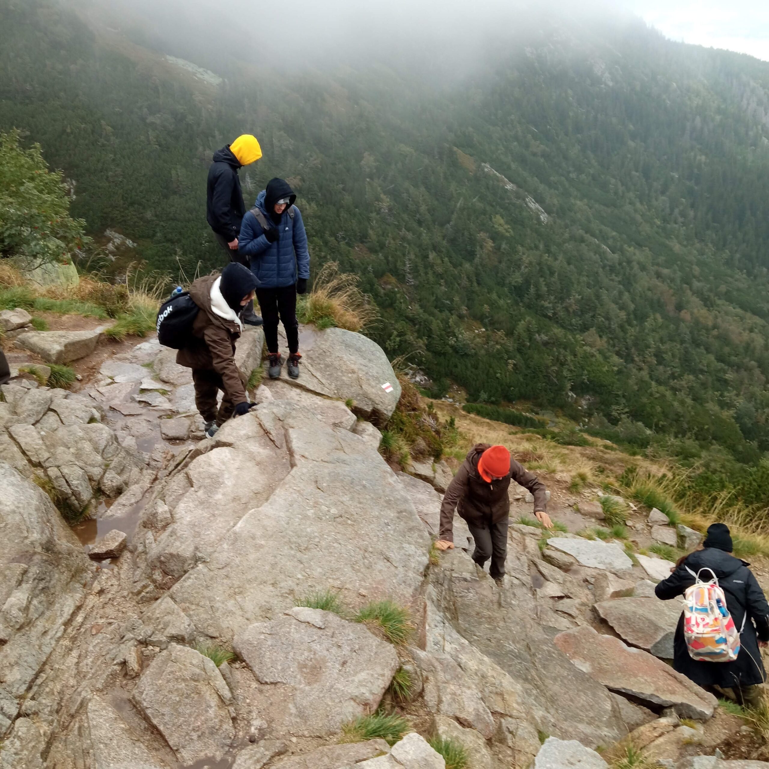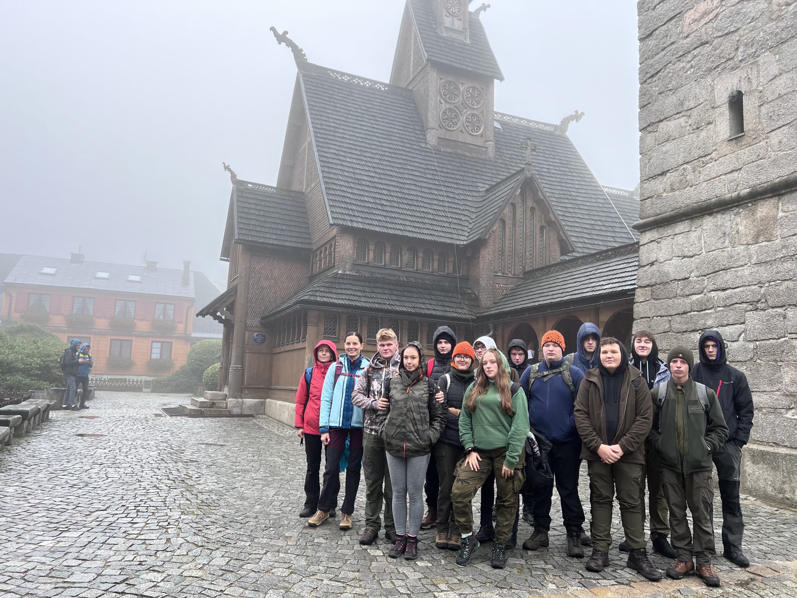 Kolejny dzień przywitał nas niestety paskudną pogodą. Ale cóż góry wzywały. Tym razem wybraliśmy się niebieskim szlakiem do Świątyni Wang – uważanej za najstarszy drewniany kościół w Polsce (widzieliśmy pismo runiczne). Przy kościelnym cmentarzu znajduje się grób wybitnego polskiego poety, dramaturga i scenarzysty Tadeusza Różewicza. Stamtąd mokrą i śliską kamienną ścieżką doszliśmy do położonego w kotle Małego Stawu schroniska Samotnia -jednego z najstarszych schronisk w Polsce! Początkowo była to mała, drewniana buda zamieszkiwana przez strażnika, który pilnował hodowanych w Małym Stawie pstrągów. Następnie trasą z pięknymi widokami doszliśmy do schroniska Strzecha Akademicka na wysokości 1258m n.p.m., które jest kolejnym z najstarszych w Karkonoszach, (z pięknie zdobionymi wnętrzami). Swoją nazwę zawdzięcza licznie przebywających w nim studentom. Następnie przechodząc przez Biały Jar (Nisza niwalna Białego Jaru – utworzona przez lodowiec ok. 10 mln lat temu. W XIX w. w Białym Jarze prowadzono prace górnicze, poszukiwano złota i wydobywano galenę z domieszką srebra), zatrzymaliśmy się przy pomniku Pamięci Ofiar Lawiny -20 marca 1968 r. (nazwana największą tragedią lawinową w polskich górach). Potem Śląską Drogą zeszliśmy pod Dziki Wodospad w Karpaczu. Podczas naszych wędrówek o historii, geografii i legendach tamtych terenów opowiadała nam pani Wiktoria Poniatowska -przewodnik sudecki. Na górskich szlakach czuwały nad nami panie: Anetta Świć i Marta Wołoncewicz.
