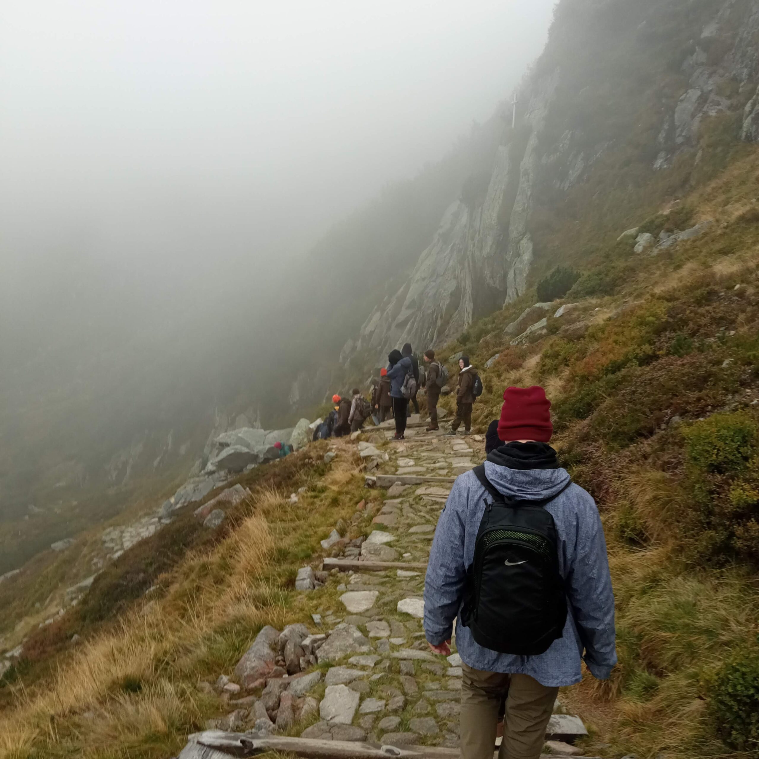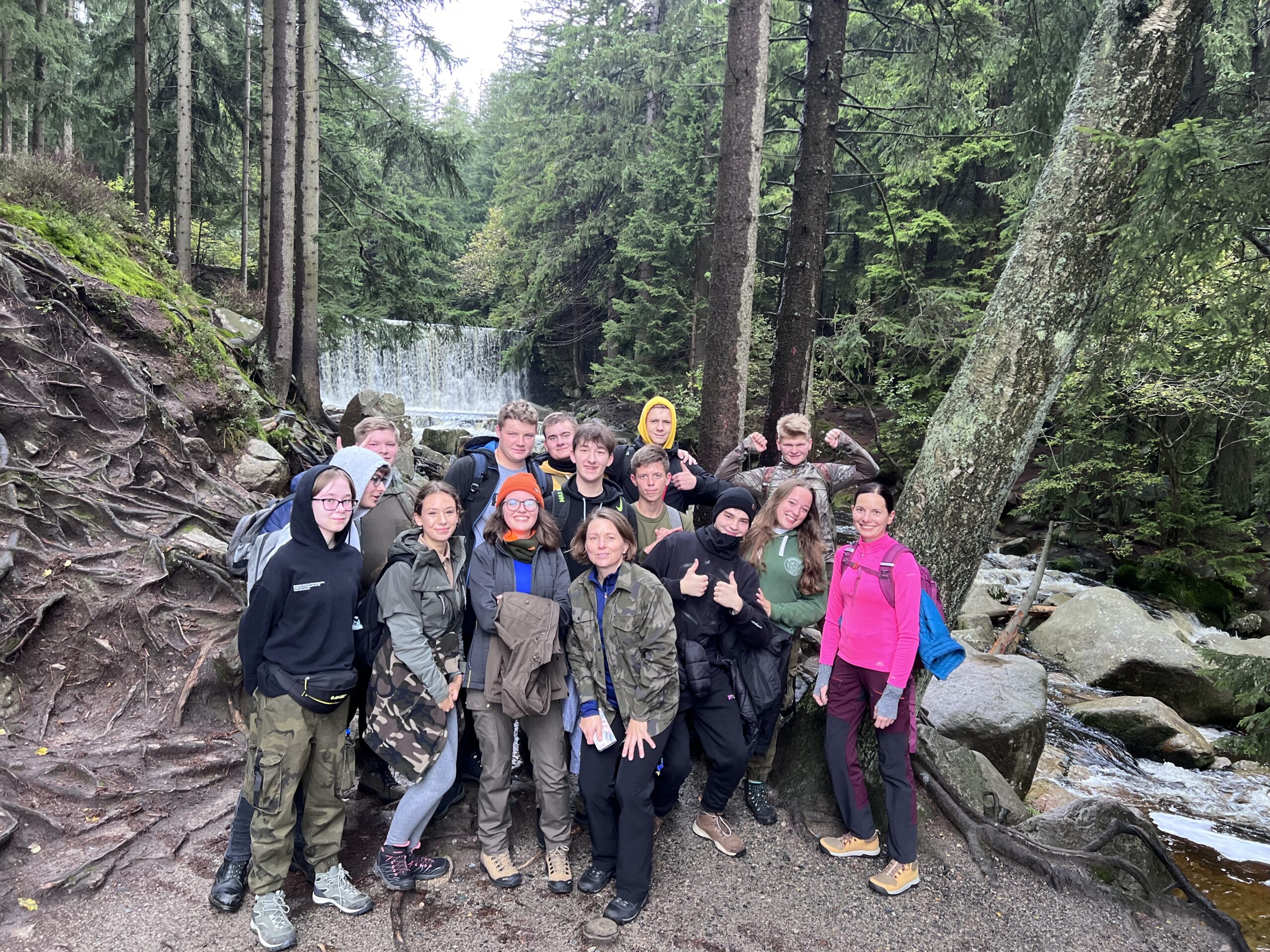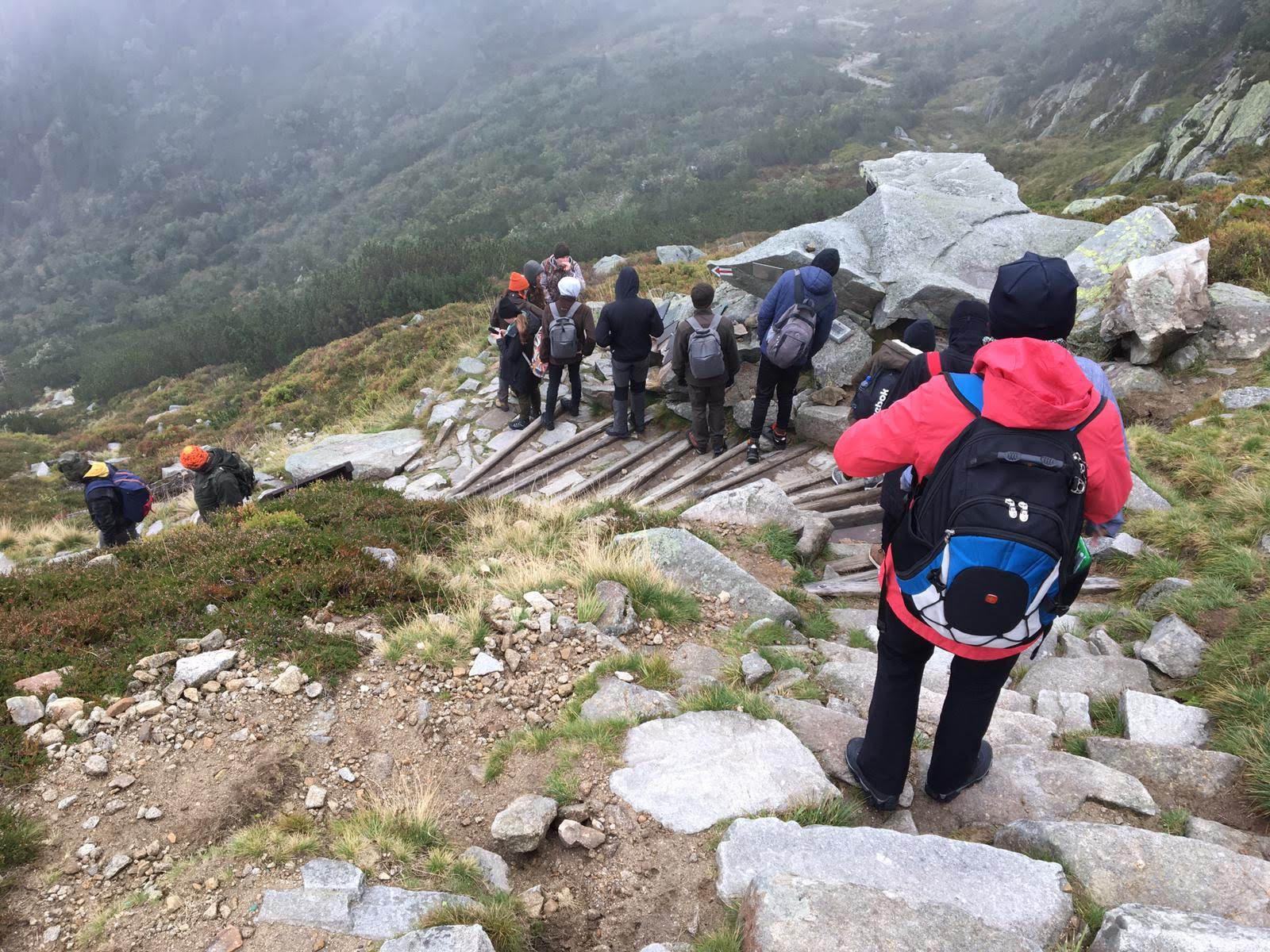 Kolejny dzień przywitał nas niestety paskudną pogodą. Ale cóż góry wzywały. Tym razem wybraliśmy się niebieskim szlakiem do Świątyni Wang – uważanej za najstarszy drewniany kościół w Polsce (widzieliśmy pismo runiczne). Przy kościelnym cmentarzu znajduje się grób wybitnego polskiego poety, dramaturga i scenarzysty Tadeusza Różewicza. Stamtąd mokrą i śliską kamienną ścieżką doszliśmy do położonego w kotle Małego Stawu schroniska Samotnia -jednego z najstarszych schronisk w Polsce! Początkowo była to mała, drewniana buda zamieszkiwana przez strażnika, który pilnował hodowanych w Małym Stawie pstrągów. Następnie trasą z pięknymi widokami doszliśmy do schroniska Strzecha Akademicka na wysokości 1258m n.p.m., które jest kolejnym z najstarszych w Karkonoszach, (z pięknie zdobionymi wnętrzami). Swoją nazwę zawdzięcza licznie przebywających w nim studentom. Następnie przechodząc przez Biały Jar (Nisza niwalna Białego Jaru – utworzona przez lodowiec ok. 10 mln lat temu. W XIX w. w Białym Jarze prowadzono prace górnicze, poszukiwano złota i wydobywano galenę z domieszką srebra), zatrzymaliśmy się przy pomniku Pamięci Ofiar Lawiny -20 marca 1968 r. (nazwana największą tragedią lawinową w polskich górach). Potem Śląską Drogą zeszliśmy pod Dziki Wodospad w Karpaczu. Podczas naszych wędrówek o historii, geografii i legendach tamtych terenów opowiadała nam pani Wiktoria Poniatowska -przewodnik sudecki. Na górskich szlakach czuwały nad nami panie: Anetta Świć i Marta Wołoncewicz.