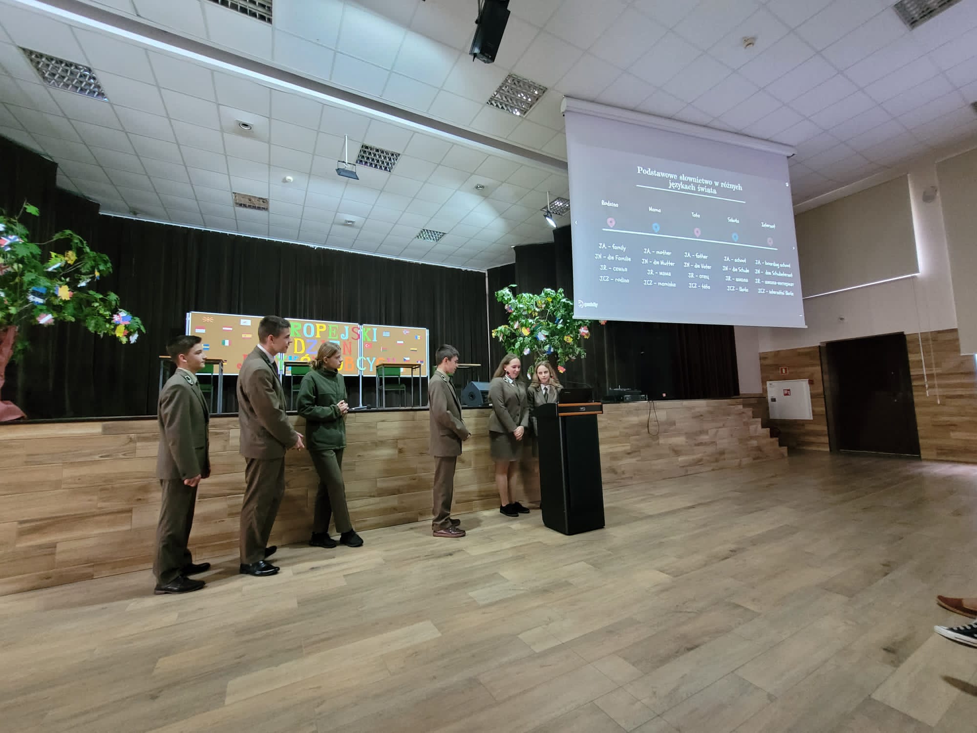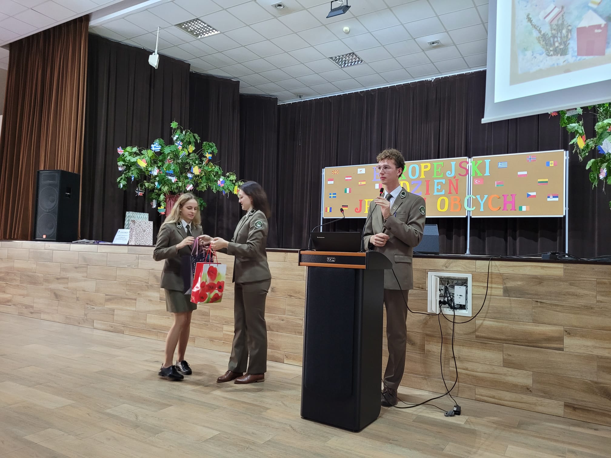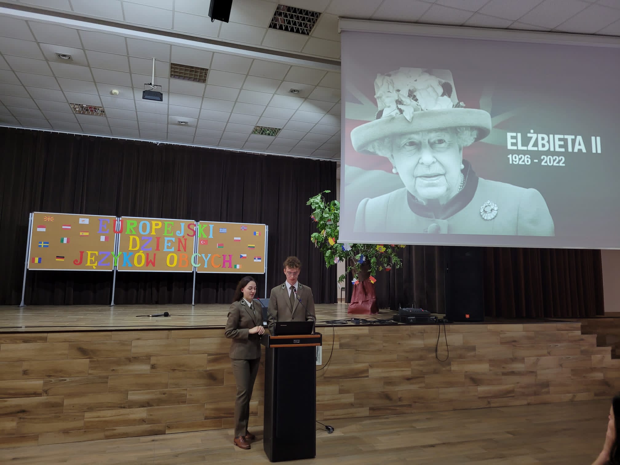 Uczennice klasy 3A Angelika Szpakowicz i Karolina Waszczuk przedstawiły bardzo interesującą prezentację o Językach obcych, przy czym odbyły się małe zawody czytania w języku Czeskim, z pewnością naszą szkolną mistrzynią tego języka była Pani Joanna Zamojska. Natomiast uczennice klasy 2A Julia Lipińska i Klaudia Skok zaprezentowały biografię Królowej Elżbiety II