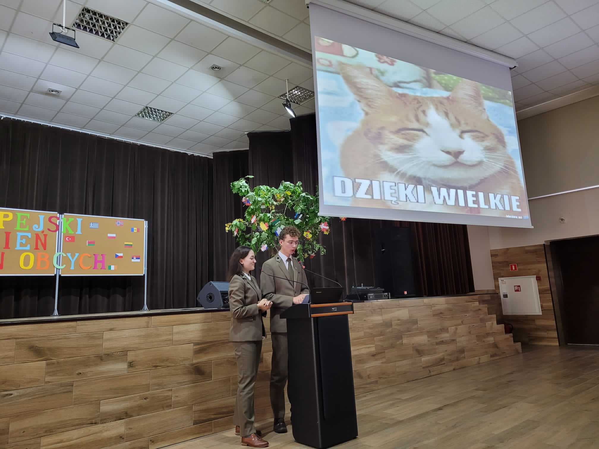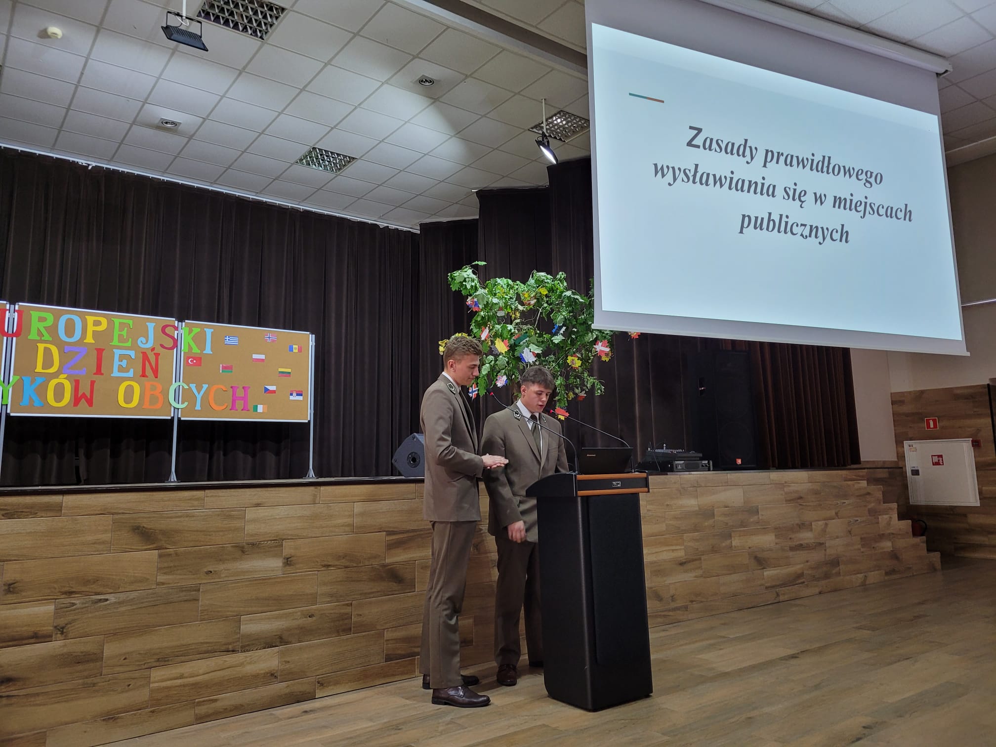 Pod koniec przedstawiciele Samorządu Uczniowskiego Jakub Kopańczyk i Jakub Złotkowski zaprezentowali prezentację o Kulturze Słowa, której celem było uświadomienie uczniów jak ważny jest dobór odpowiedniego słownictwa