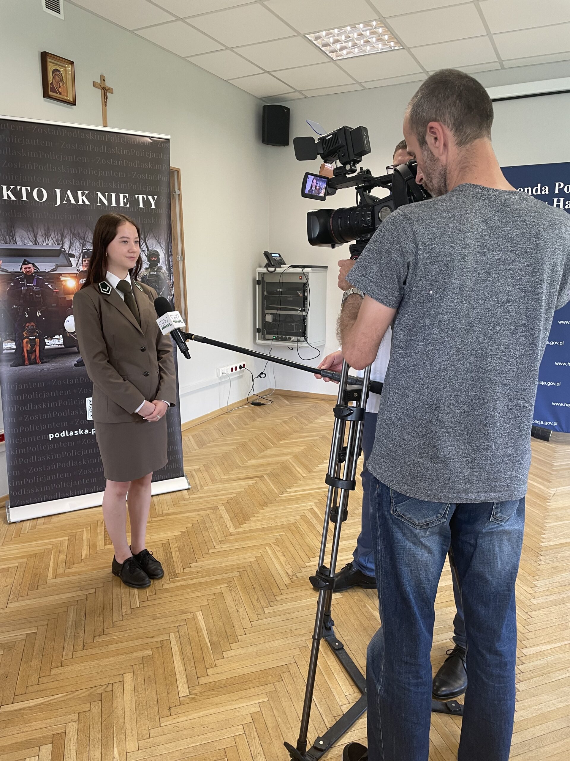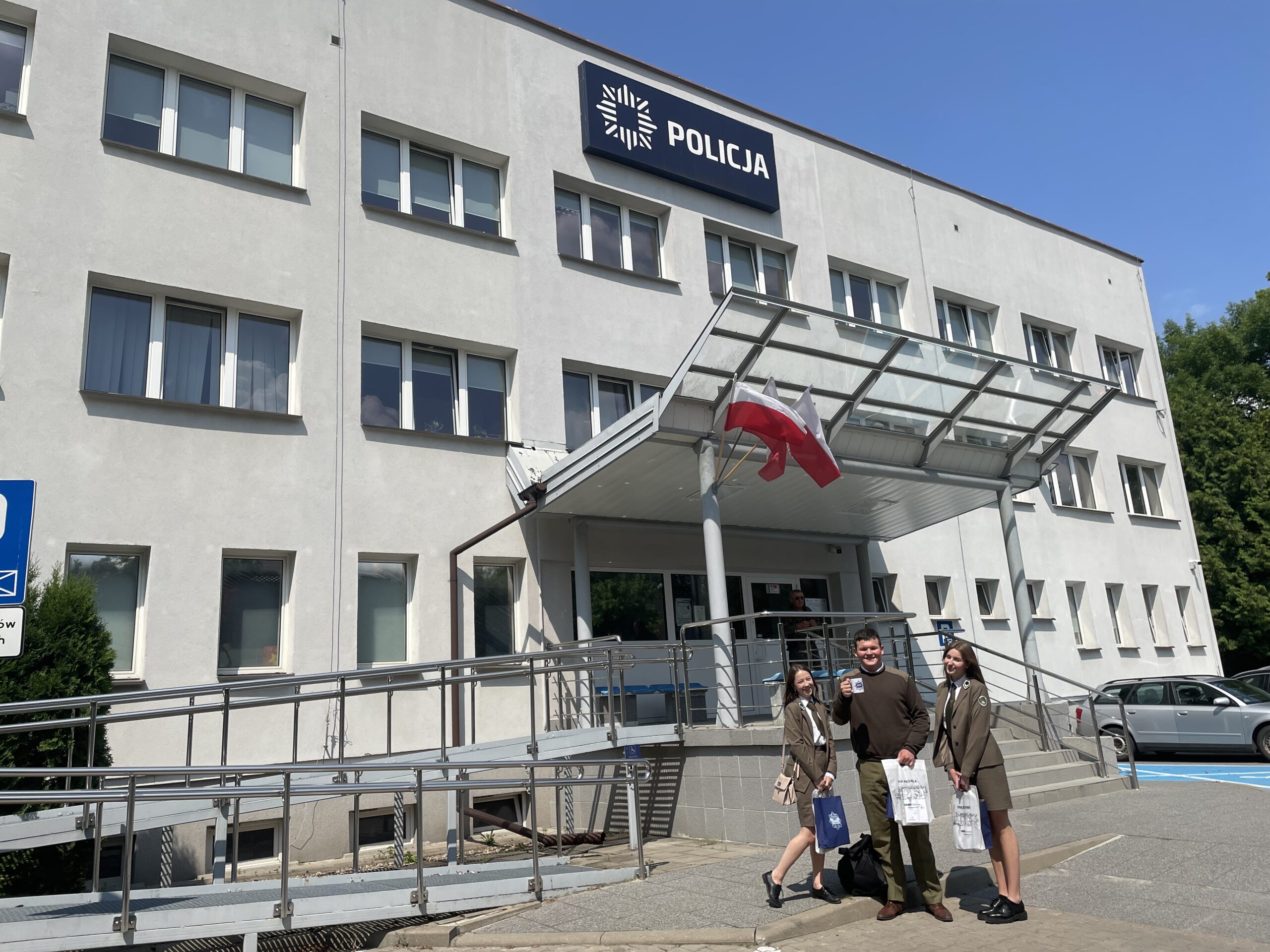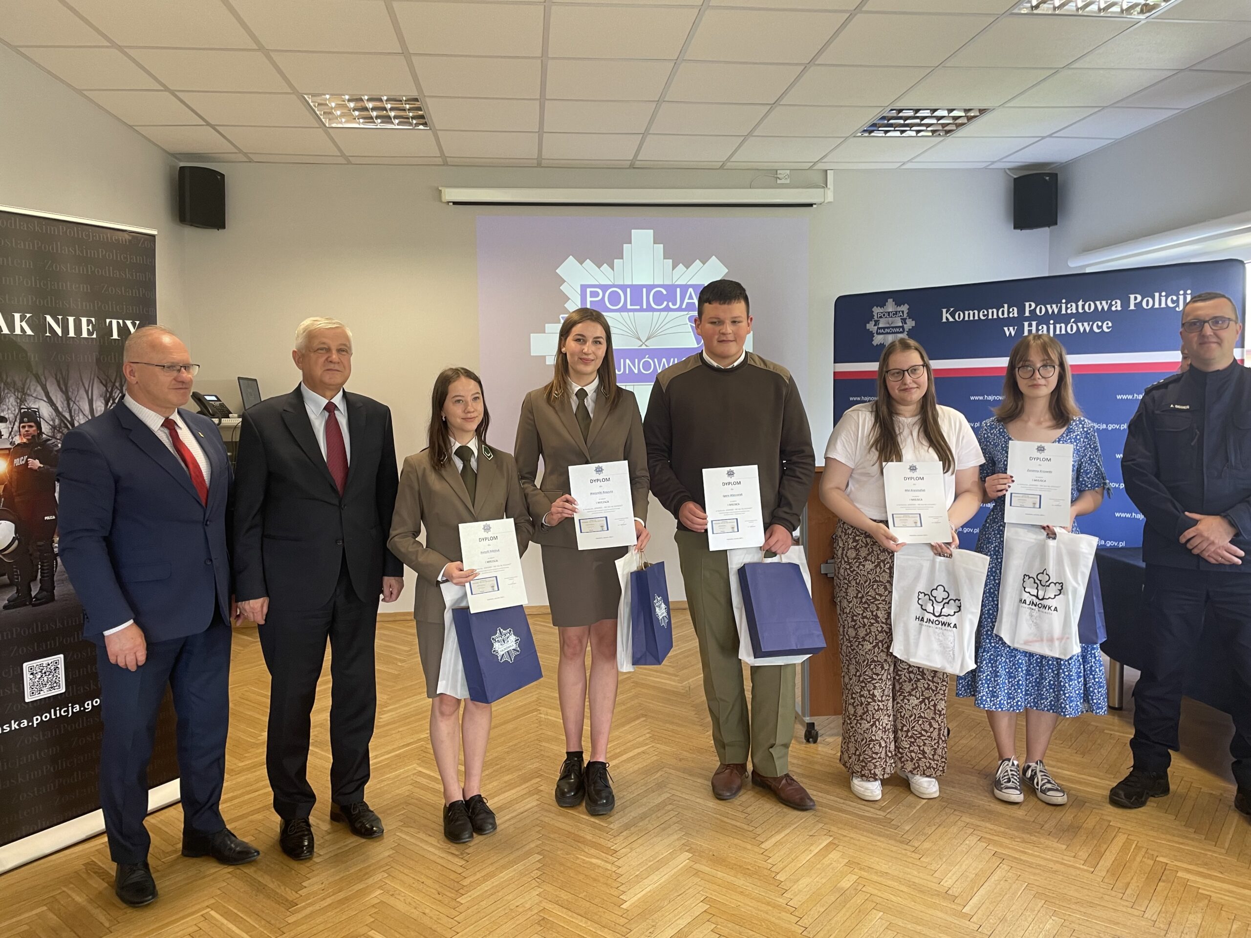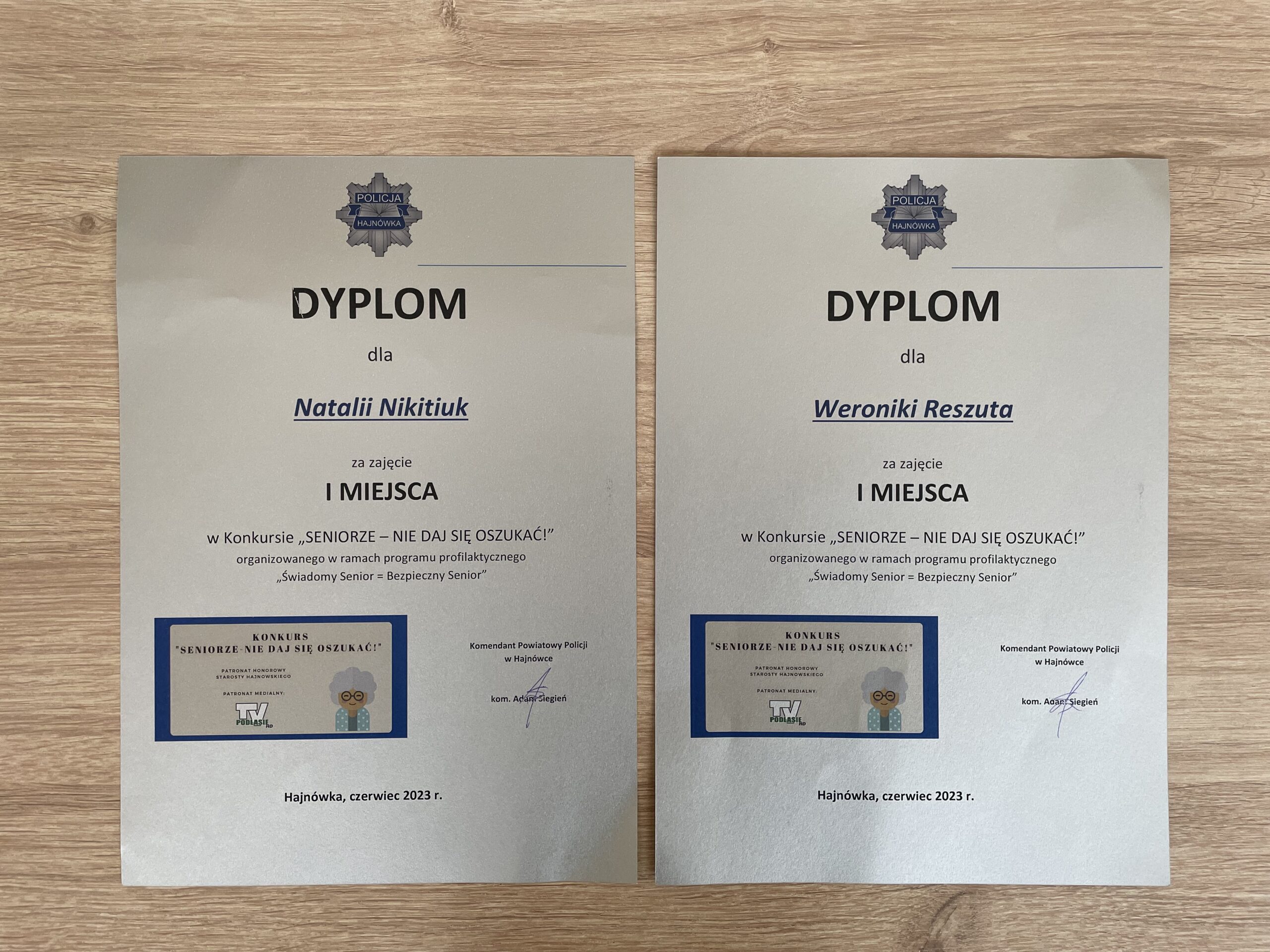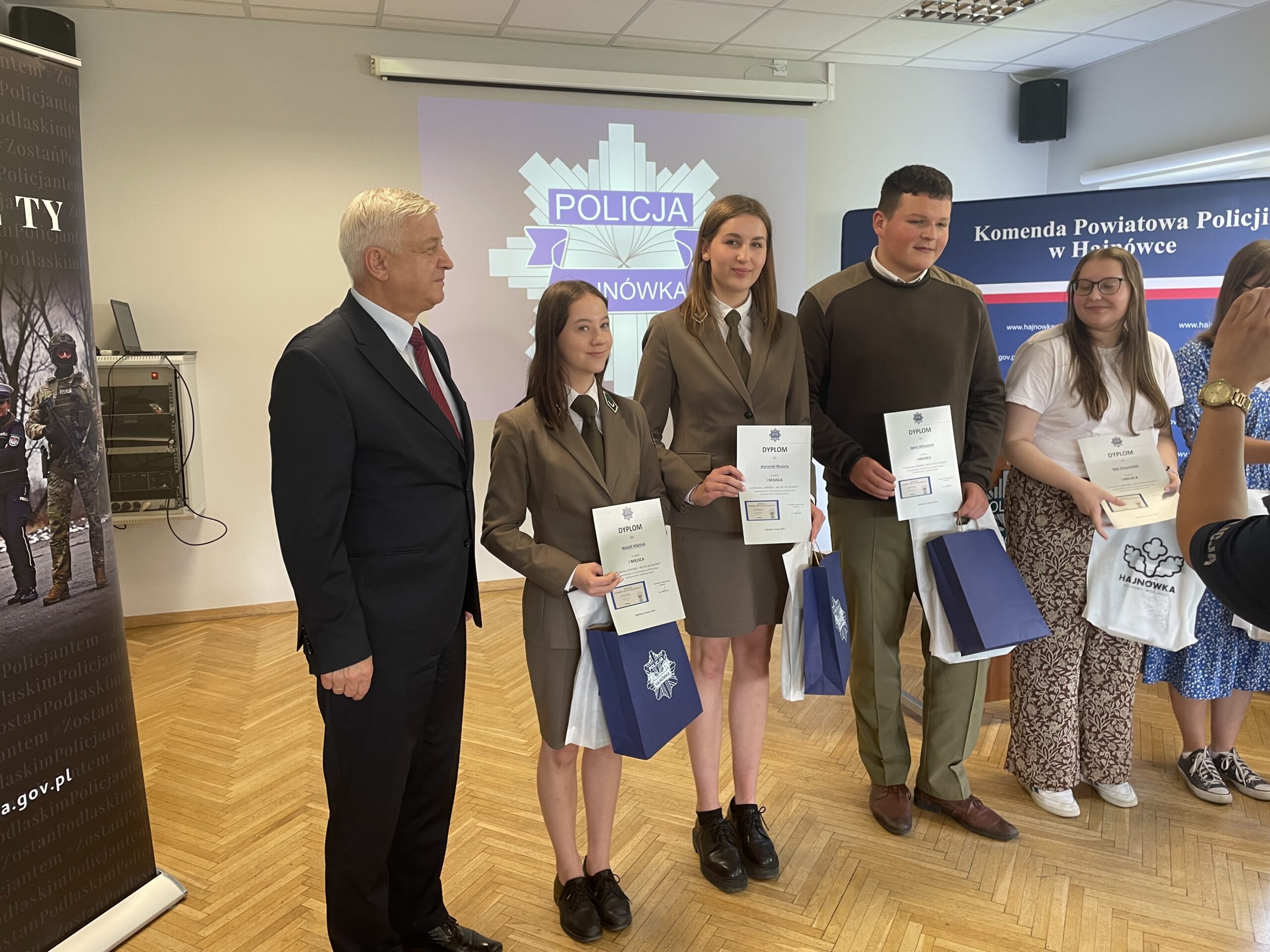 Dnia 20 czerwca 2023 r. uczniowie naszej szkoły w składzie: Weronika Reszuta kl. IIIa, Natalia Nikitiuk kl. IIIb oraz Igor Wieczorek kl. IVa uczestniczyli w uroczystym rozstrzygnięciu konkursu na autorski film profilaktyczny nt. „SENIORZE – NIE DAJ SIĘ OSZUKAĆ!” Przedsięwzięcie to było zorganizowane dla uczniów szkół ponadpodstawowych powiatu hajnowskiego przez Komendę Powiatową Policji w Hajnówce pod honorowym patronatem Starosty Hajnowskiego oraz patronatem medialnym TV Podlasie. Warunkiem uczestnictwa w konkursie było samodzielne, bądź grupowe wykonanie przez uczniów pracy audiowizualnej w dowolnym stylu np. scenki sytuacyjnej, krótkiego filmu, bądź spotu reklamowego (do 5 minut), promującego zasady bezpiecznego korzystania z nowych technologii przez seniorów oraz zapobieganie oszustwom dokonywanym w szczególności na starszych osobach. Miłym zaskoczeniem było to, iż spośród wszystkich nadesłanych filmów, potencjał naszych uczniów dostrzegło jury, nagradzając ich pracę 1 miejscem. W ramach dodatkowej nagrody nagranie zostanie również wyemitowane na antenie TV Podlasie dla mieszkańców Hajnówki i Bielska Podlaskiego. Będzie to także okazja do promocji naszej szkoły.