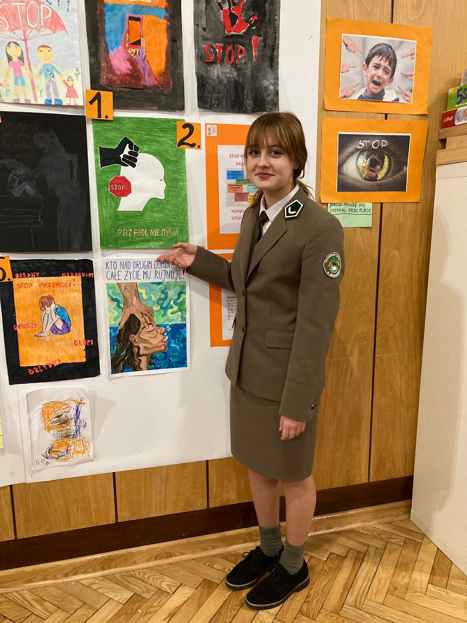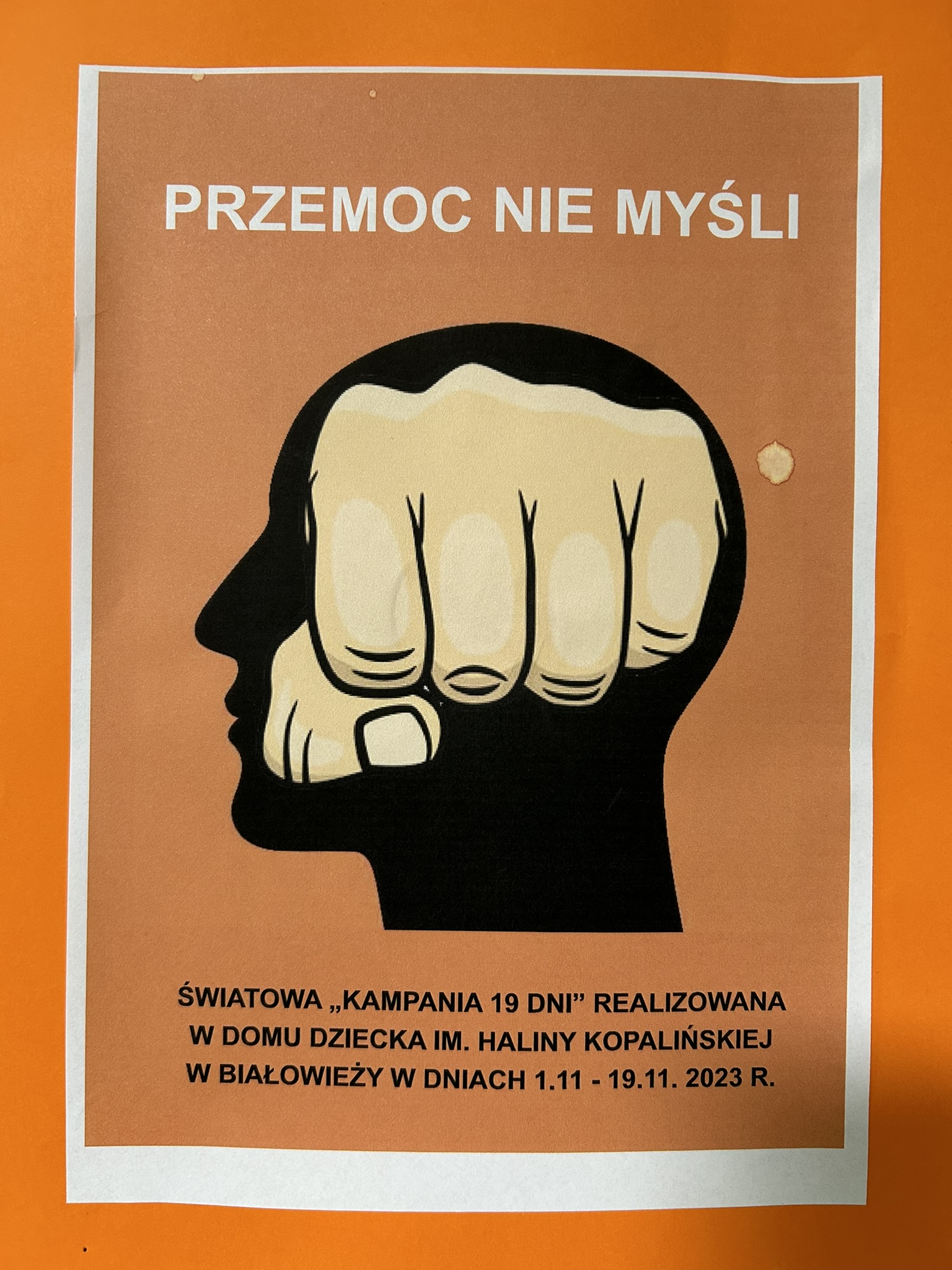 W tym roku uczniowie naszej szkoły po raz kolejny uczestniczyli w Kampanii „19 dni przeciwko przemocy dzieci i młodzieży”, projekcie społecznym realizowanym na całym świecie w dniach 1-19 listopada.  Młodzież  wzięła udział w warsztatach oraz konkursach plastycznym i fotograficznym „Stop przemocy” organizowanych przez Dom Dziecka w Białowieży w ramach Kampanii. Konkursy skierowane były do uczniów wszystkich szkół powiatu hajnowskiego i odbywały się w trzech kategoriach wiekowych.  W kategorii młodzież szkół średnich nasi uczniowie zdobyli: