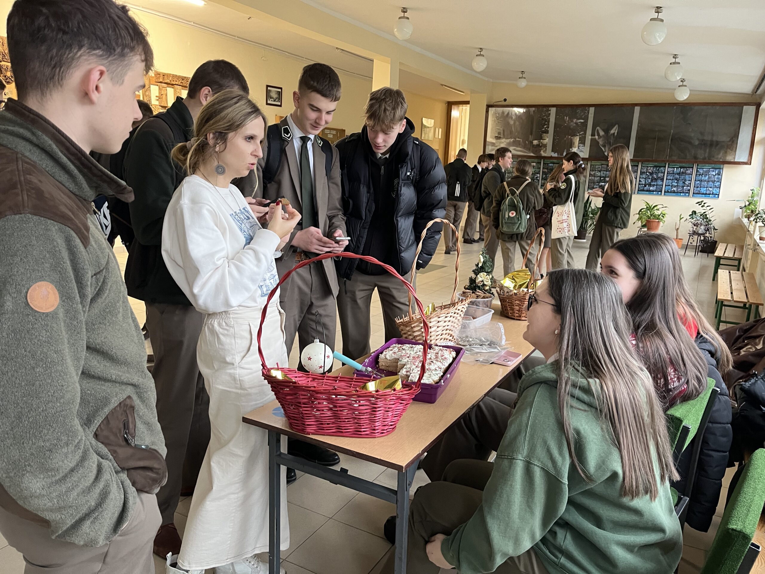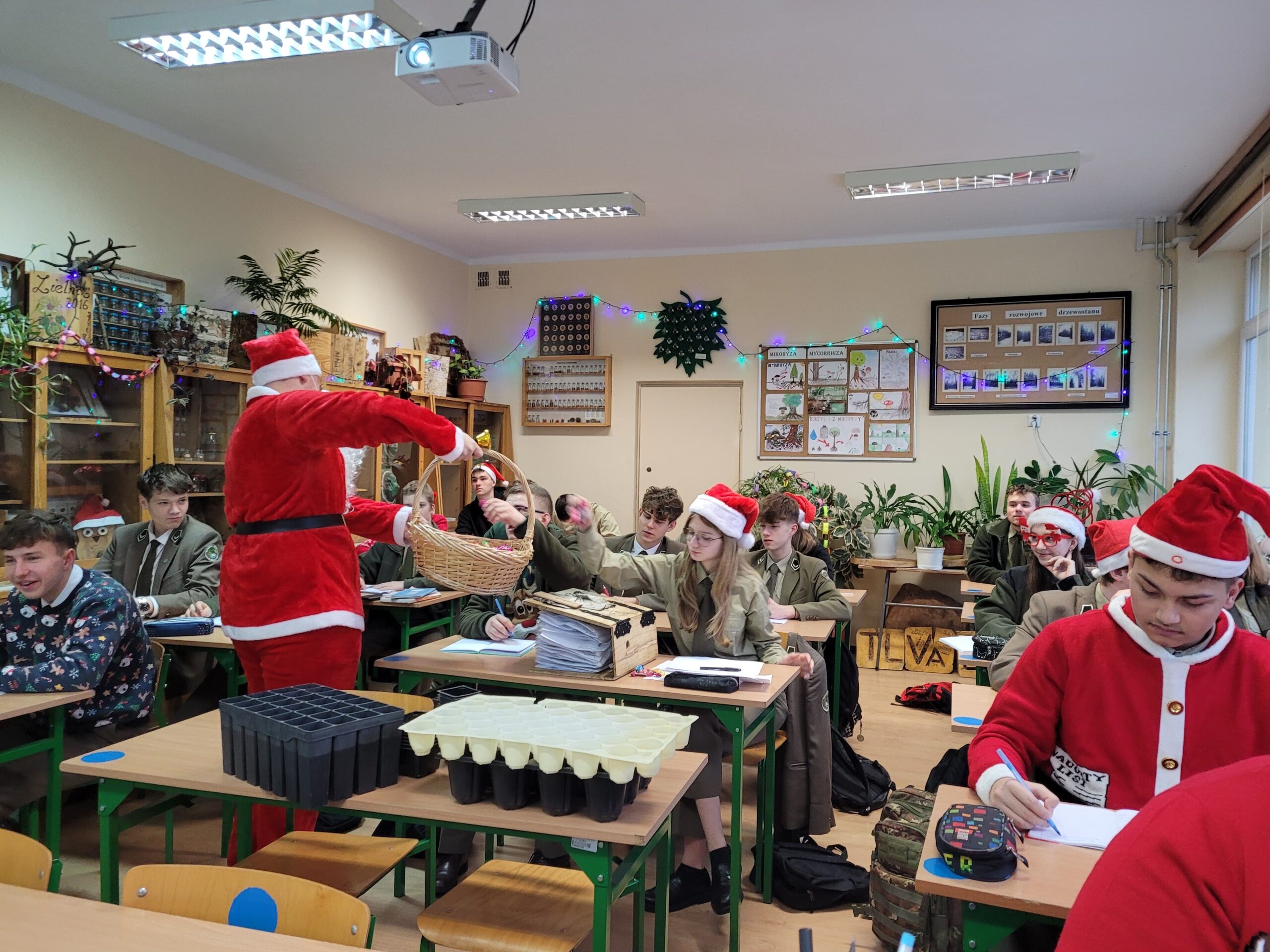 Mikołajki, to wyjątkowy dzień w roku, na który z pewnością czeka większość z nas. Dla wszystkich, to również dobra okazja, aby się trochę pośmiać i pobawić. Mikołajki w naszej szkole już na stałe wpisały się w kalendarium wydarzeń. W tym roku po raz kolejny poprzedzone zostały kiermaszem świątecznym, na którym Samorząd Uczniowski za drobne kwoty sprzedawał słodkości, które młodzież samodzielnie upiekła i własnoręcznie udekorowała. 6 grudnia poczuliśmy wszyscy po raz pierwszy prawdziwą magię świąt. Mikołajkowe szaleństwo ogarnęło wielu z nas – zarówno uczniów, jak i nauczycieli. W szkole pojawiły się pachnące choinki i Mikołaj ze swoją świtą. Były skarpety ze słodyczami, drobne upominki, słodycze, nawet rózgi dla niepokornych oraz dużo radości i uśmiechu. Tego dnia Mikołaj zajrzał do każdej klasy! Dotarł nawet do lasu, gdzie IV a odbywała zajęcia praktyczne!