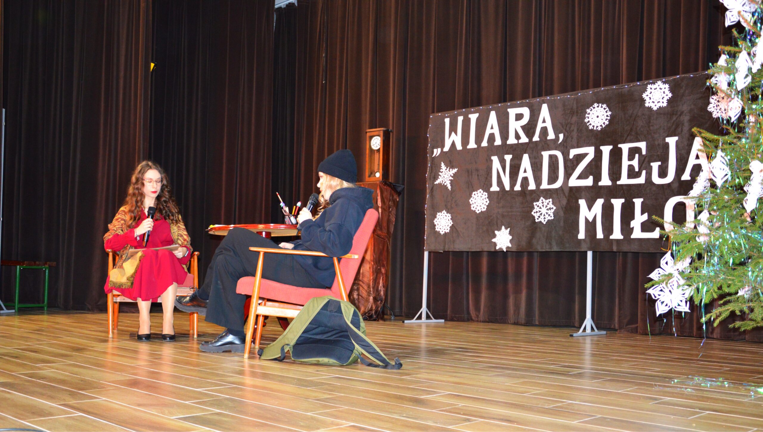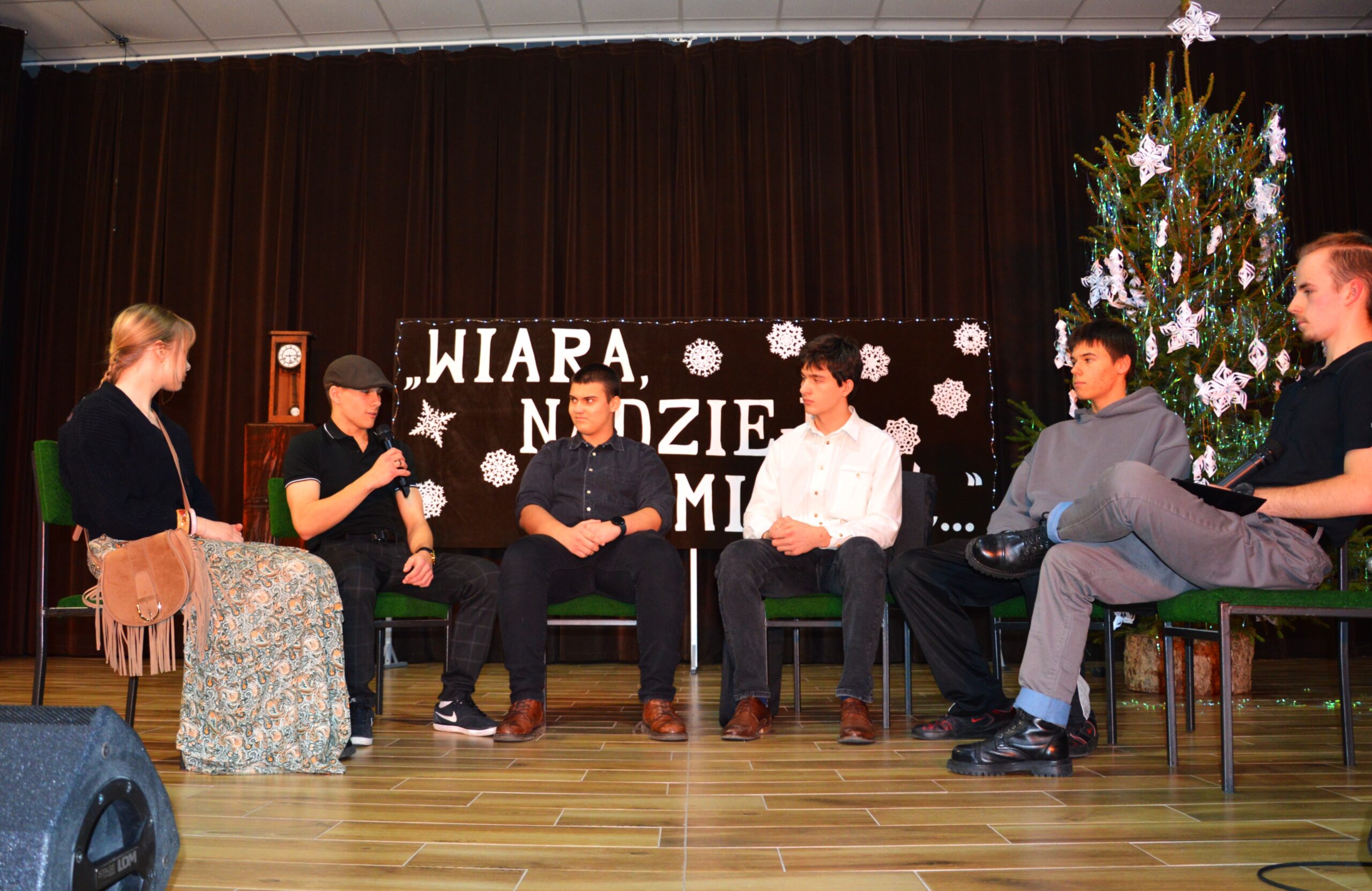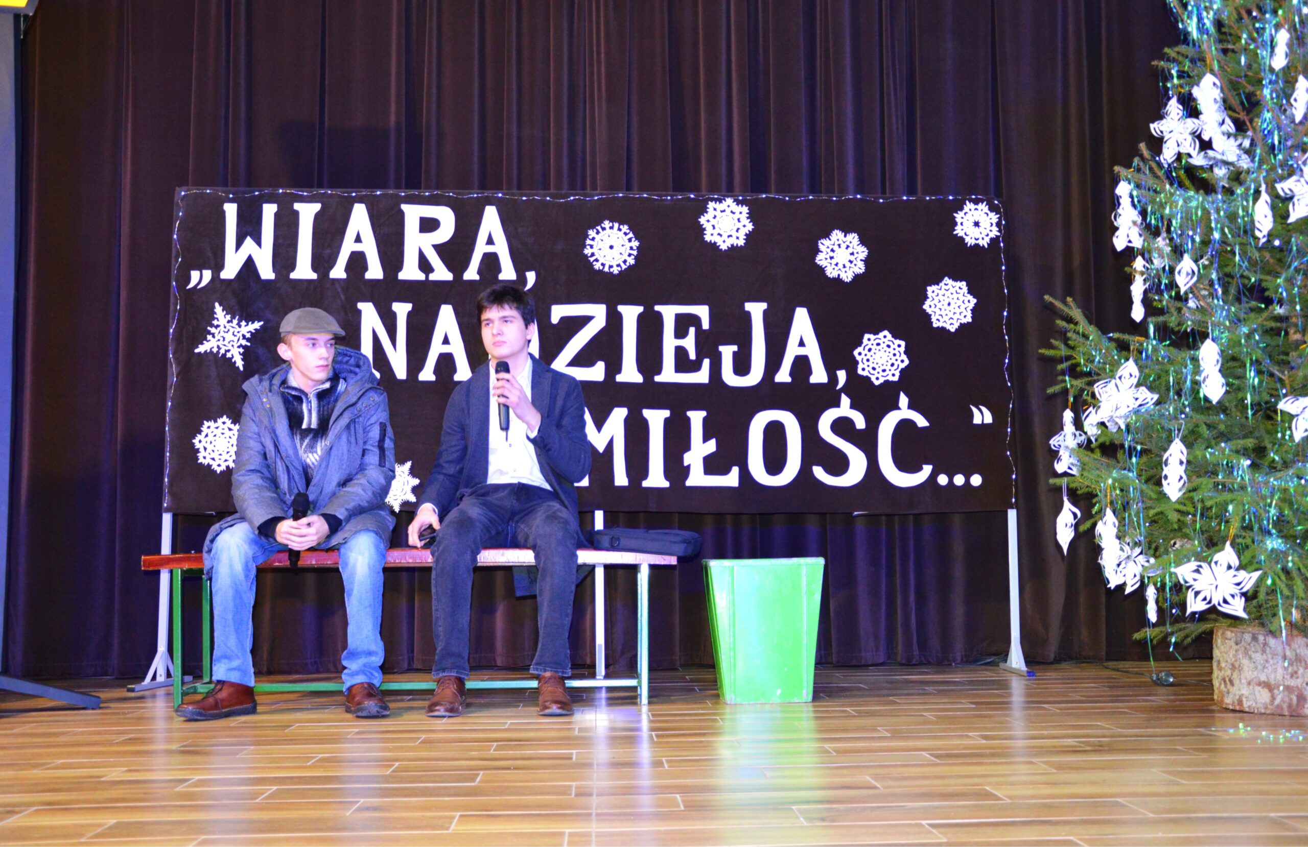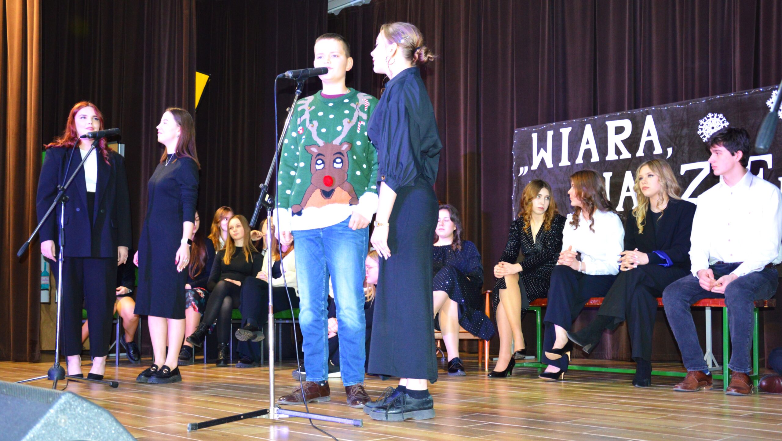 Część artystyczną szkolnej Wigilii, rozpoczęło przedstawienie w wykonaniu uczniów, przygotowane przez p. Dominikę Widanow-Świerszcz. Spektakl pt. „Wiara, nadzieja, miłość” dotyczył współczesnej rodziny. Inscenizacja przedstawiała krótkie scenki z życia bohaterów, zmagających się z trudami życia. Mogliśmy poznać między innymi sytuację rodziny, w której mąż i ojciec – Krzysztof, pozornie silny i odpowiedzialny – walczył z alkoholizmem, żona i matka – Anna – borykała się z ciężką chorobą, syn – Filip – walczył ze sobą, by móc przeciwstawić się propozycji zawodowej ojca i iść własną ścieżką kariery muzycznej, a córka Sara – w obawie przed reakcją rodziców- zwlekała ze szczerą rozmową o swojej orientacji. Zgodnie z myślą przewodnią zawartą w tytule spektaklu „Wiara nadzieja, miłość” rodzina doświadczyła magicznego pojednania i powrotu do uniwersalnych wartości, świąteczny czas to przecież czas cudów!