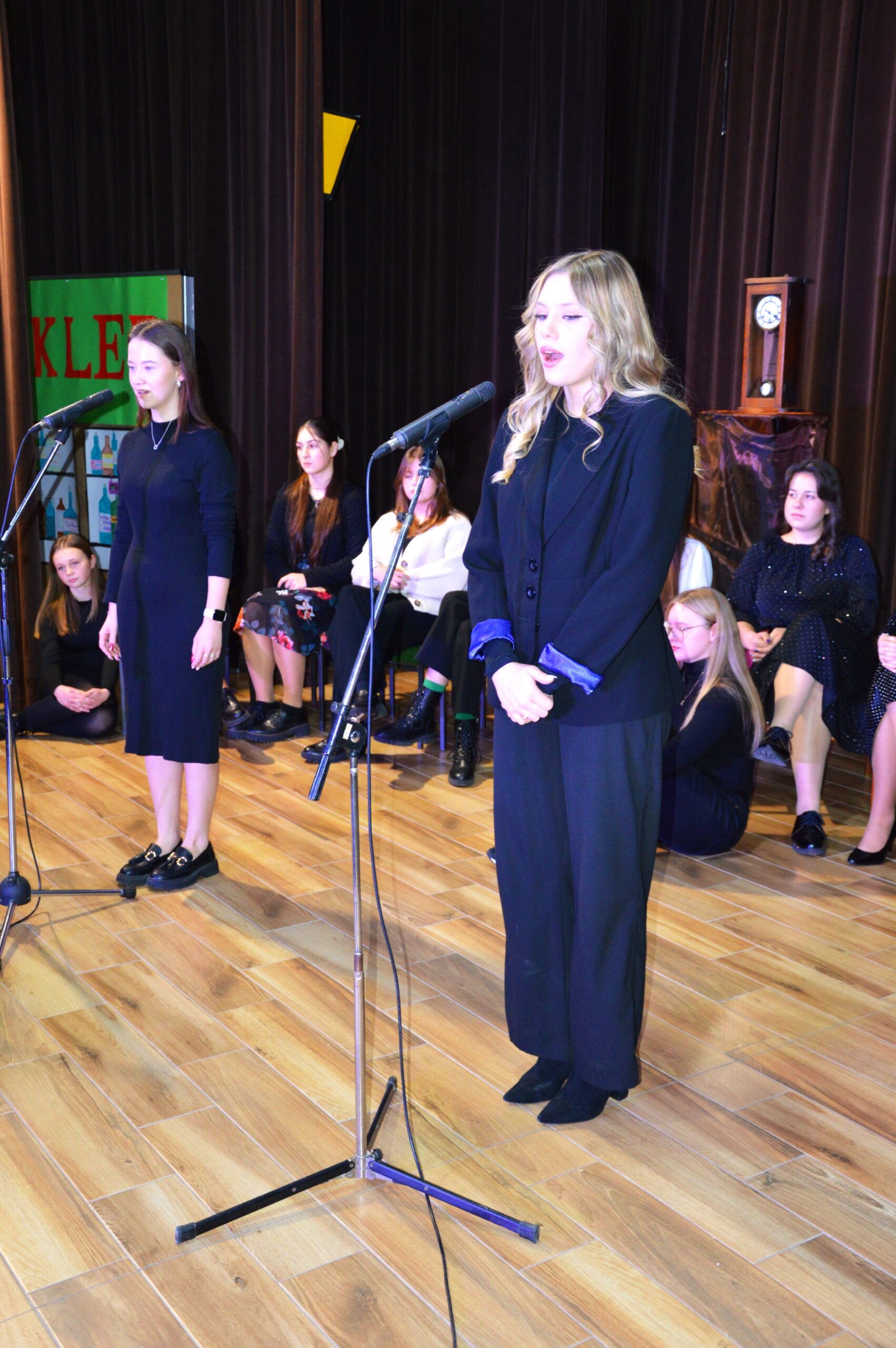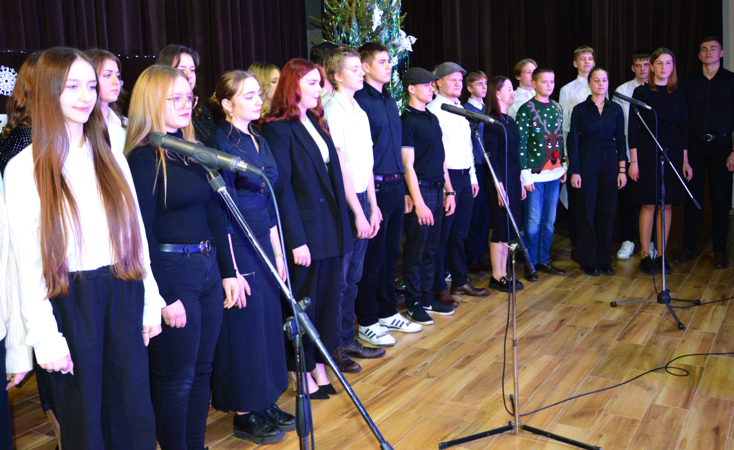 Kolejno przyszedł czas na koncert. Z wielką przyjemnością wysłuchaliśmy kolęd w wykonaniu naszego szkolnego chóru, prowadzonego przez p. Adama Masajło oraz Natalię Nikitiuk, uczennicę klasy 5b. Chór zaprezentował nam kolędy wykonane zarówno w języku polskim, białoruskim jak i ukraińskim. Nie zabrakło też kreatywności – elementów tańca, a także gry aktorskiej. Przepiękny śpiew wprowadził nas w magiczny, świąteczny nastrój.