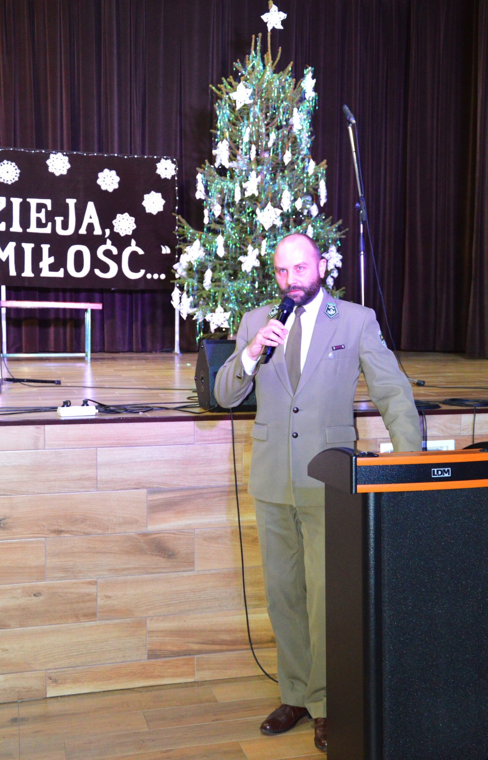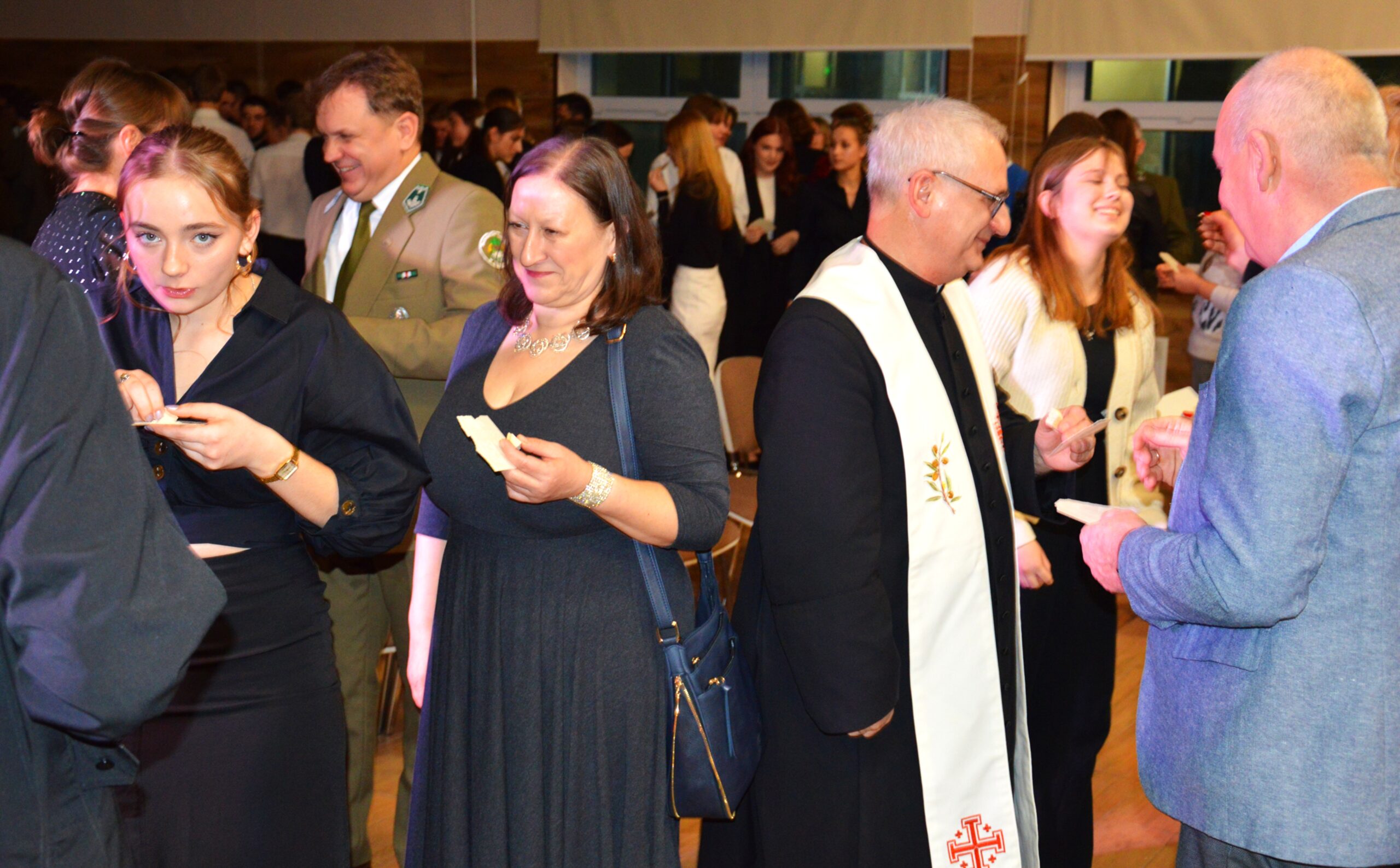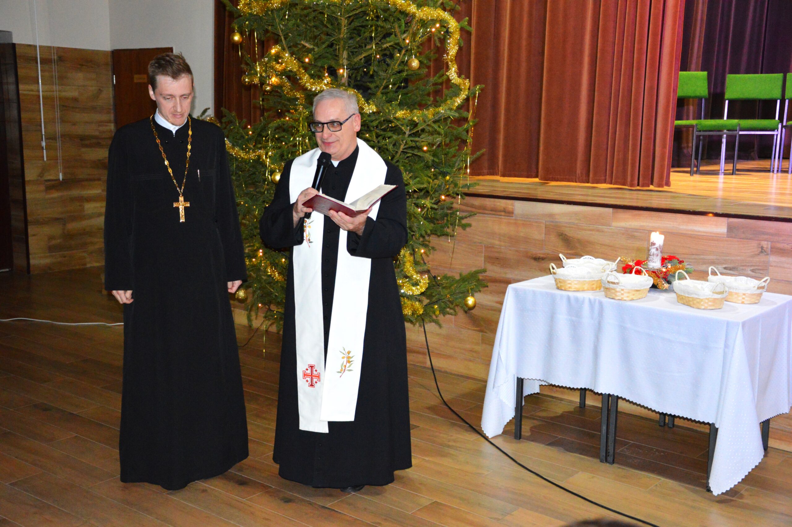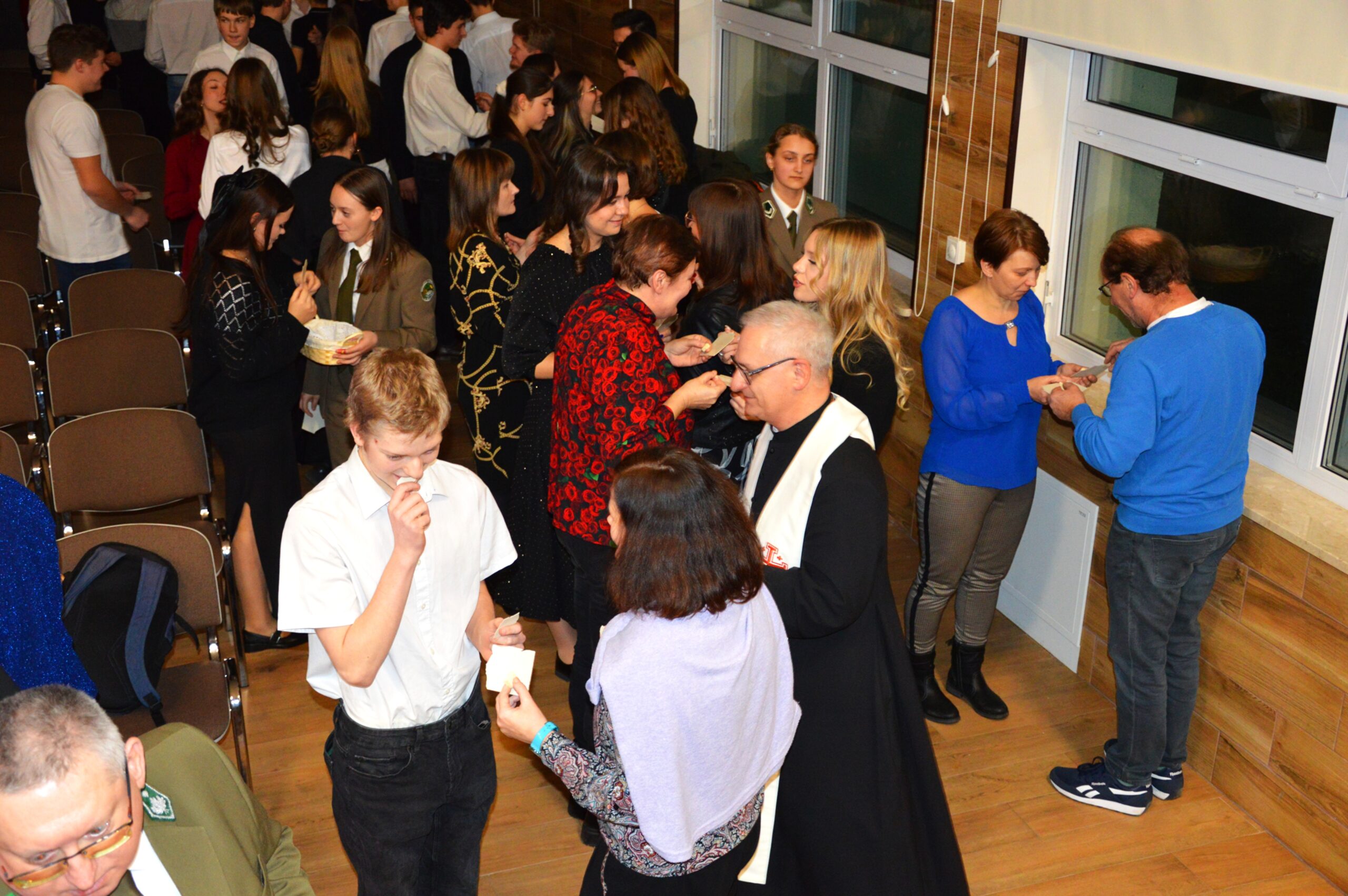 Po części artystycznej życzenia całej szkolnej społeczności przekazał Pan Dyrektor, Mariusz Tokajuk. Następnie głos zabrali księża – Andrzej Popławski oraz Tymoteusz Mikita Nazdryn, którzy odmówili modlitwy i złożyli świąteczne życzenia. Uczestnicy spotkania tradycyjnie podzielili się opłatkiem i prosforą, składając sobie świąteczno-noworoczne życzenia.