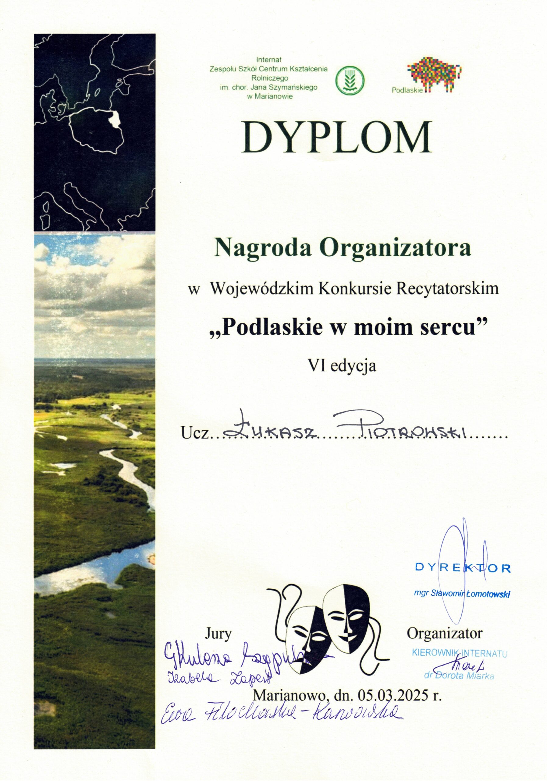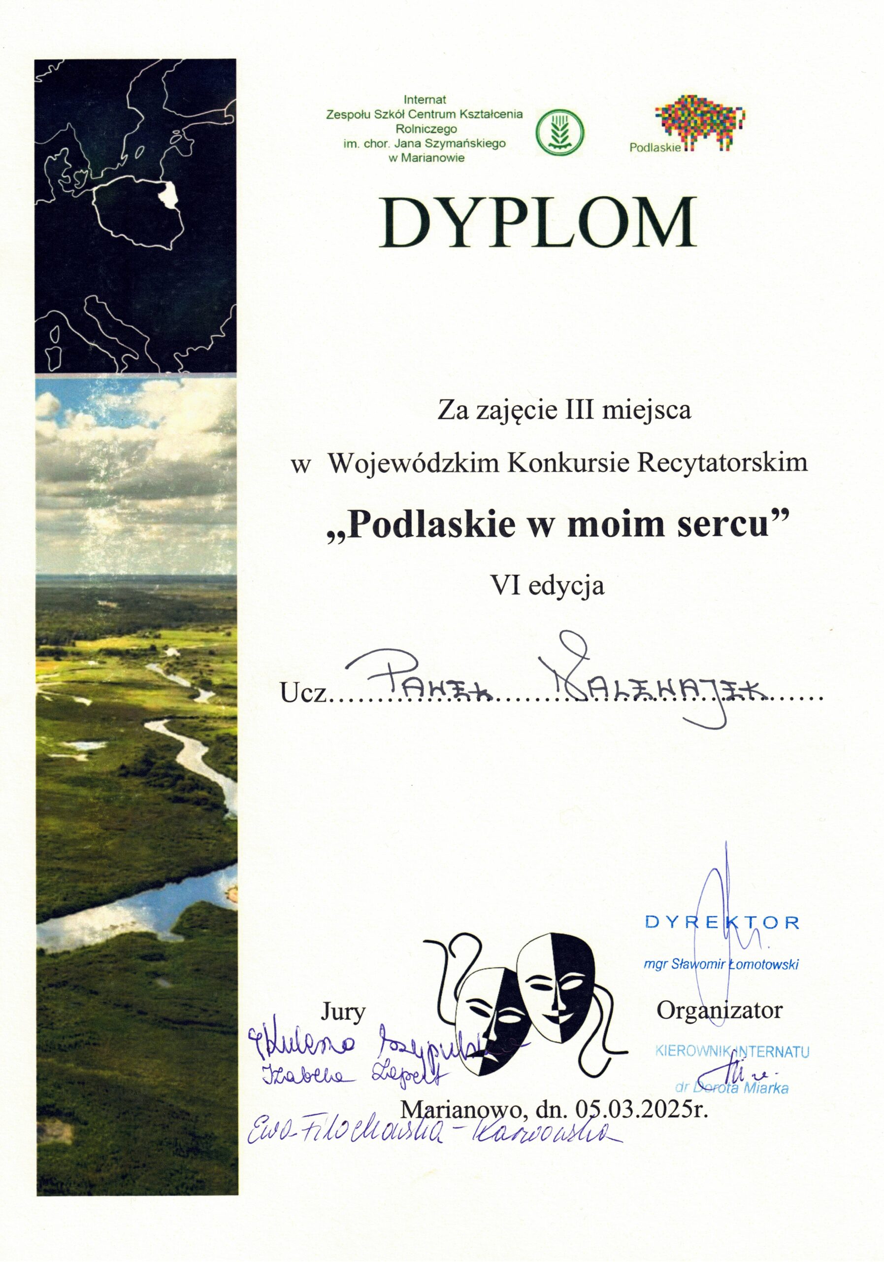 Z radością informujemy, że wychowankowie Internatu Technikum Leśnego w Białowieży odnieśli znaczące sukcesy w Wojewódzkim Konkursie Recytatorsko-Fotograficznym „Podlaskie w moim sercu” edycja VI.