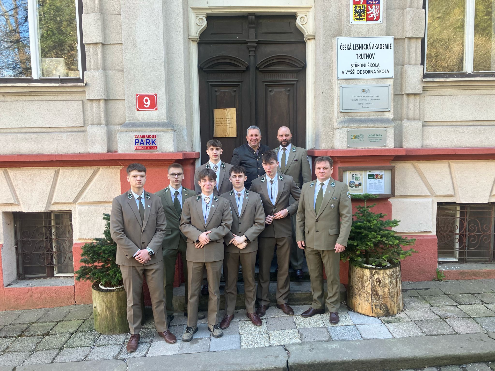 Jadąc na konkurs po drodze mieliśmy okazję zobaczyć jedną z 6 czeskich szkół leśnych – w Trutnovie, położoną w pobliżu granicy z Polską. Szkoła ta kształci obecnie około 700 uczniów. W jej skład wchodzą: szkoła branżowa, technikum, szkoła policealna oraz uczelnia wyższa. Placówka dysponuje własnym 1000 hektarowym leśnictwem, szkółką leśną i świetnym zapleczem technicznym. Jest jednym z 3 europejskich centrów kształcenia operatorów forwaderów i harwesterów. Działają też psiarnia i sokolarnia, które zlokalizowane są w szkolnym arboretum obok internatu.