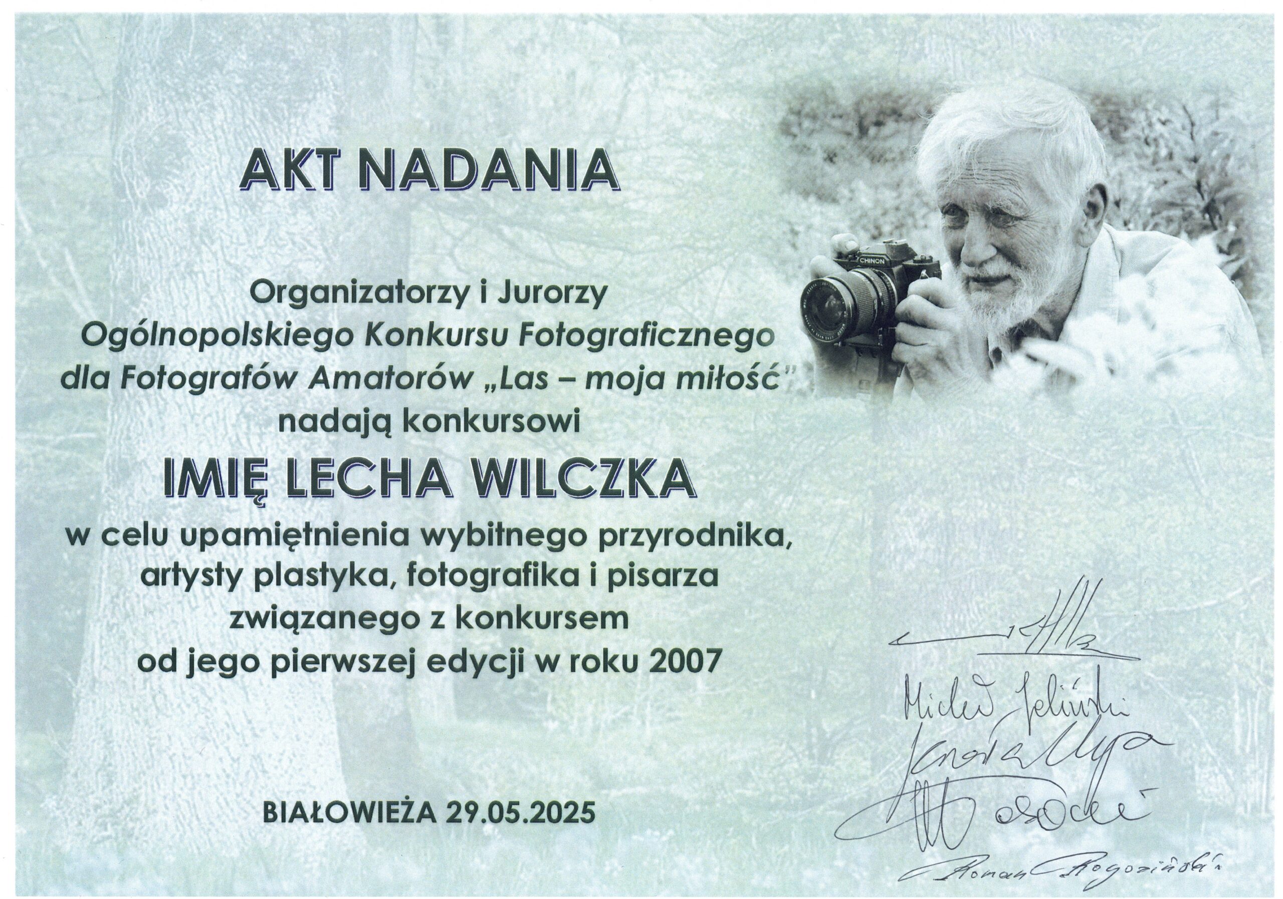 Na wniosek organizatorów i jurorów konkursu nastąpiło uroczyste nadanie Ogólnopolskiemu Konkursowi Fotograficznemu dla Fotografów Amatorów „Las – moja miłość” – IMIENIA LECHA WILCZKA – wybitnego przyrodnika, artysty plastyka, fotografika i pisarza związanego z konkursem od pierwszej edycji.