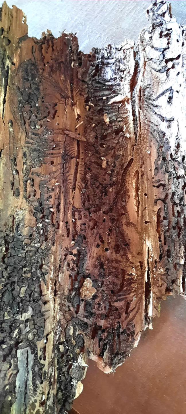 - pokryte jest brunatnymi trocinkami wyrzucanymi z drążonych korytarzy