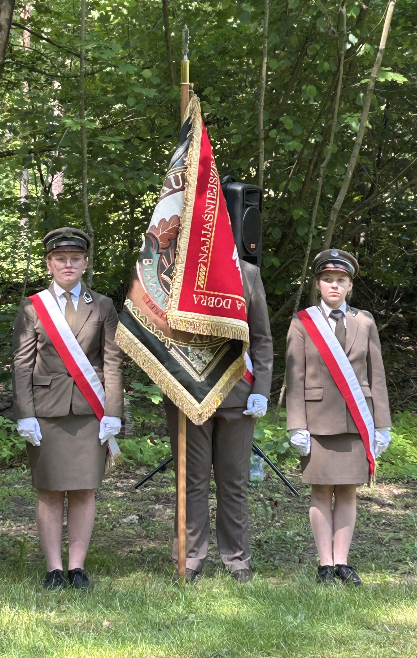 Kolejnym punktem uroczystości było uczczenie pamięci i oddanie hołdu leśnikom, którzy zginęli w walkach o niepodległość. Delegacje w tym parlamentarzyści, przedstawiciele Lasów Państwowych, samorządowcy, służby mundurowe, nasza szkoła złożyły kwiaty i znicze pod Pomnikiem Leśników. Następnie poczty sztandarowe oraz uczestnicy udali się pod ołtarz polowy, gdzie odprawiono Mszę Świętą. Eucharystii przewodniczył Ksiądz Biskup Jerzy Mazur, biskup ełcki. Po Mszy Świętej złożono kwiaty pod pomnikiem Jana Pawła II,