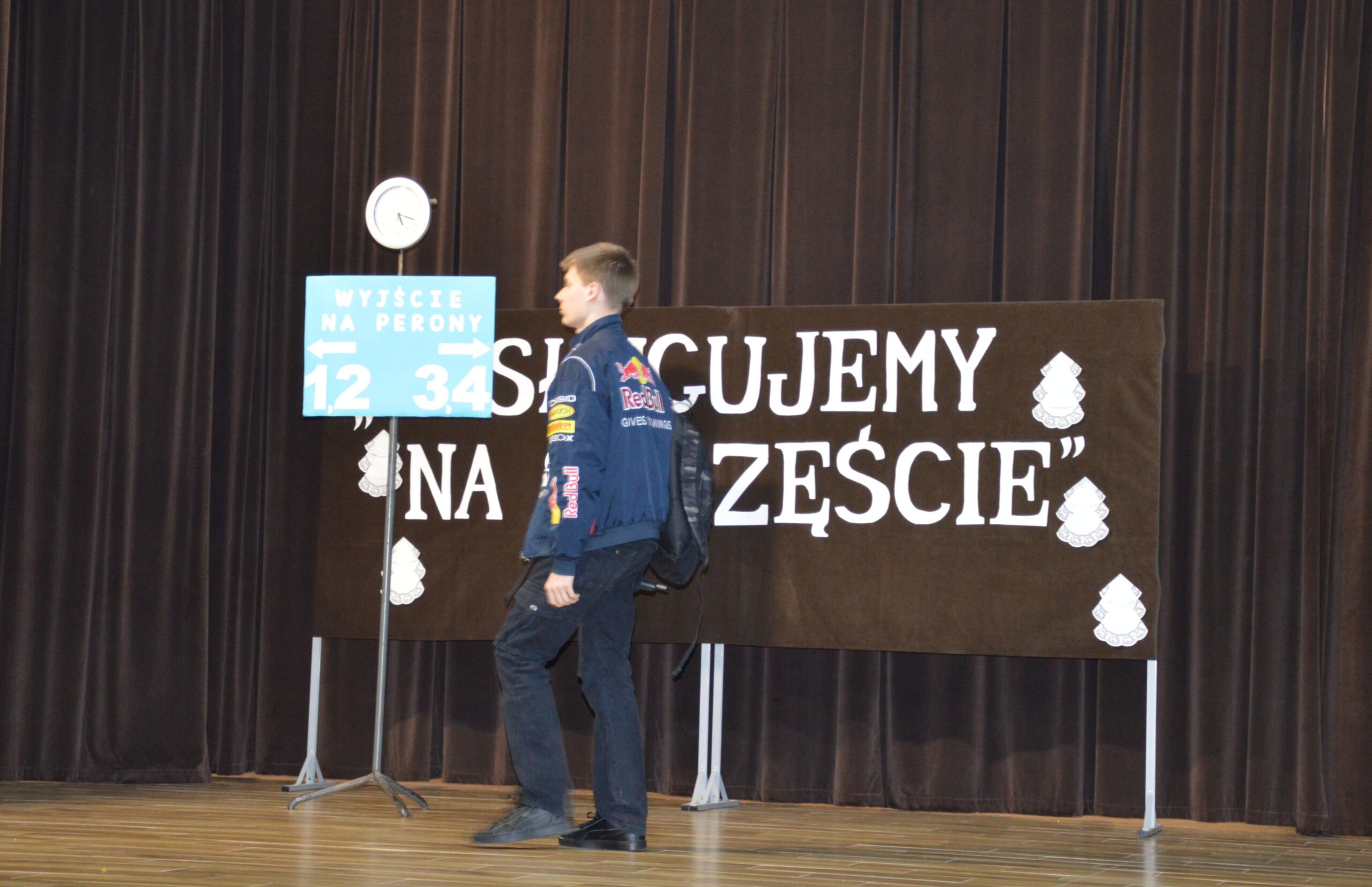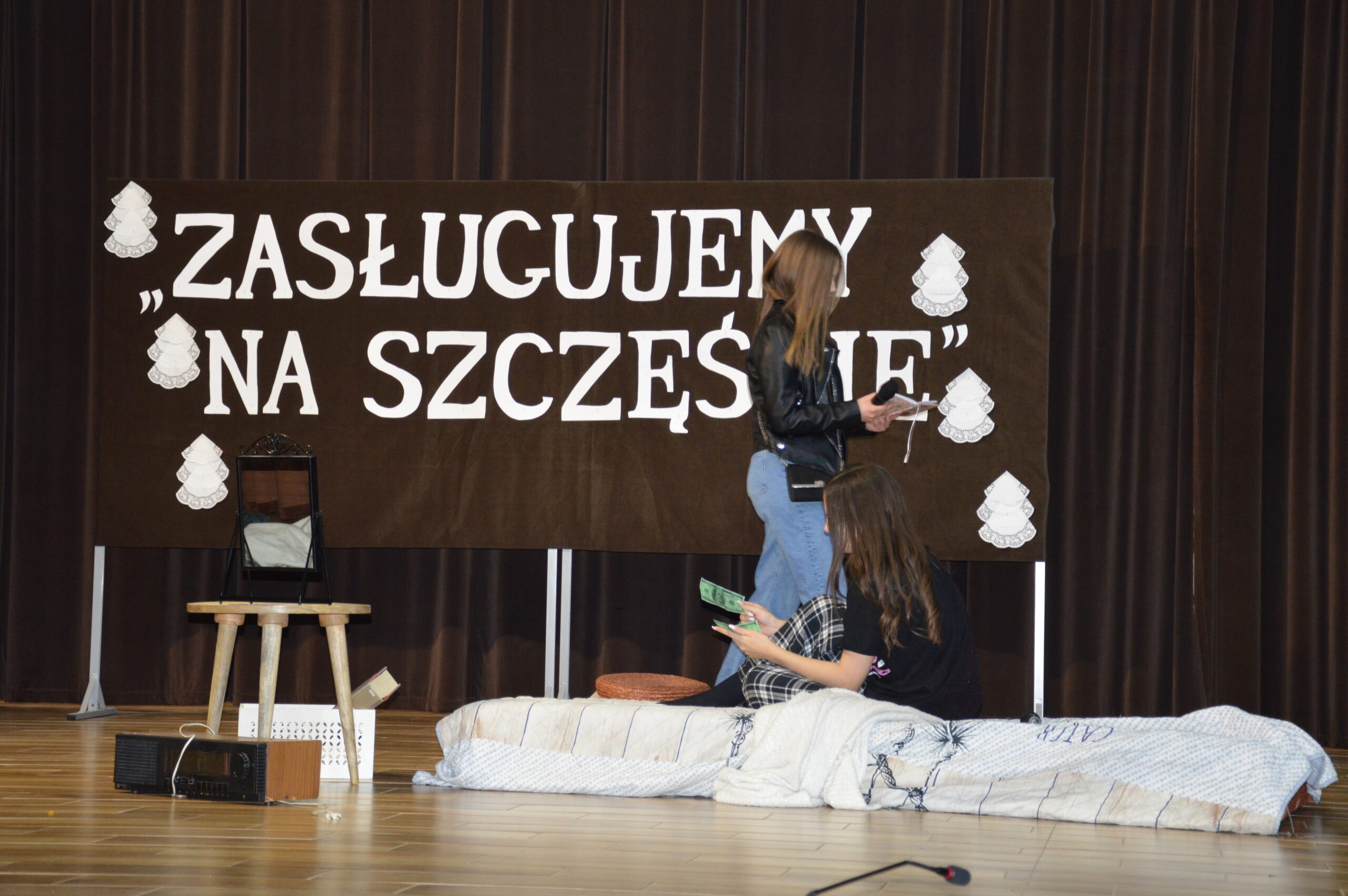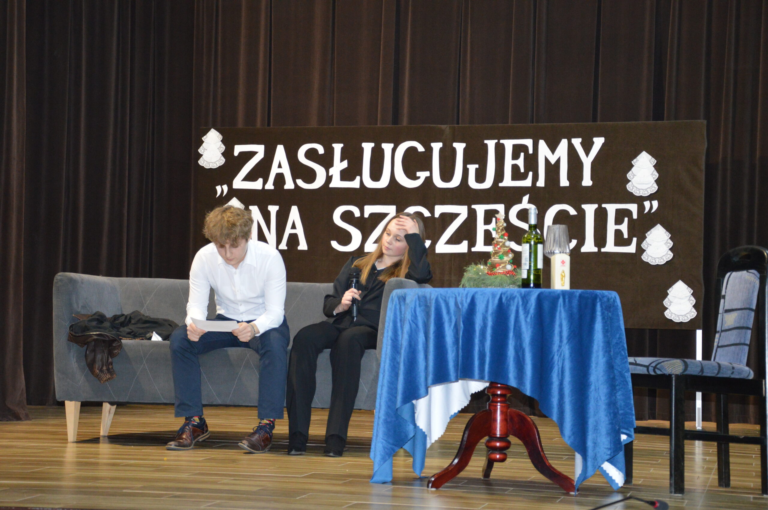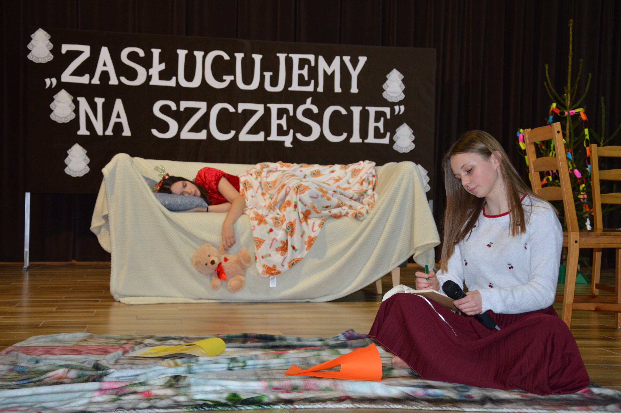 Część artystyczną szkolnej Wigilii, rozpoczęło przedstawienie w wykonaniu uczniów, przygotowane przez p. Dominikę Widanow-Świerszcz. Spektakl pt. ” Zasługujemy na szczęście”. Zgodnie z tytułem inscenizacja odwoływała się do fundamentalnej potrzeby prawdziwego szczęścia, na które zasługuje każdy z nas. Historia przedstawiała losy rodziny, która wbrew planom i marzeniom, pogubiła się, zapominając o wierze, tradycji, miłości. Dawniejsze – być, zastąpiło współczesne – mieć. Na szczęście dzięki mądrości i wrażliwości młodego pokolenia – córki i jej chłopaka – utracone wartości udało się wskrzesić i zbudować prawdziwe szczęście.