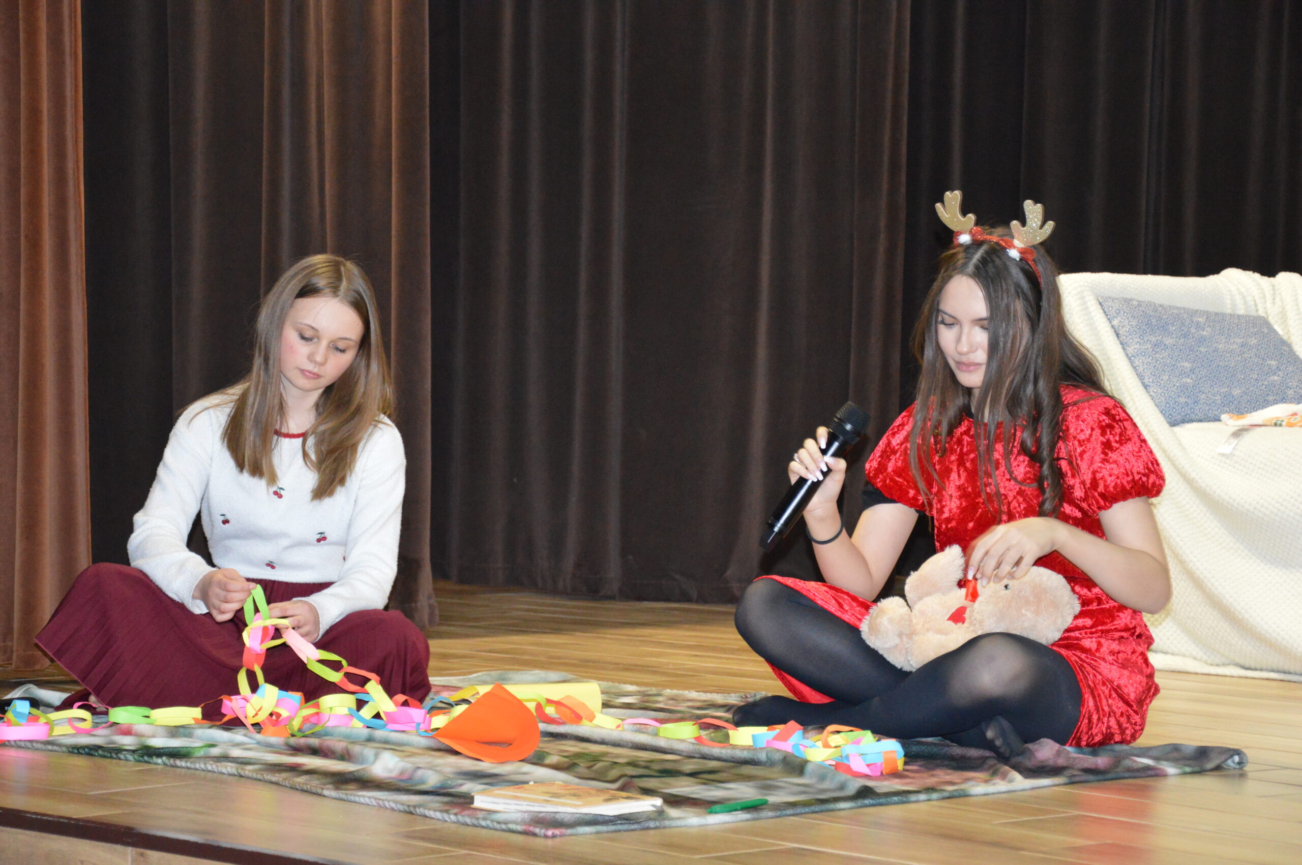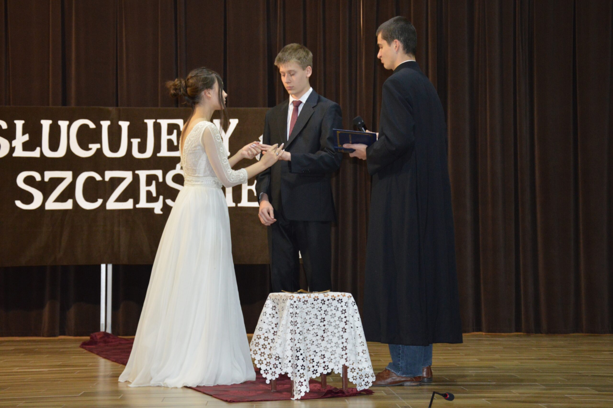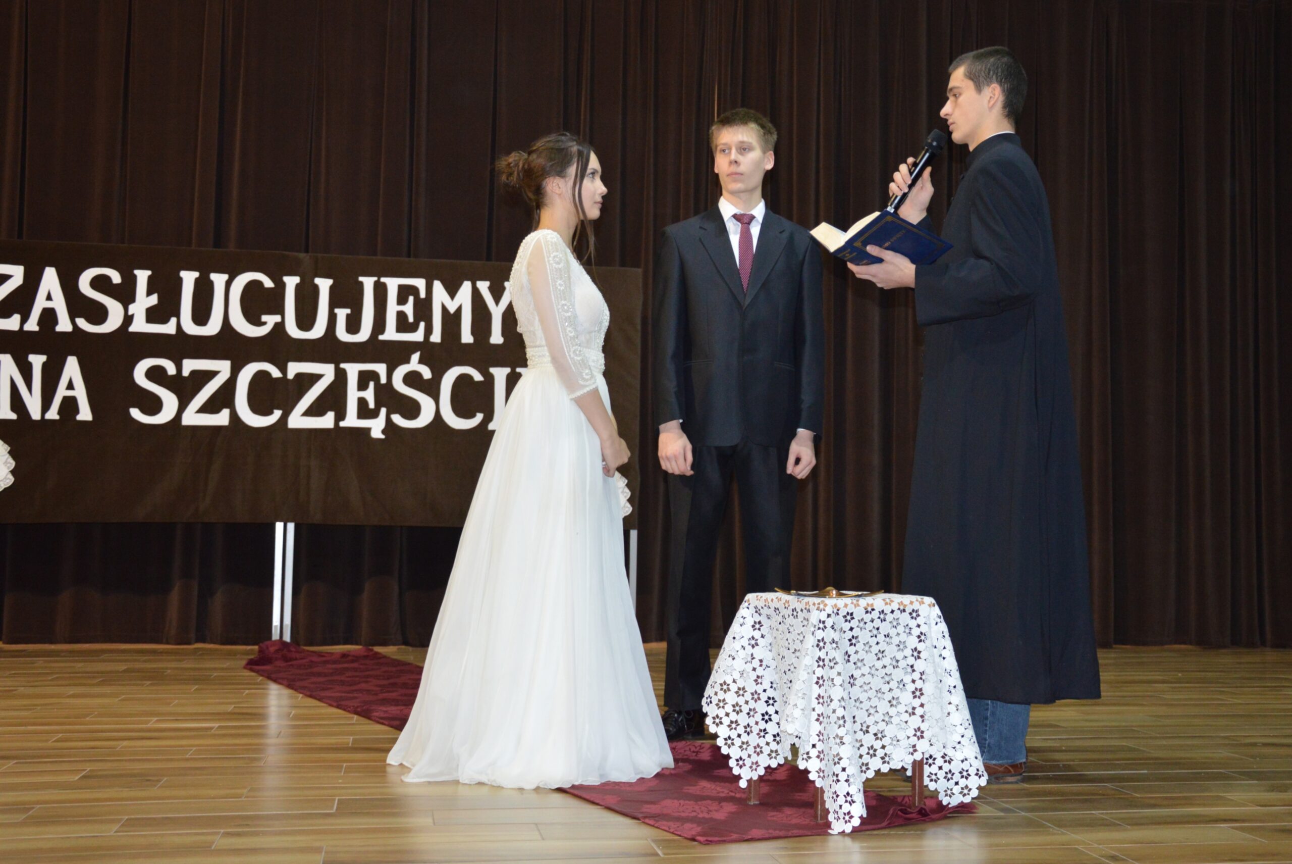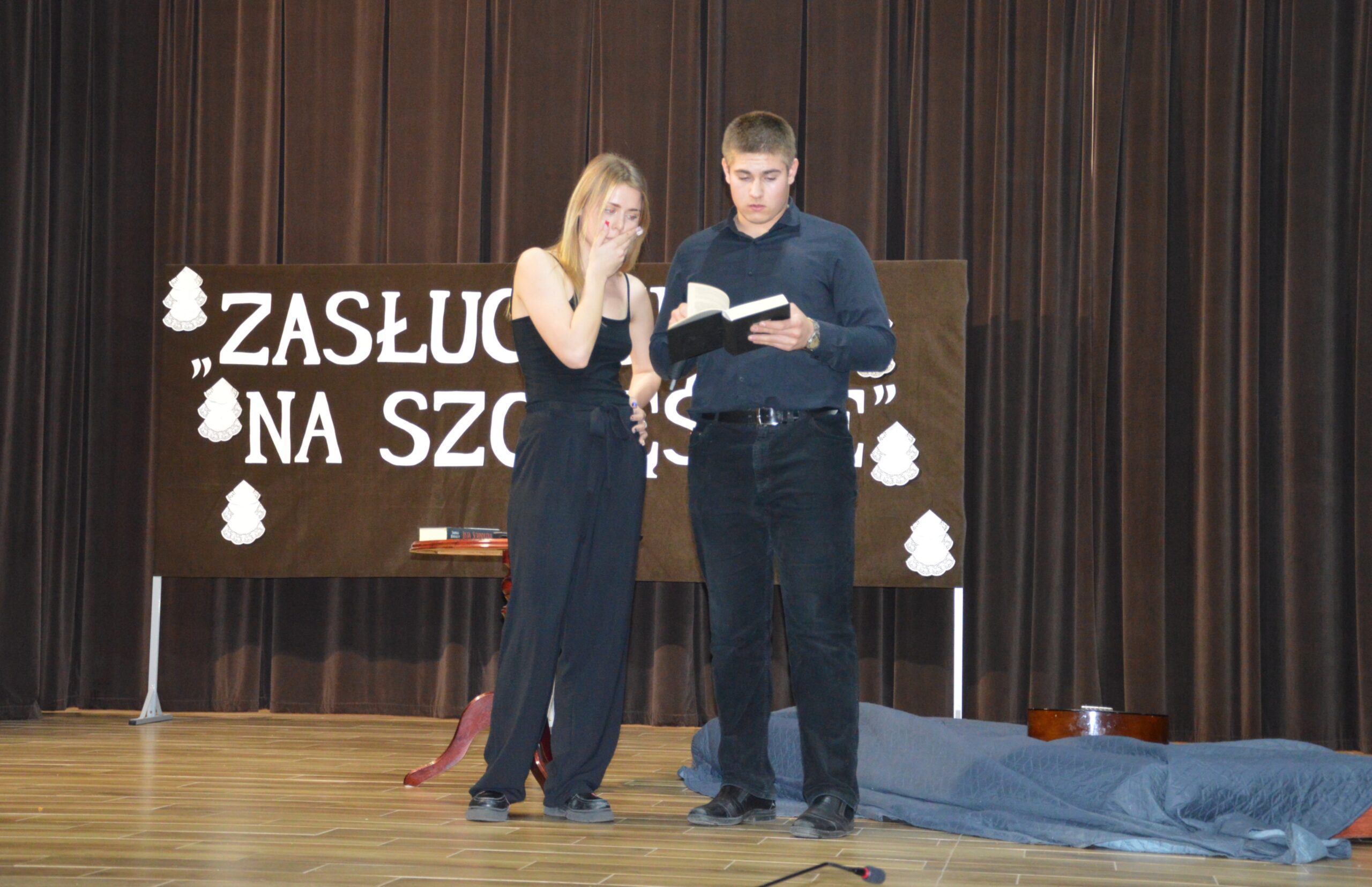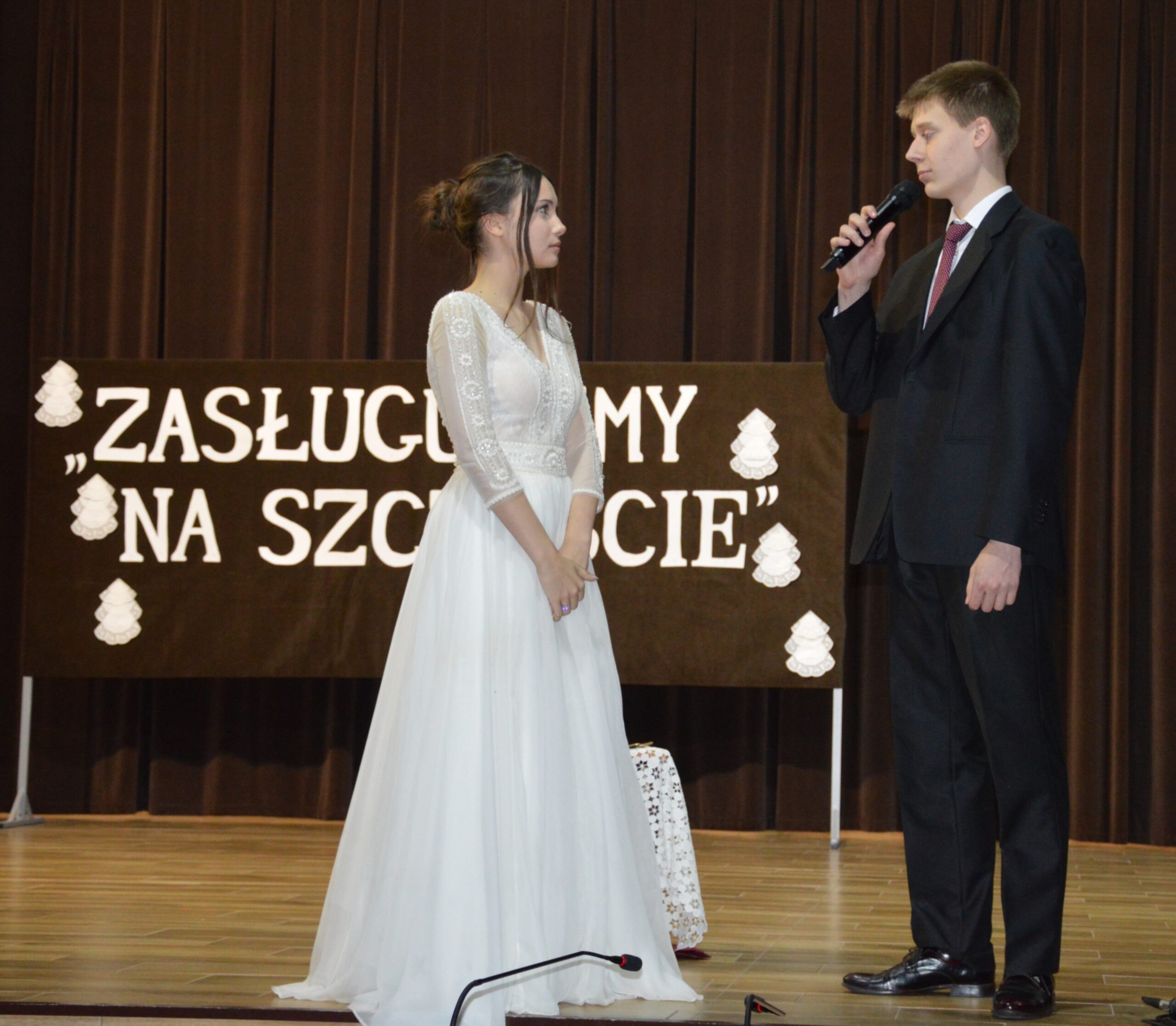 Część artystyczną szkolnej Wigilii, rozpoczęło przedstawienie w wykonaniu uczniów, przygotowane przez p. Dominikę Widanow-Świerszcz. Spektakl pt. ” Zasługujemy na szczęście”. Zgodnie z tytułem inscenizacja odwoływała się do fundamentalnej potrzeby prawdziwego szczęścia, na które zasługuje każdy z nas. Historia przedstawiała losy rodziny, która wbrew planom i marzeniom, pogubiła się, zapominając o wierze, tradycji, miłości. Dawniejsze – być, zastąpiło współczesne – mieć. Na szczęście dzięki mądrości i wrażliwości młodego pokolenia – córki i jej chłopaka – utracone wartości udało się wskrzesić i zbudować prawdziwe szczęście.