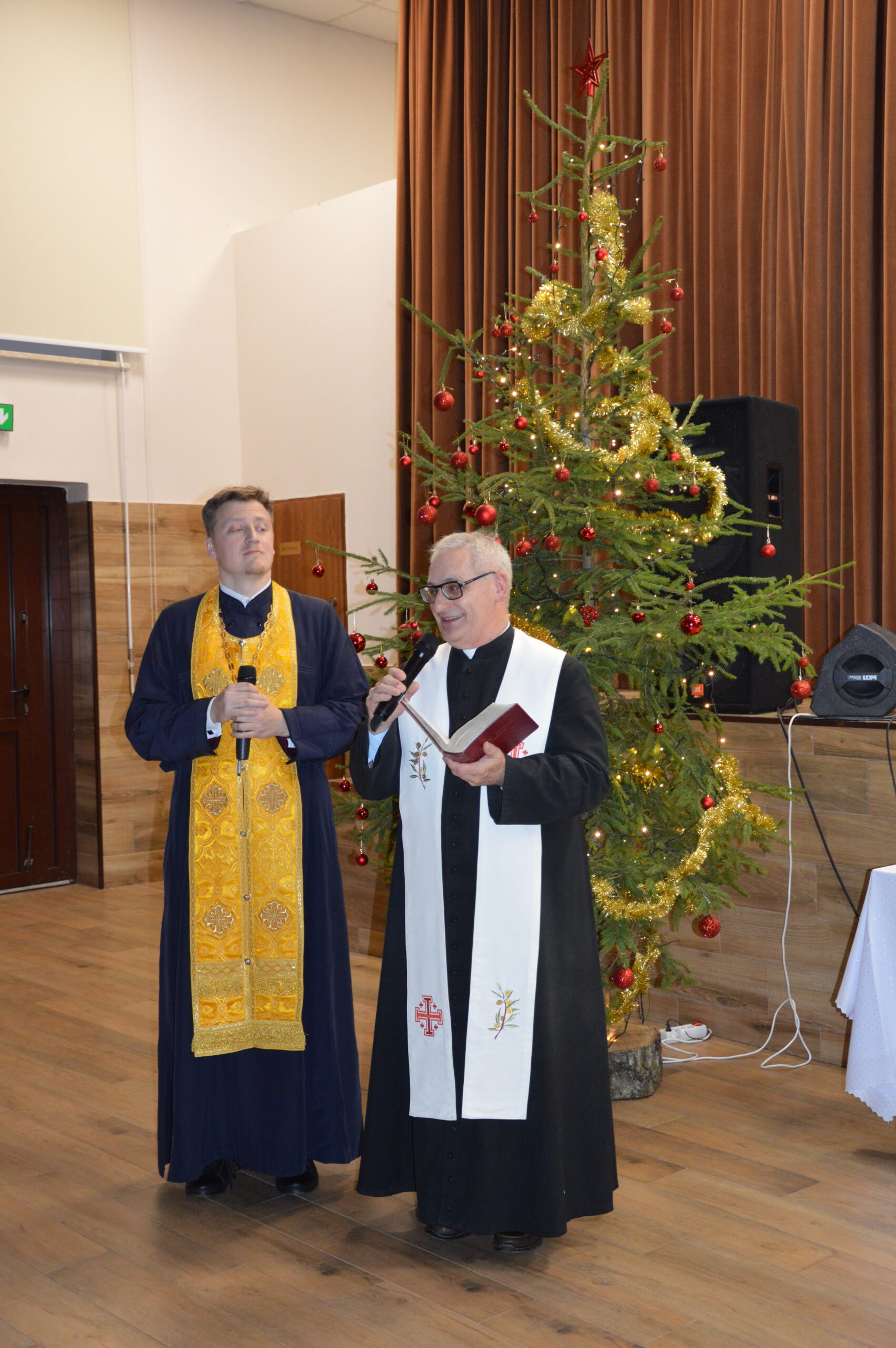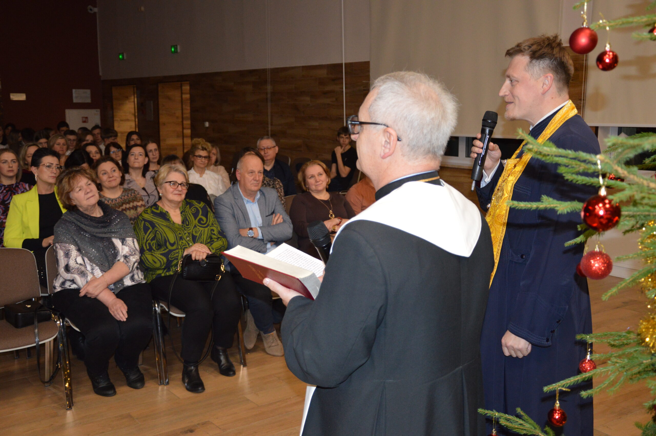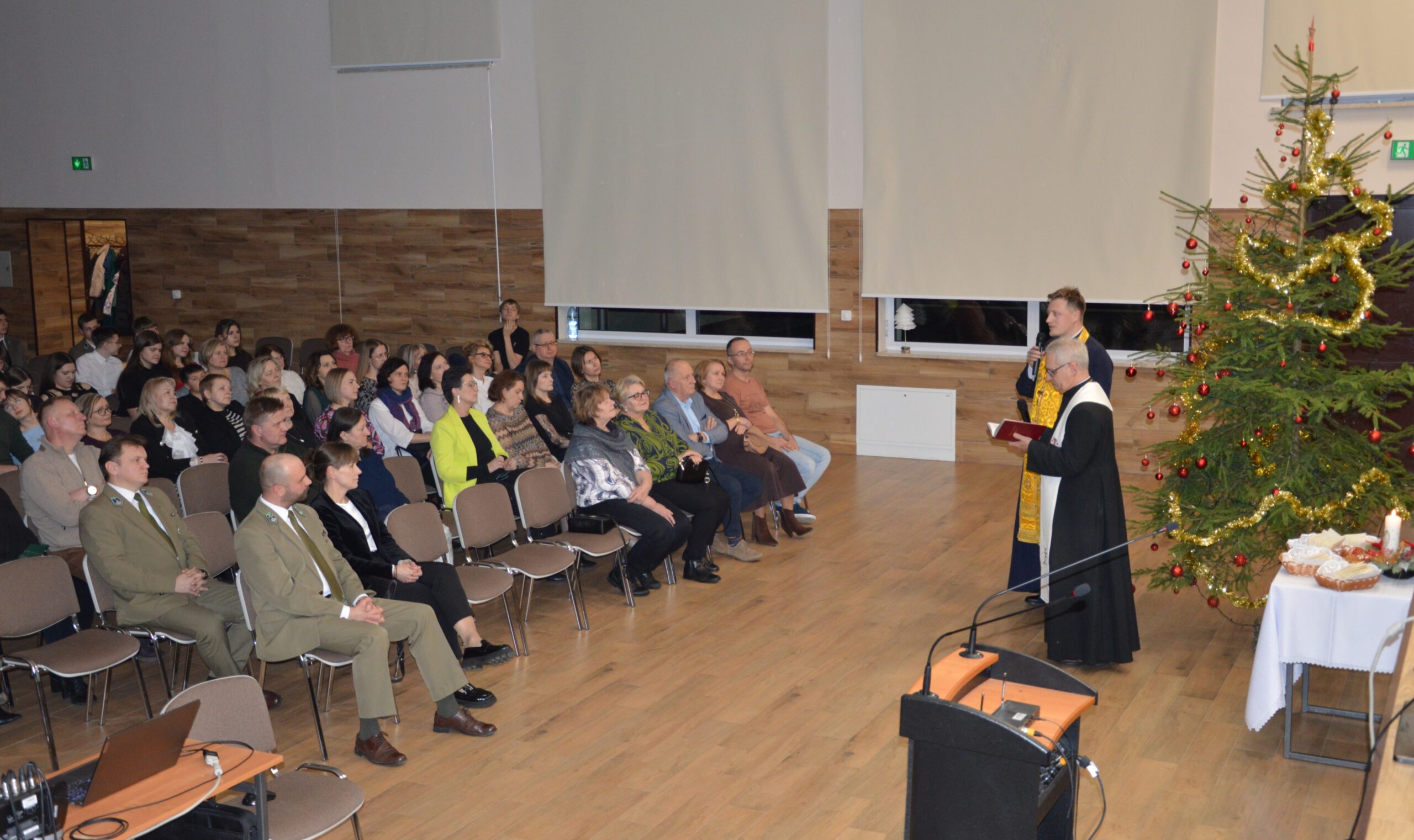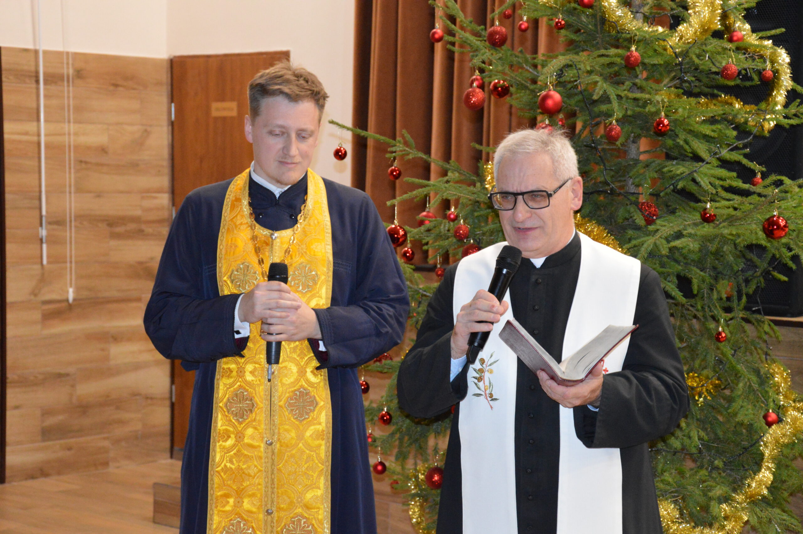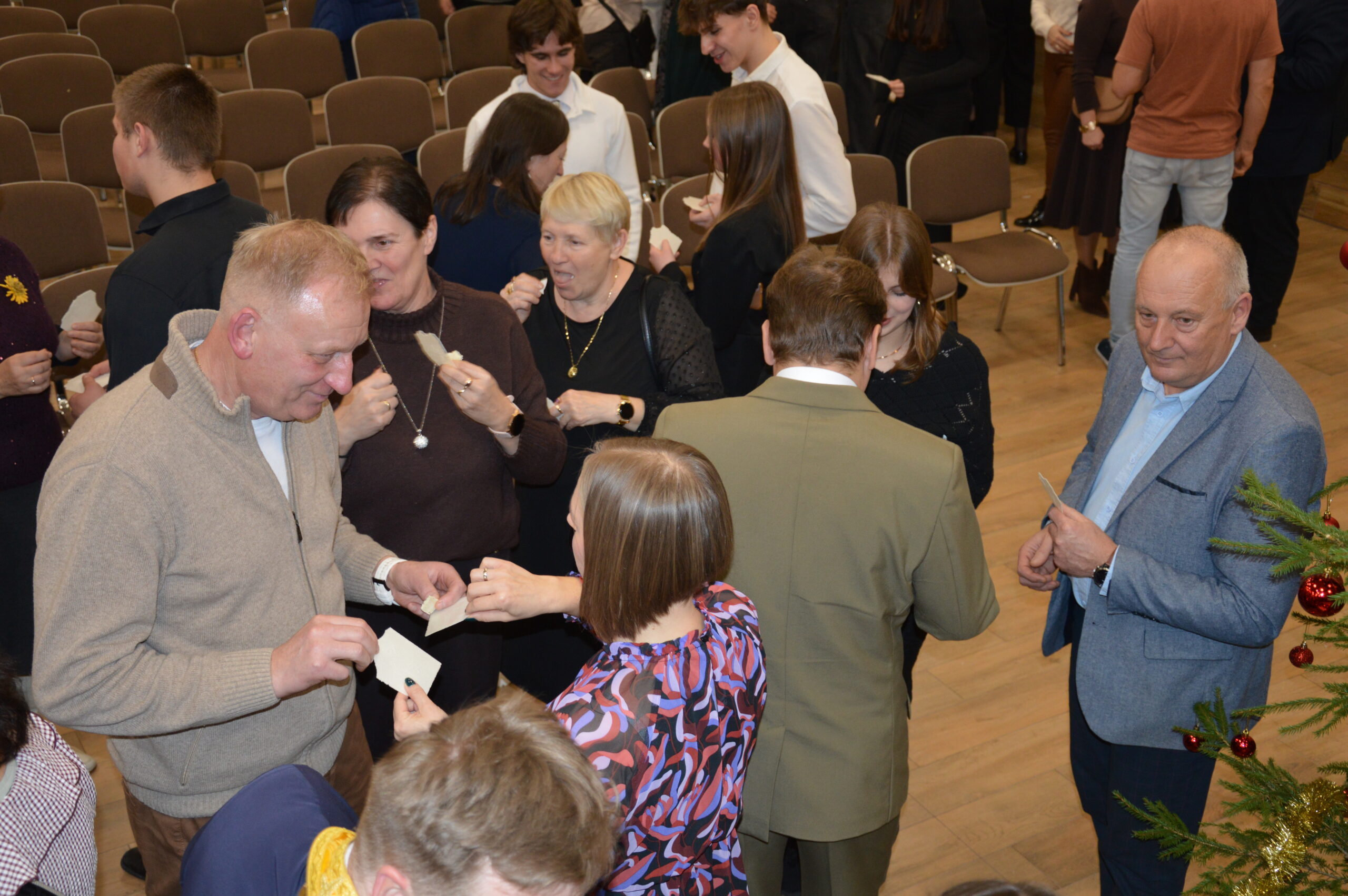 Po części artystycznej Pan Dyrektor, Mariusz Tokajuk podziękował za zaangażowanie w przygotowanie uroczystości oraz złożył życzenia wszystkim obecnym. Następnie głos zabrali księża – Bogdan Popławski oraz Tymoteusz Nazdryn, którzy odmówili modlitwy i złożyli świąteczne życzenia. Uczestnicy spotkania tradycyjnie podzielili się opłatkiem i prosforą – nie zabrakło ciepłych słów i serdecznych uścisków.