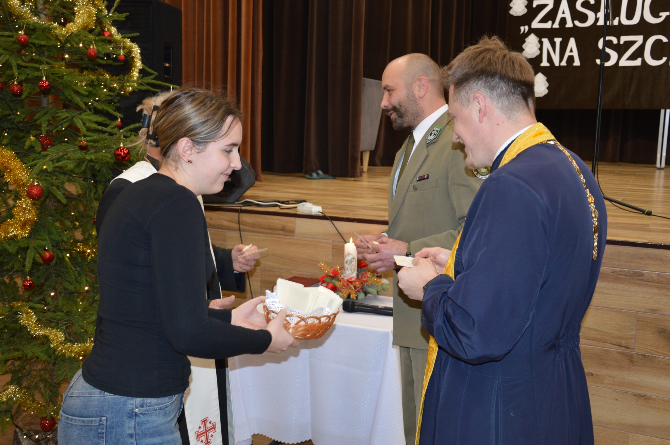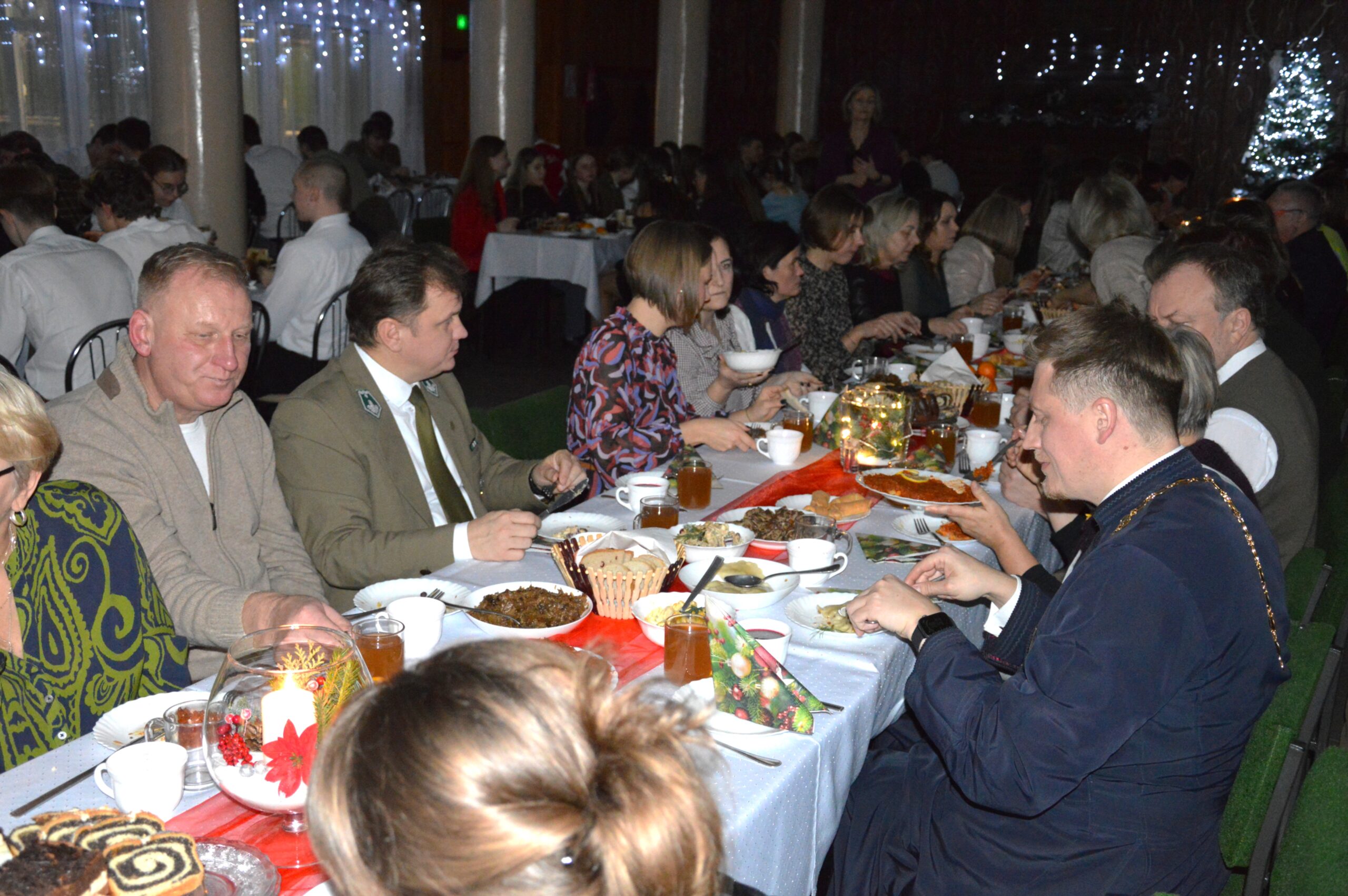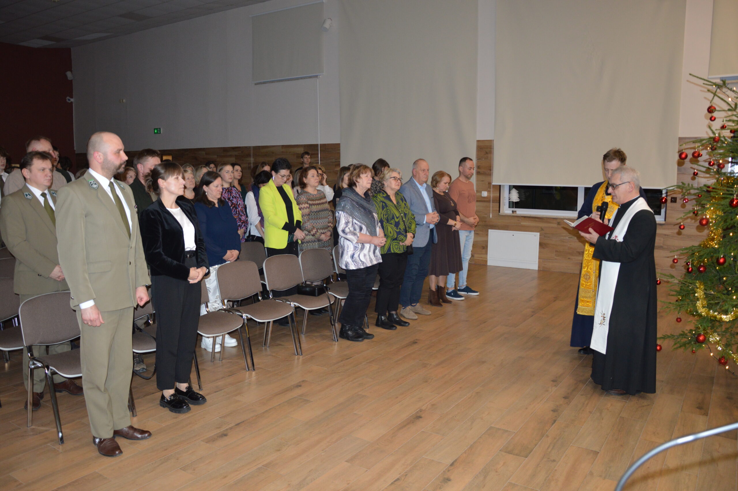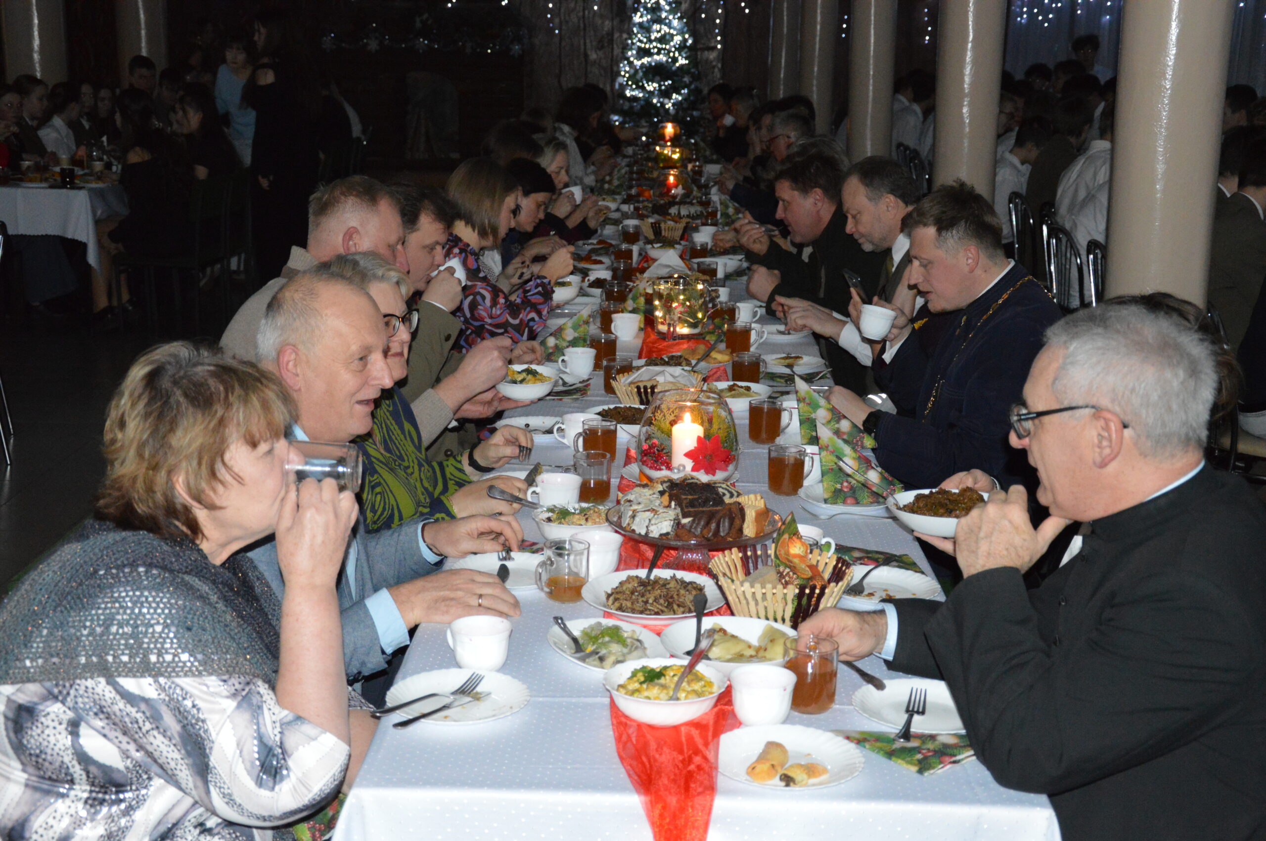 Po części artystycznej Pan Dyrektor, Mariusz Tokajuk podziękował za zaangażowanie w przygotowanie uroczystości oraz złożył życzenia wszystkim obecnym. Następnie głos zabrali księża – Bogdan Popławski oraz Tymoteusz Nazdryn, którzy odmówili modlitwy i złożyli świąteczne życzenia. Uczestnicy spotkania tradycyjnie podzielili się opłatkiem i prosforą – nie zabrakło ciepłych słów i serdecznych uścisków.