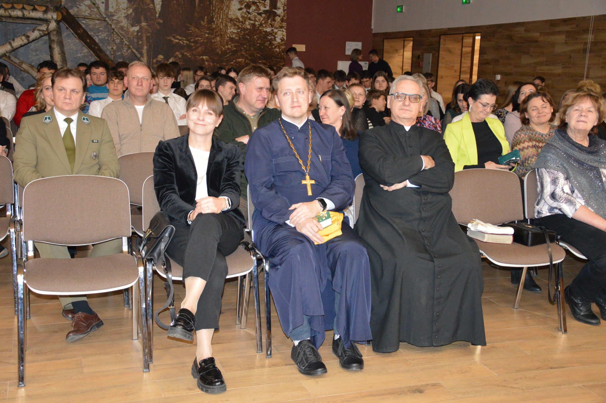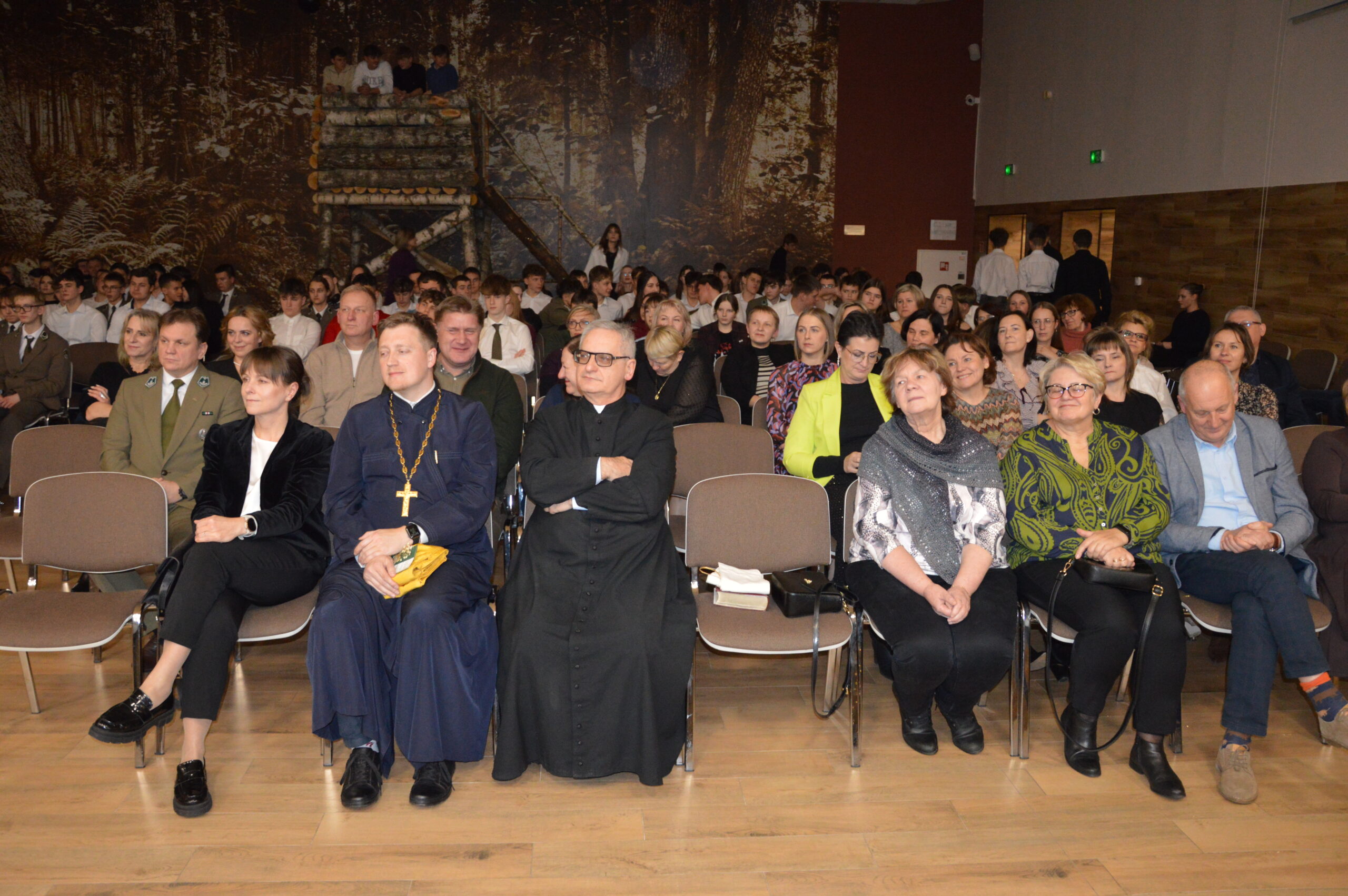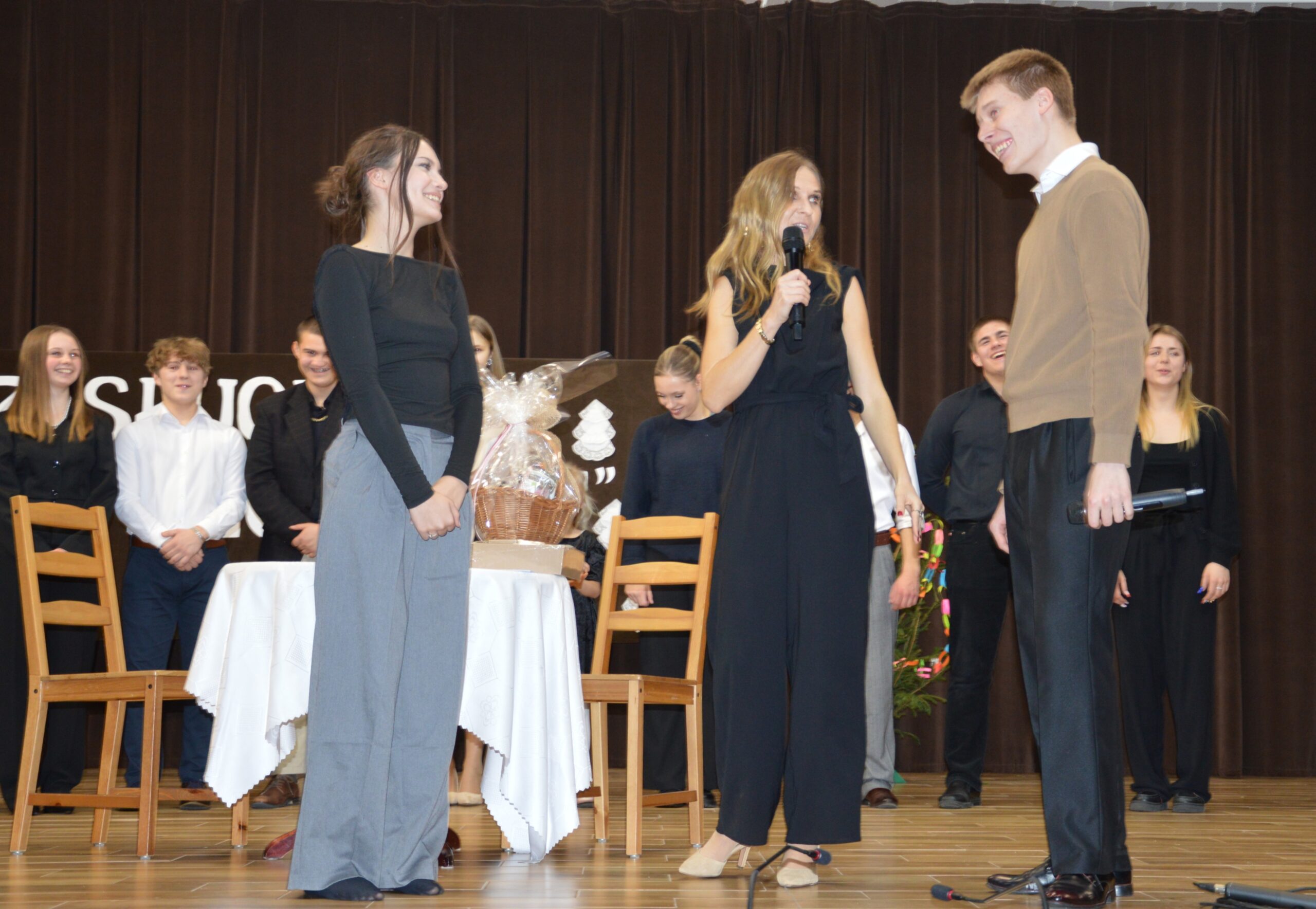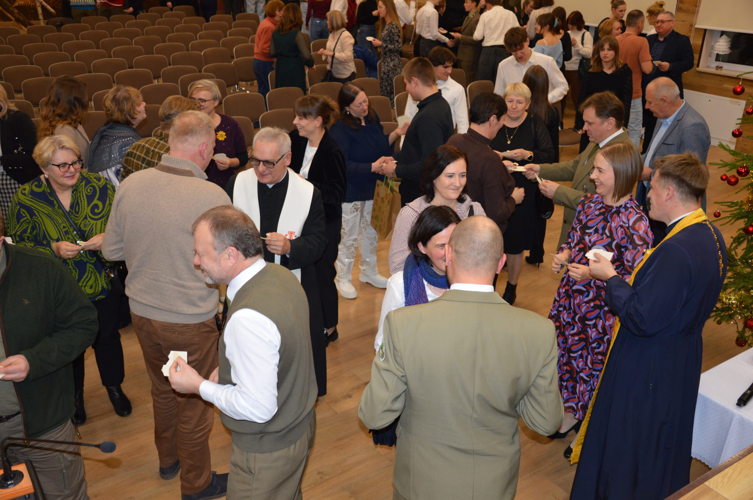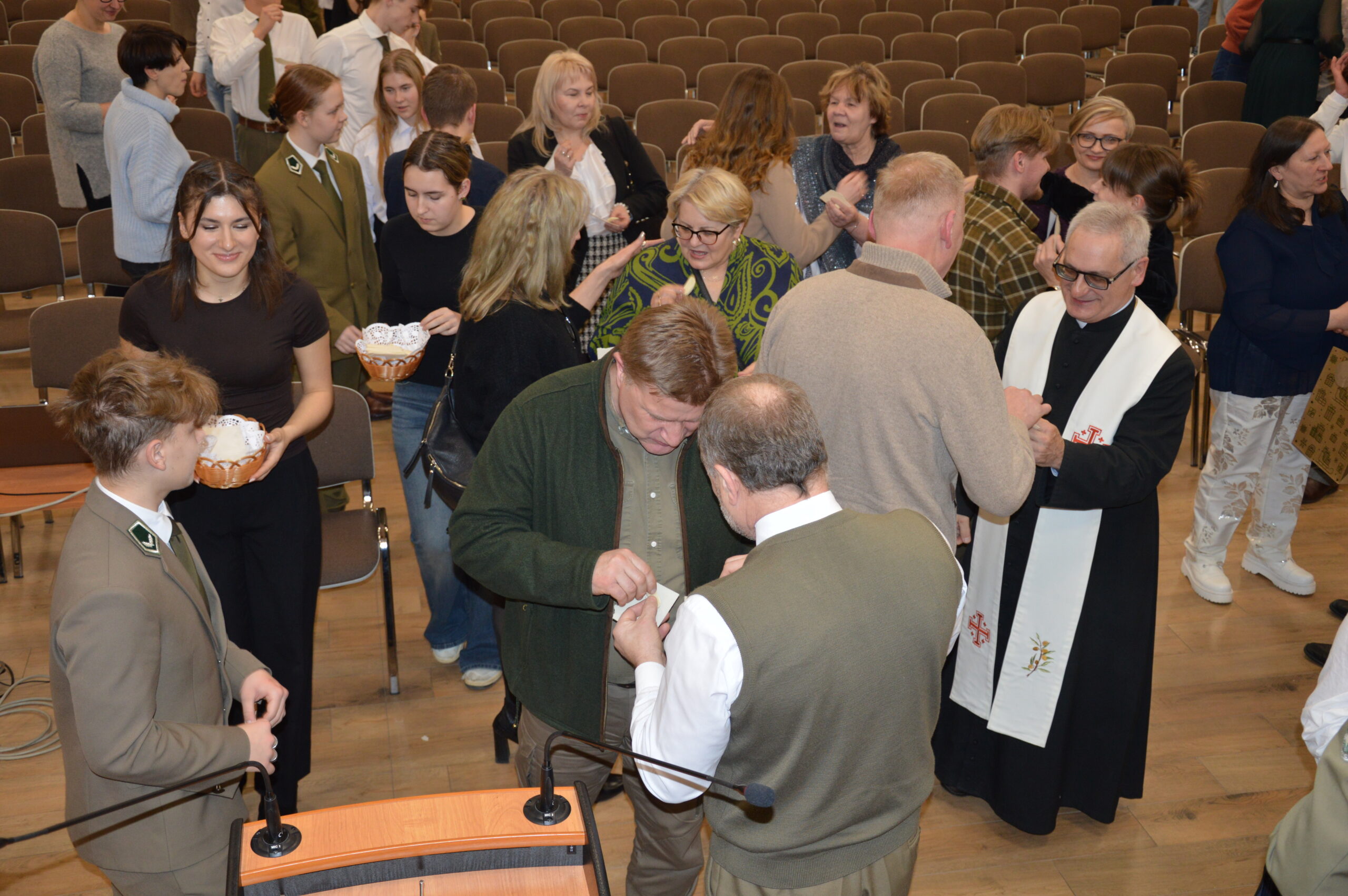 Po części artystycznej Pan Dyrektor, Mariusz Tokajuk podziękował za zaangażowanie w przygotowanie uroczystości oraz złożył życzenia wszystkim obecnym. Następnie głos zabrali księża – Bogdan Popławski oraz Tymoteusz Nazdryn, którzy odmówili modlitwy i złożyli świąteczne życzenia. Uczestnicy spotkania tradycyjnie podzielili się opłatkiem i prosforą – nie zabrakło ciepłych słów i serdecznych uścisków.