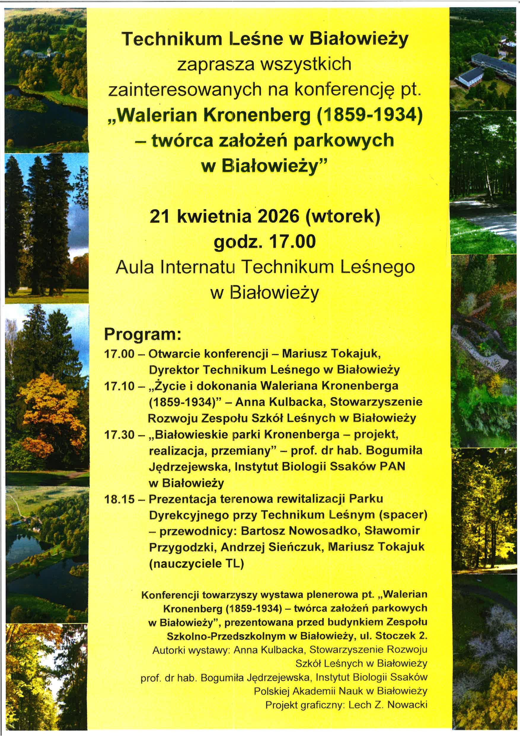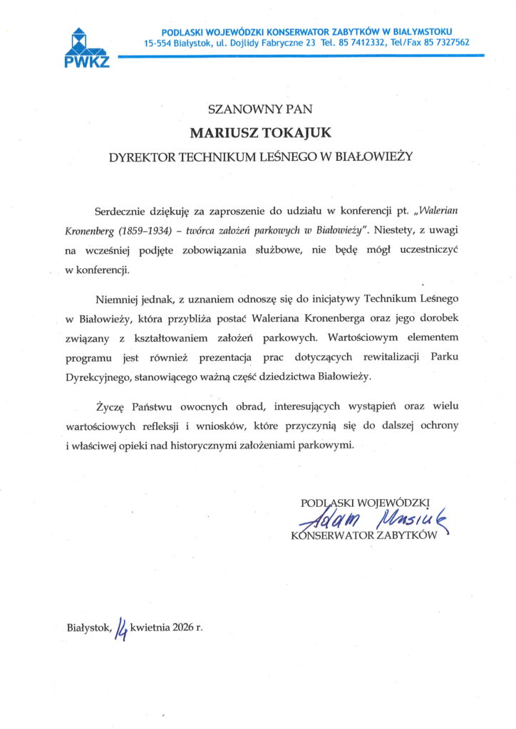 Technikum Leśne w Białowieży zaprasza wszystkich zainteresowanych na konferencję pt. „Walerian Kronenberg twórca założeń parkowych w Białowieży”. 21 kwietnia 2026 (wtorek) godz. 17.00 Aula Internatu Technikum Leśnego w Białowieży
